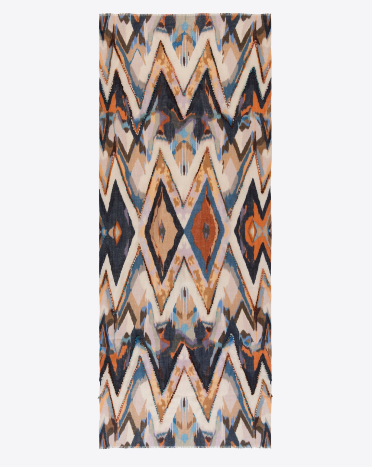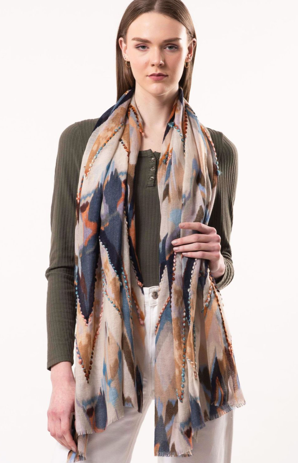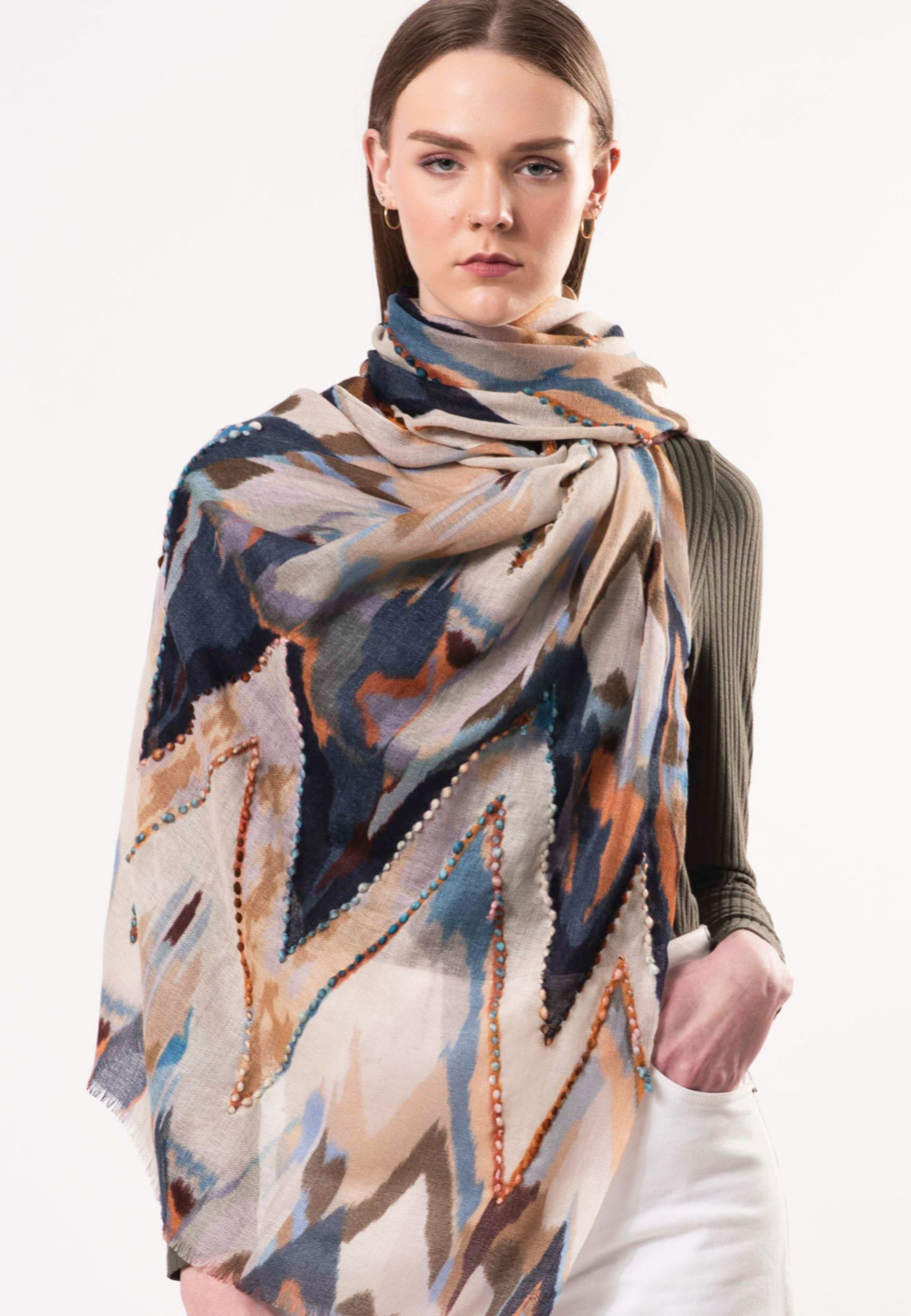 The SIENNA scarf is a stunning fusion of art and texture, featuring a painterly chevron digital print enhanced with intricate handmade cord embroidery for added depth and sophistication. Crafted from 100% soft wool, this oblong scarf is designed for effortless draping and finished with delicate small fringes.