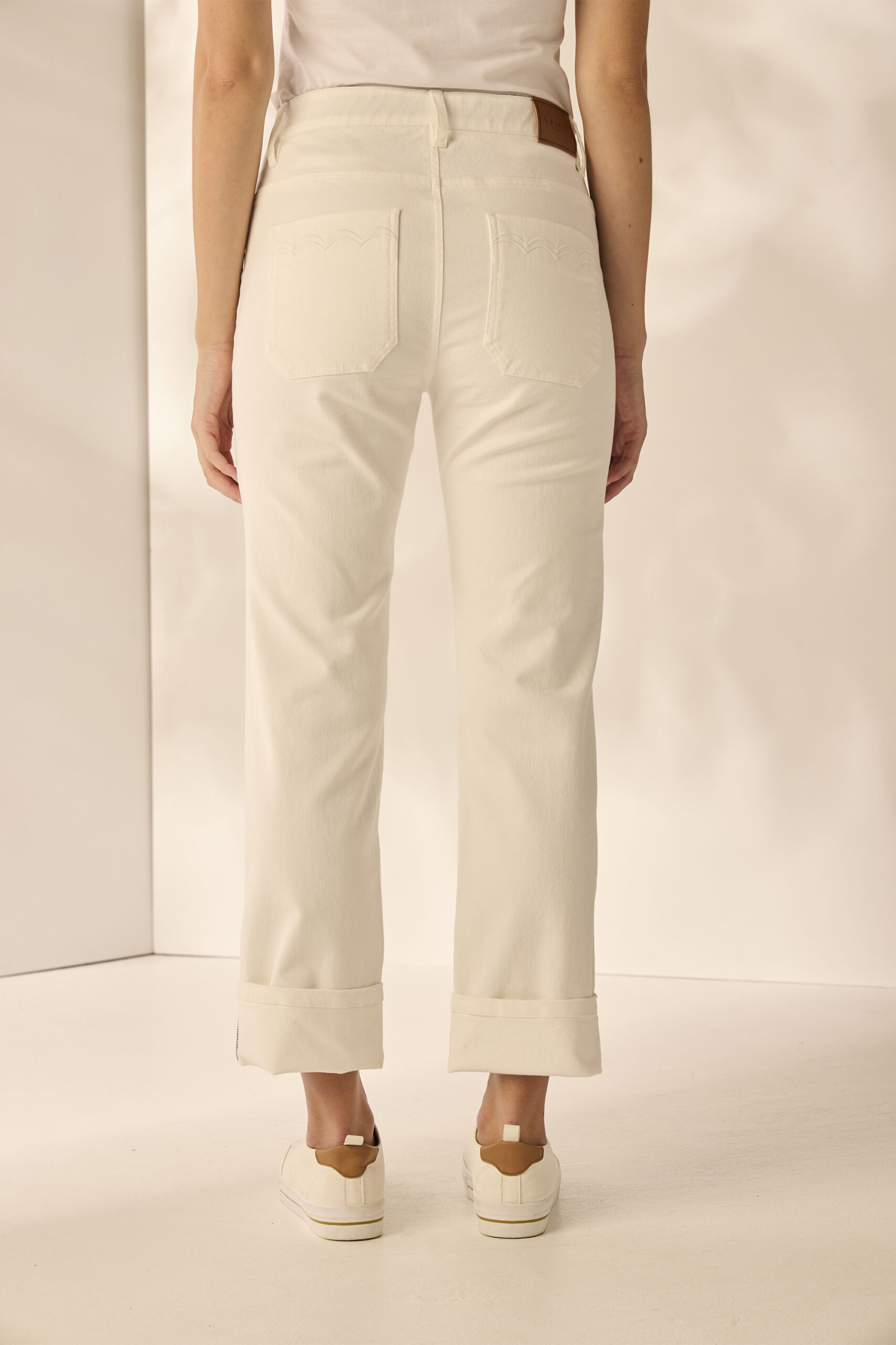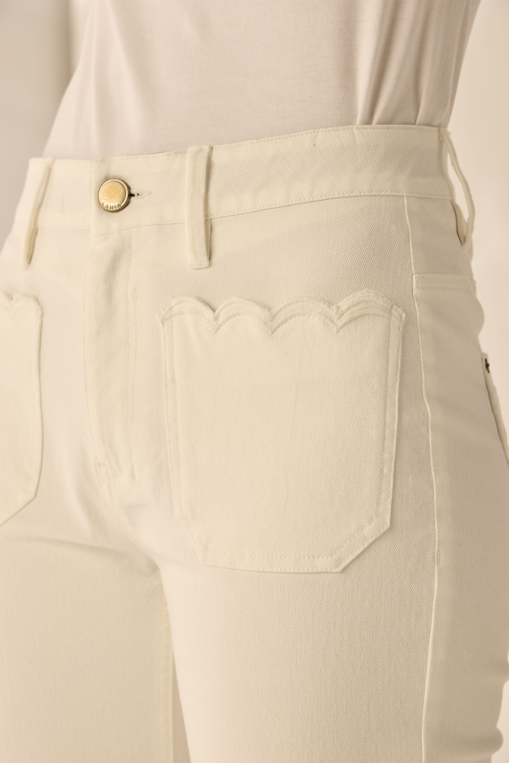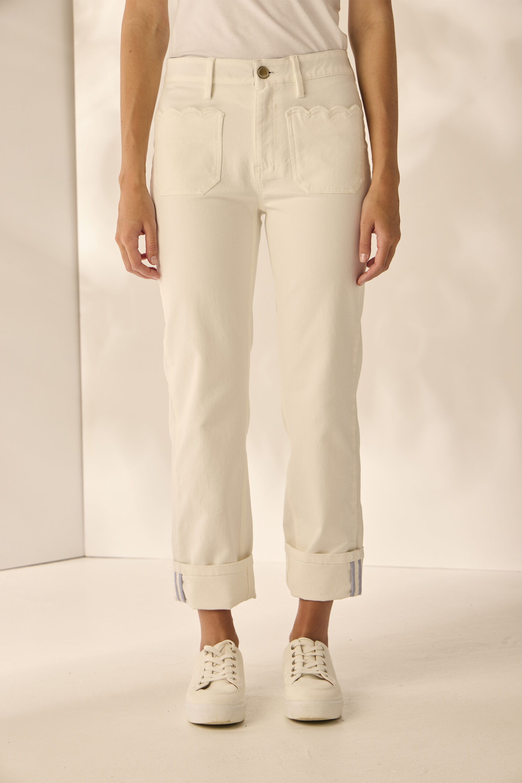 Step into style with the Chloe Jean, offering a mid-rise straight leg fit and modern  deep front patch pockets. Embroidery scallop edging on the front patch pocket adds a touch of uniqueness to the style and making these jeans a must have for the spring wardrobe.