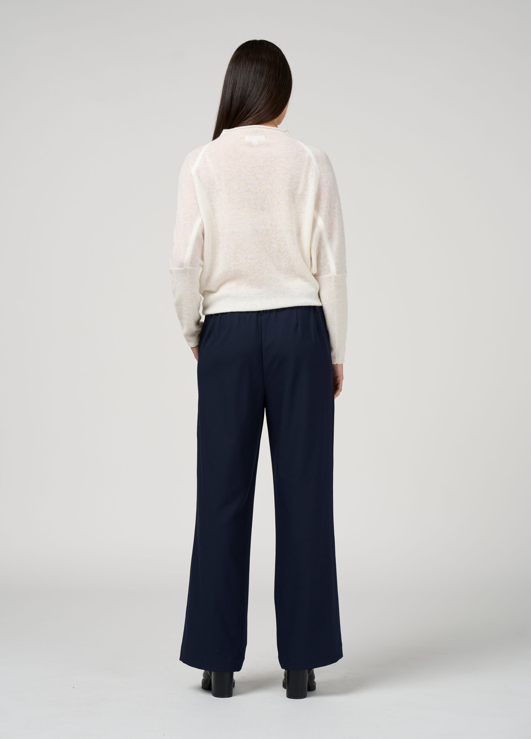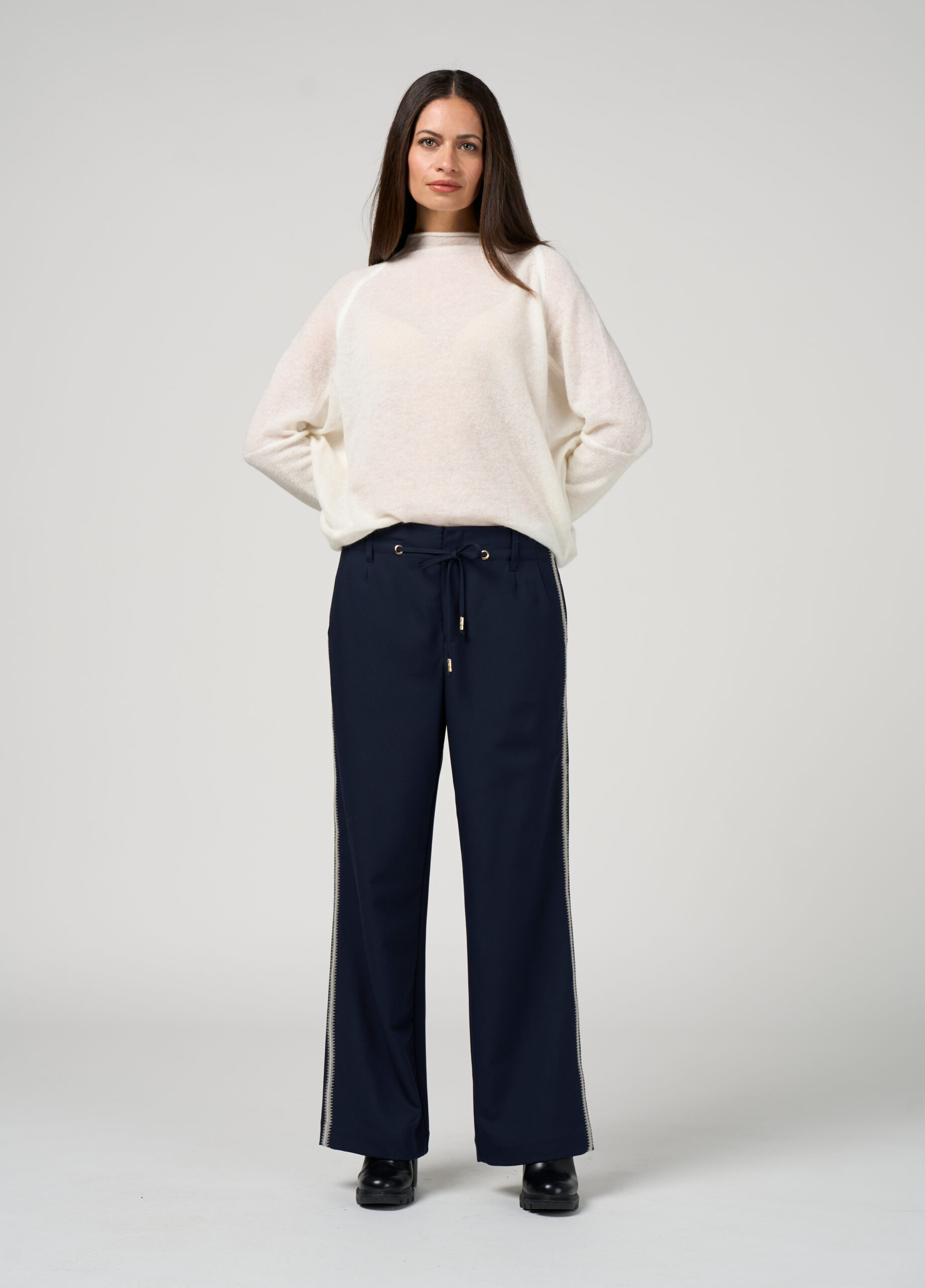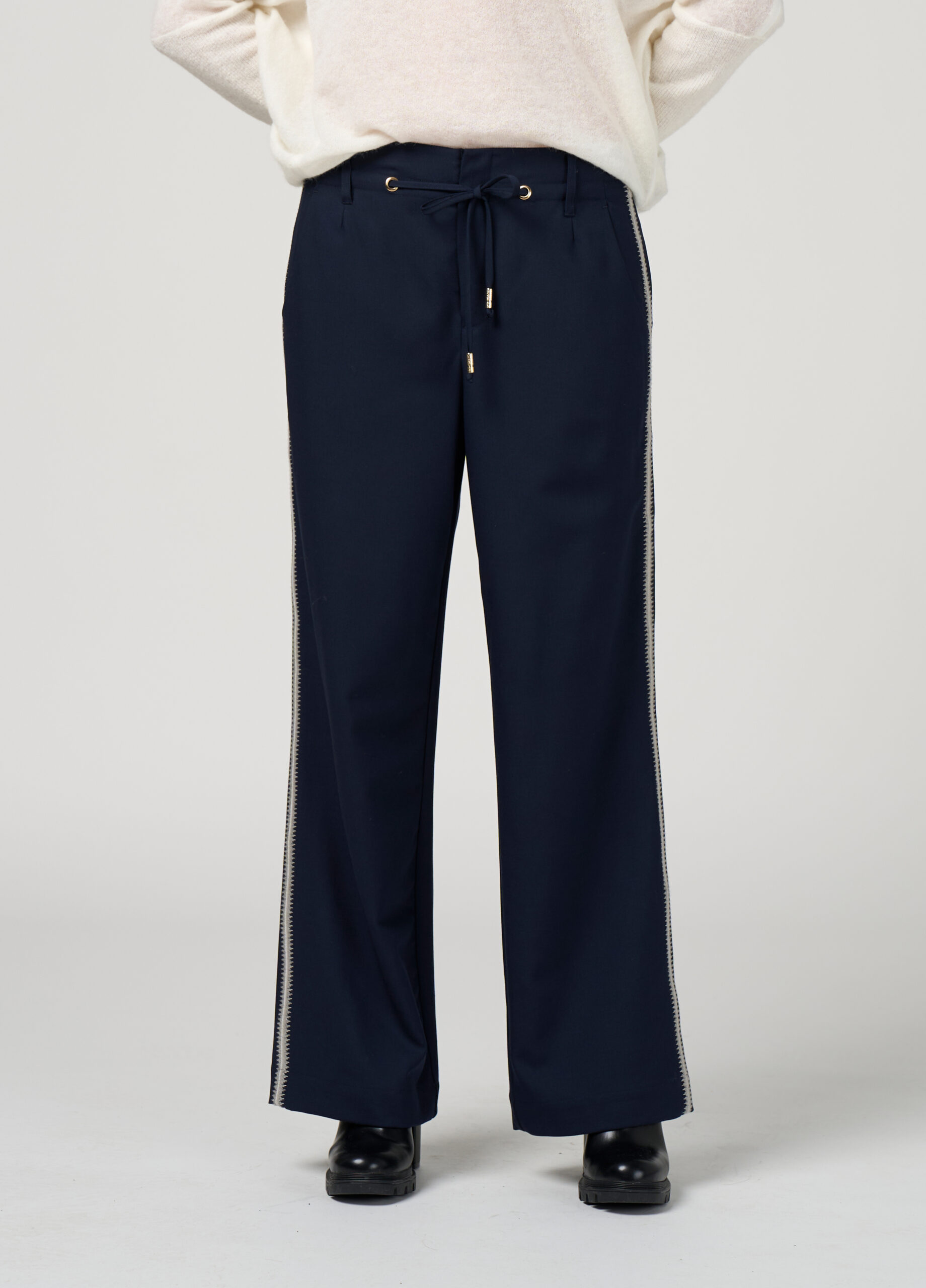 Mid-rise straight-leg pant with a drawcord waist, elasticated back, and a functional fly. Bold contrast embroidery detail along the side seams, with functional front side pockets.