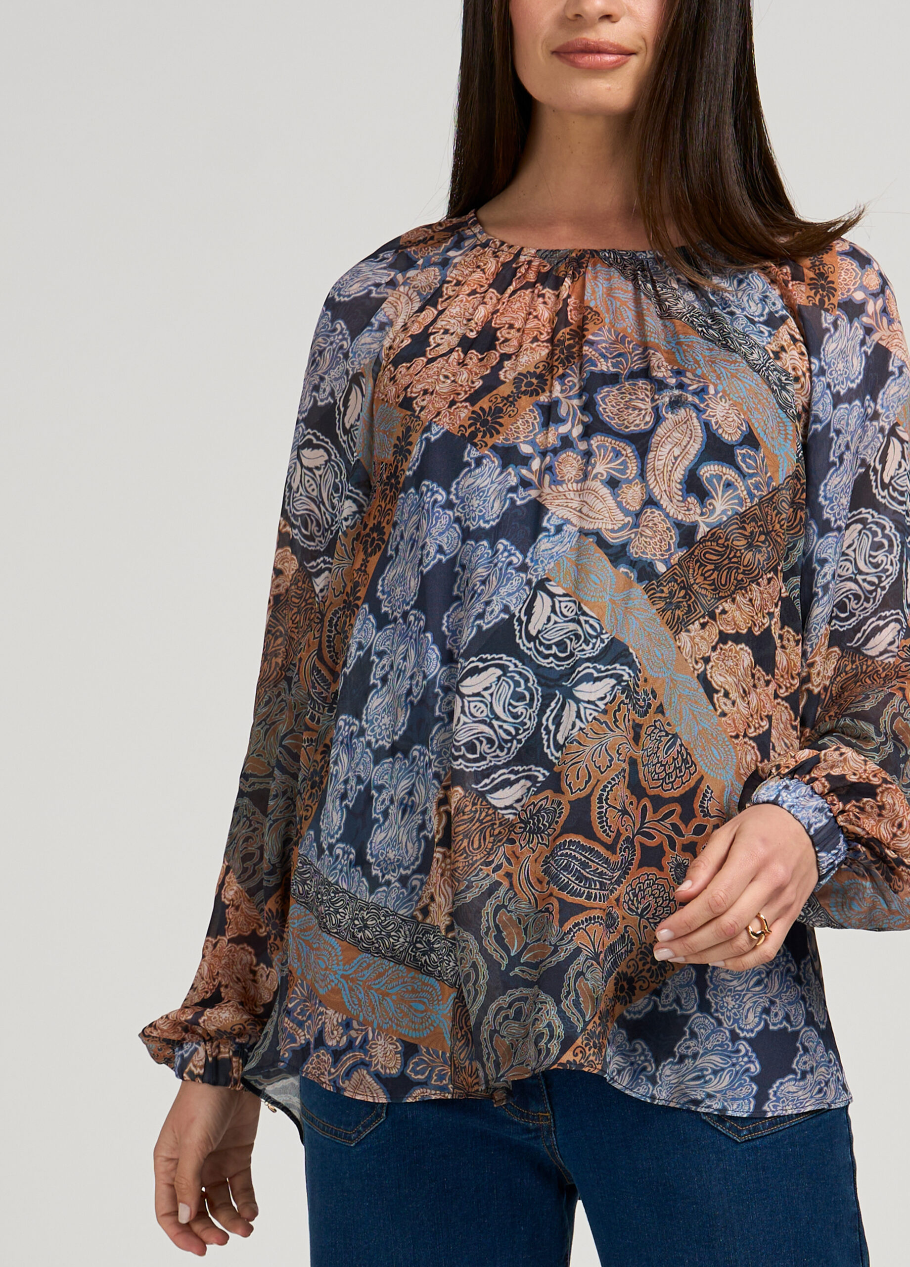 Floaty sheer blouse featuring a round neckline, with blouson sleeves with elastic cuffs. Comes with colour-matched A-line cami.