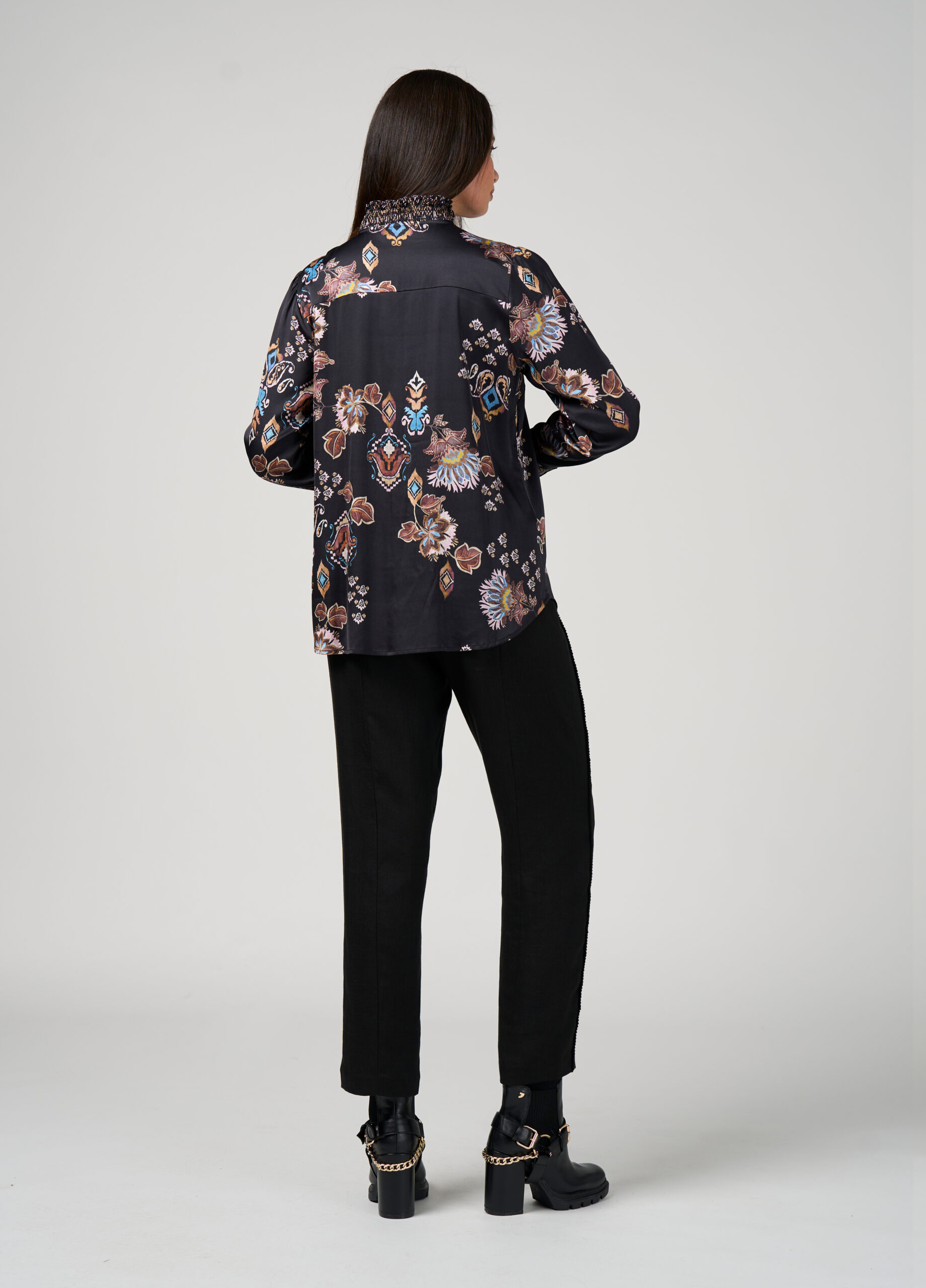Sateen blouse with a shirred collar, and a button and loop front placket, with buttoned cuffs. Featuring contrast print detailing on the collar, placket, and cuffs.