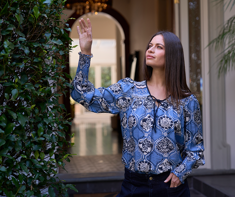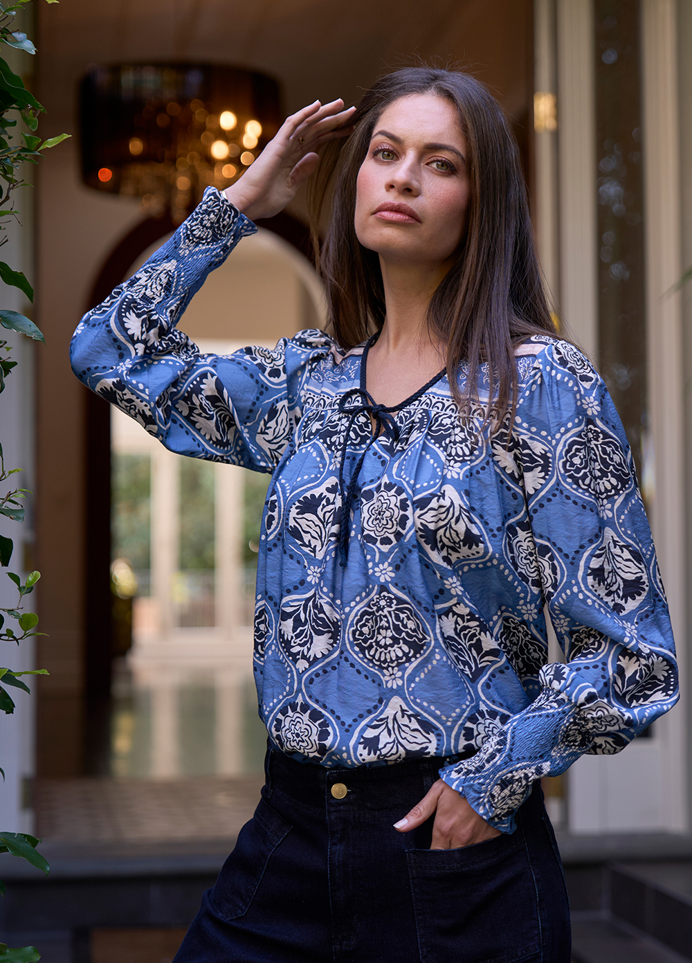 This floaty V–neck blouse features an indigo cotton trim at the neckline that extends into a soft tie for a touch of artisanal detail. Finished with deep shirred elastic cuffs, it brings effortless elegance and ease to everyday dressing.
