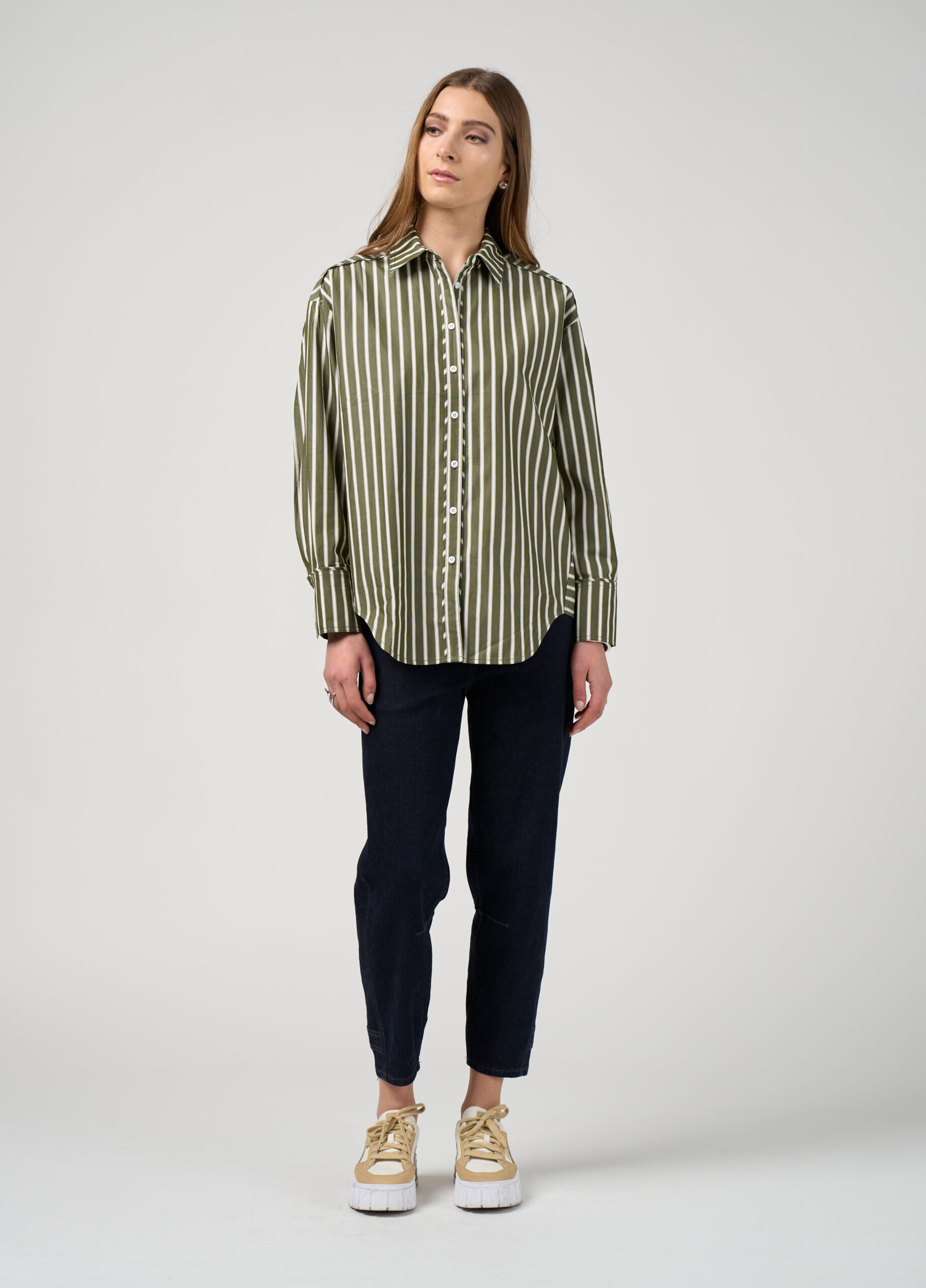 Relaxed fitting stripe shirt with forward side seams, and deep cuffs, featuring a stitched down tuck across the back with flat piping detailing.