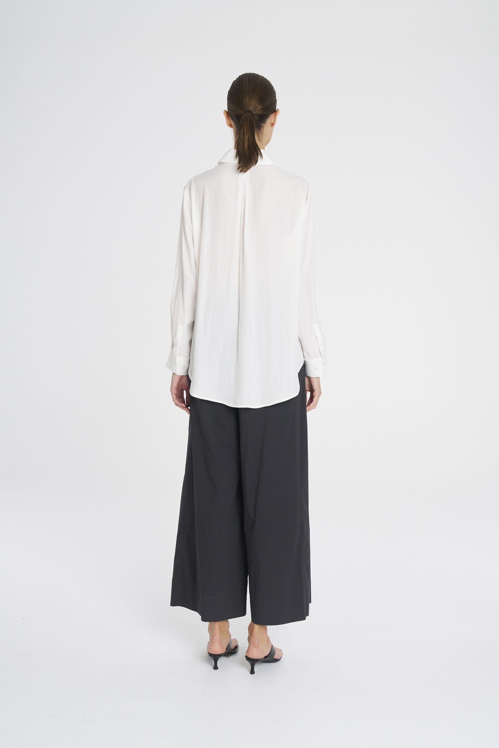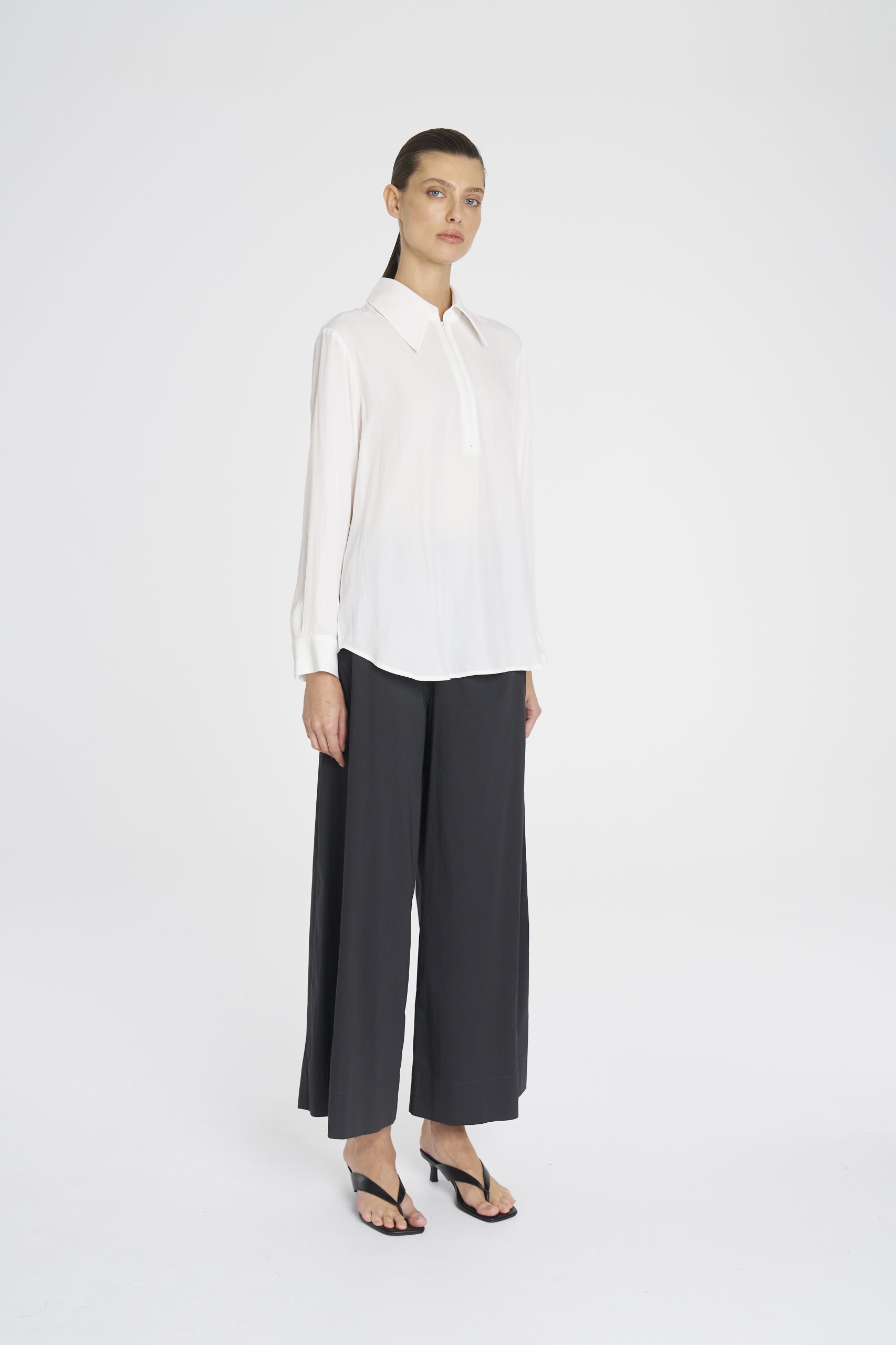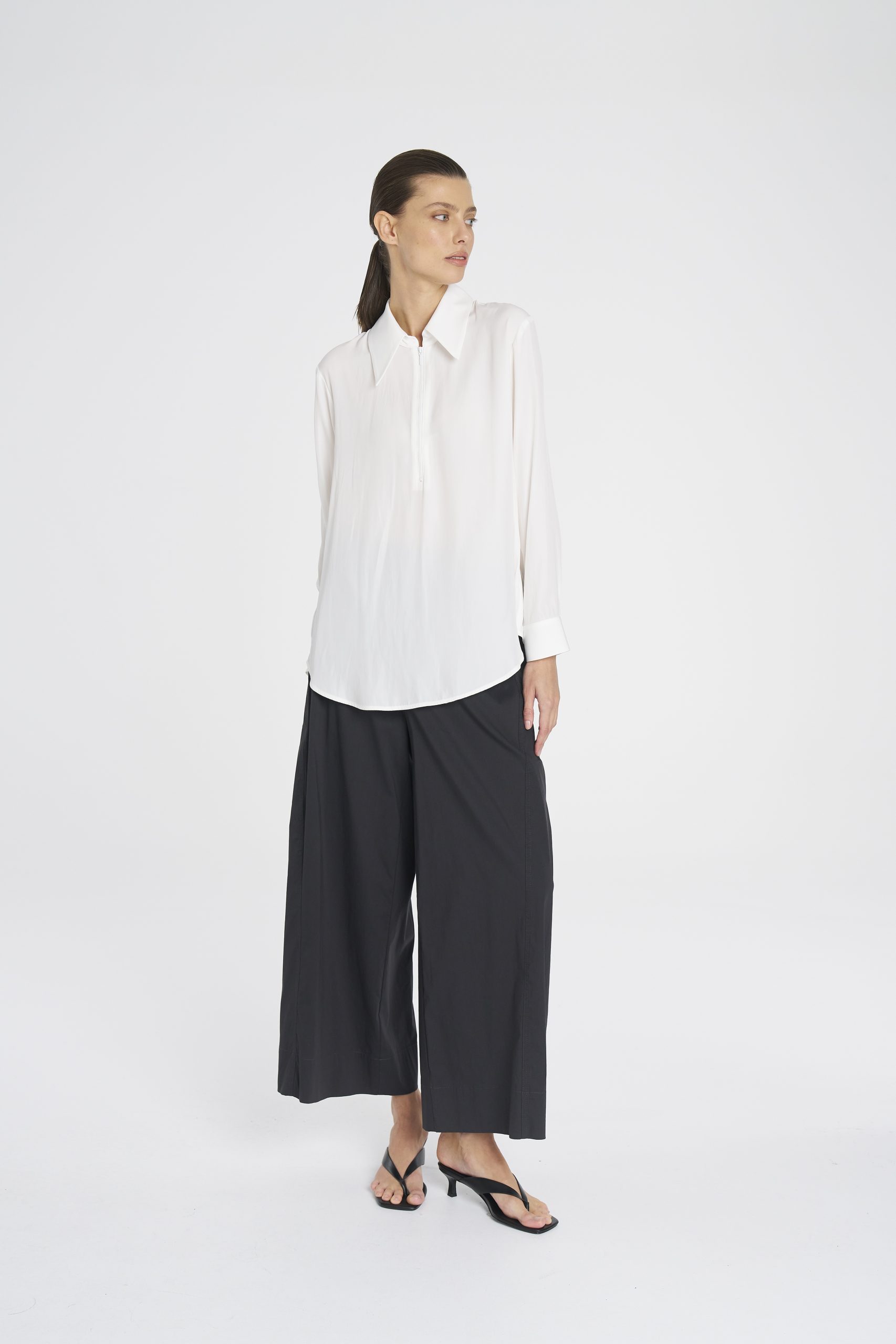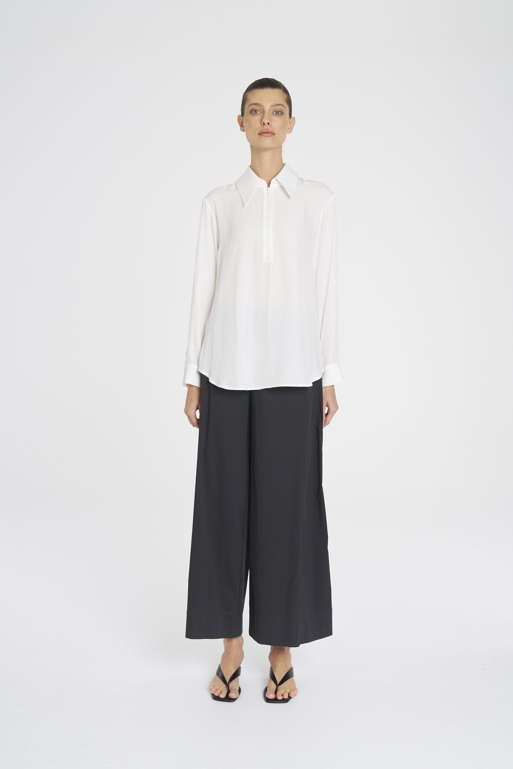 Crafted from Mela Purdie’s signature Mache fabric, this lightweight woven has a smooth, softly lustrous finish with an airy feel that moves beautifully with the body. The crisp peak collar and zip neckline add a contemporary edge, while the relaxed fit and curved hem offer flattering ease and coverage. It’s a perfect wardrobe builder for autumn — polished enough for work, easy enough for everyday wear.