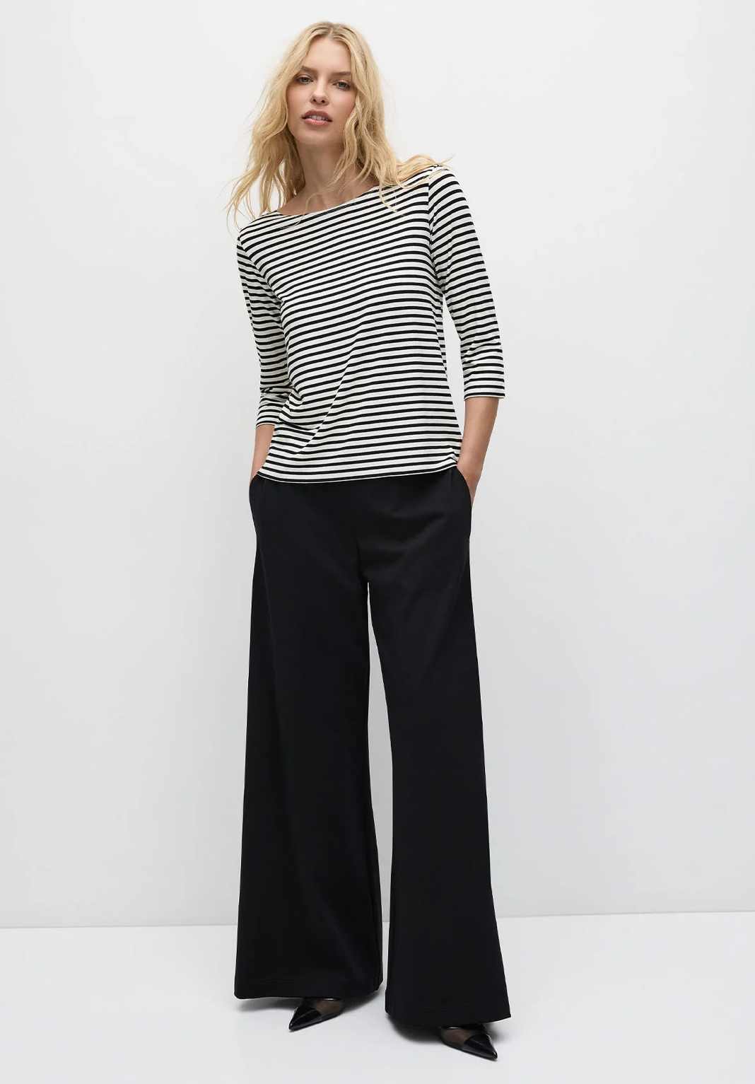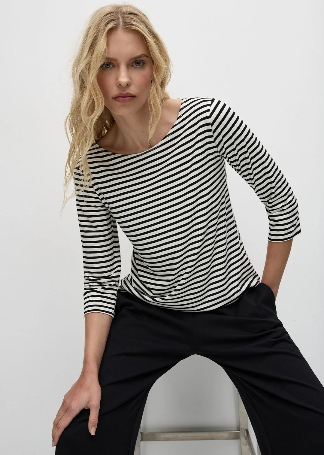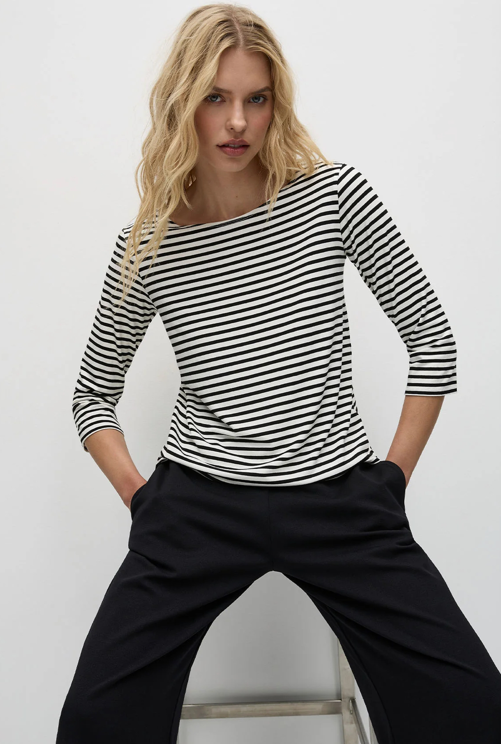 The Straw Stripe Jersey Relaxed Boatneck from Mela Purdie features a boat neckline with a ¾ length sleeve and a relaxed fit that falls to the hip. This is a must have essential for every wardrobe, offering optimal comfort and stretch. Crafted from a mid-weight knit jersey fabrication in the timeless Straw Stripe