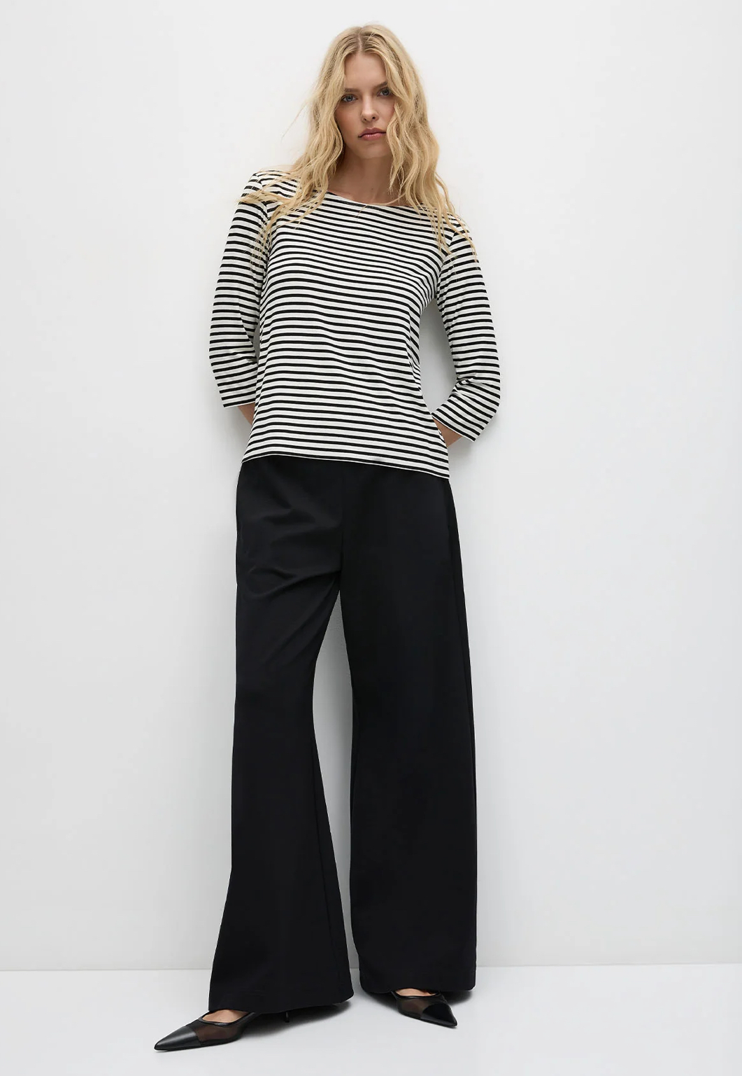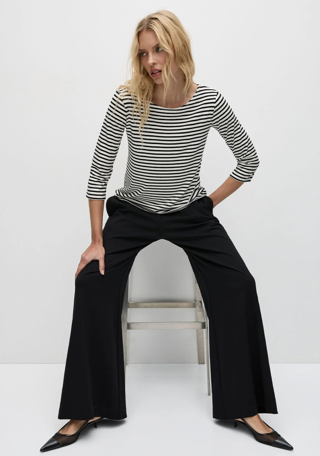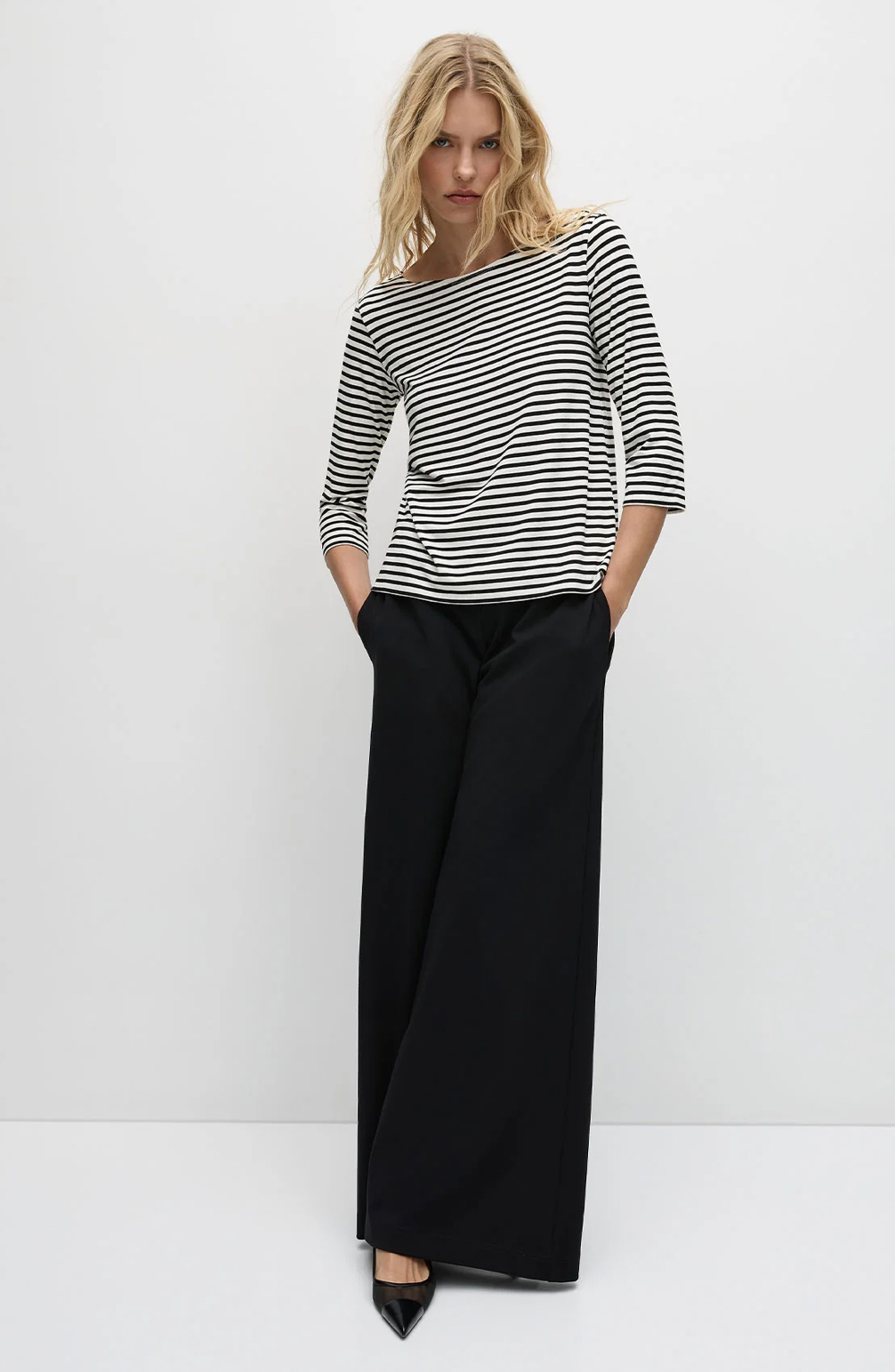 The Straw Stripe Jersey Relaxed Boatneck from Mela Purdie features a boat neckline with a ¾ length sleeve and a relaxed fit that falls to the hip. This is a must have essential for every wardrobe, offering optimal comfort and stretch. Crafted from a mid-weight knit jersey fabrication in the timeless Straw Stripe
