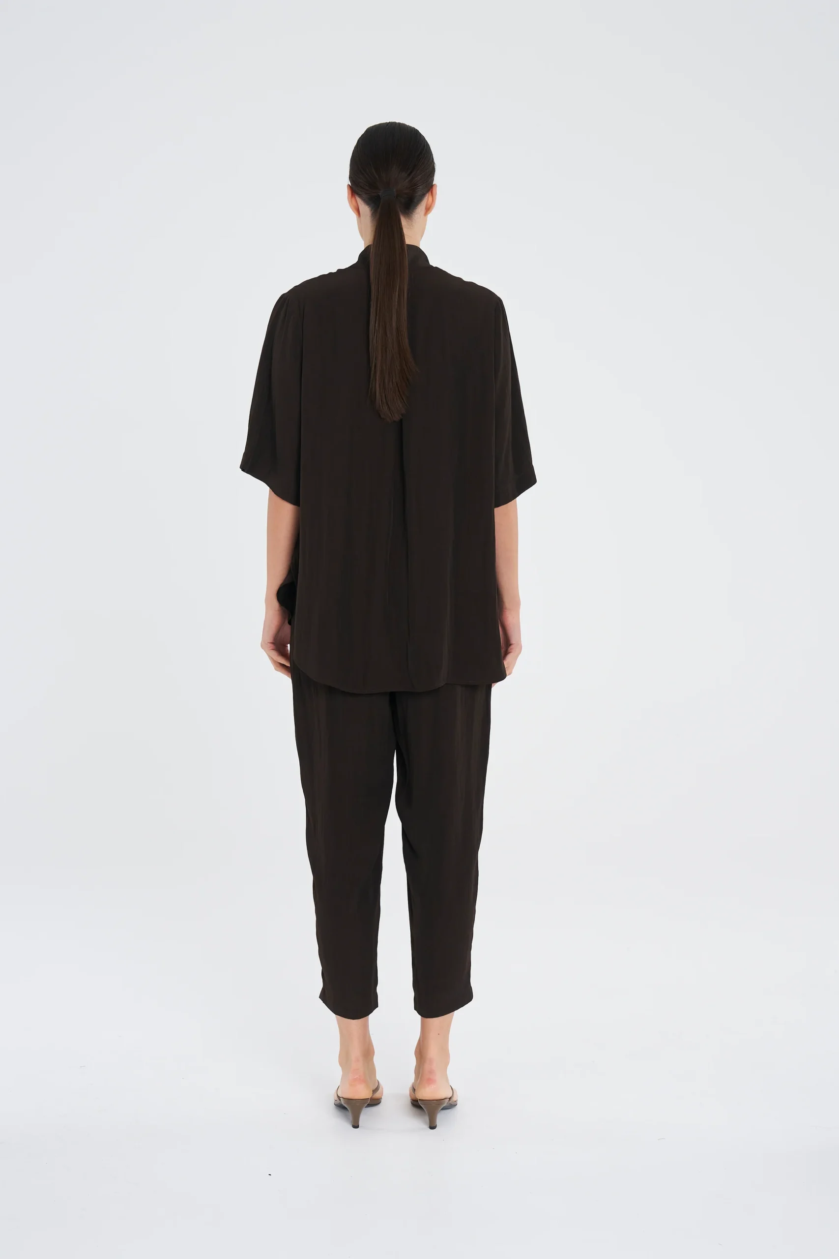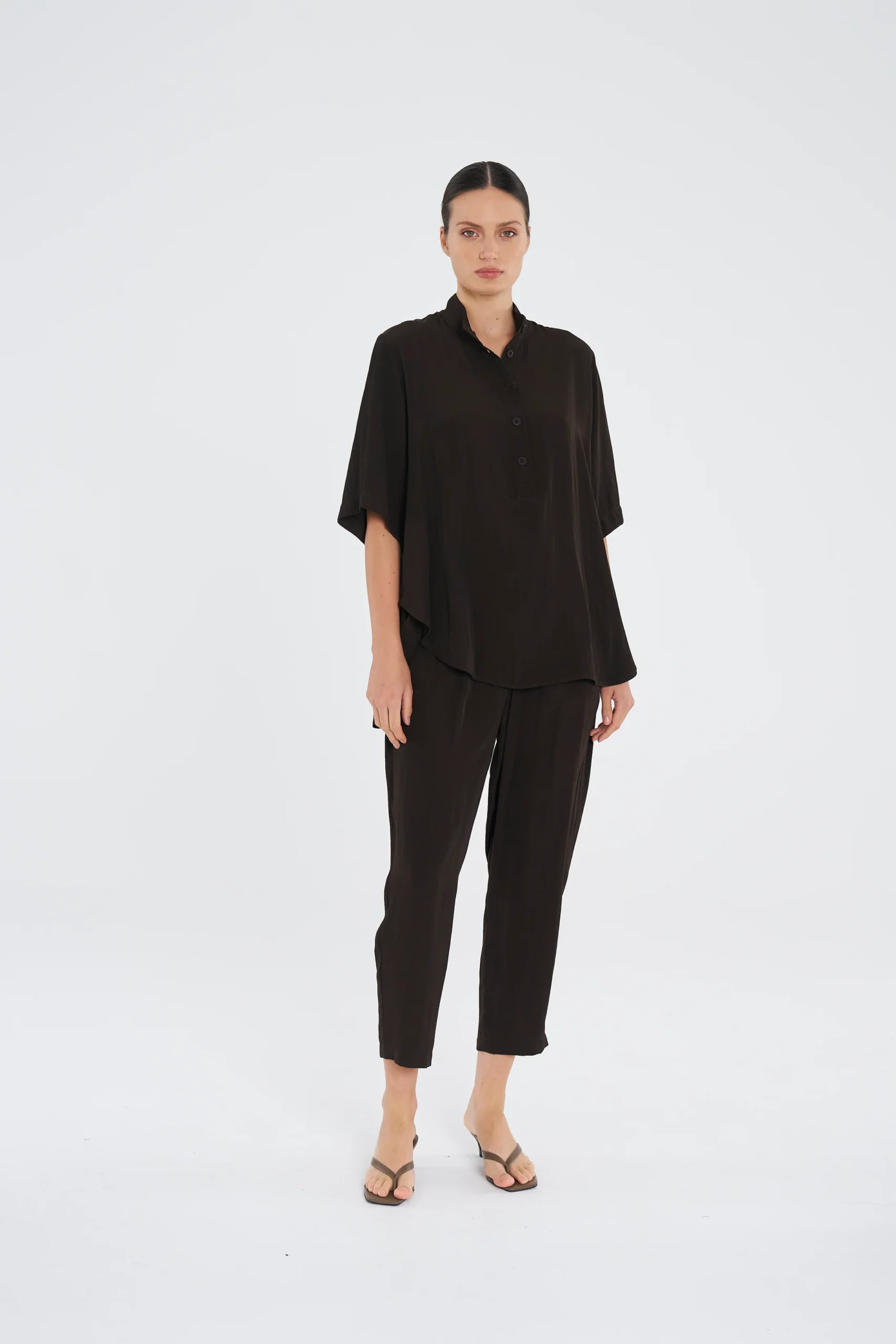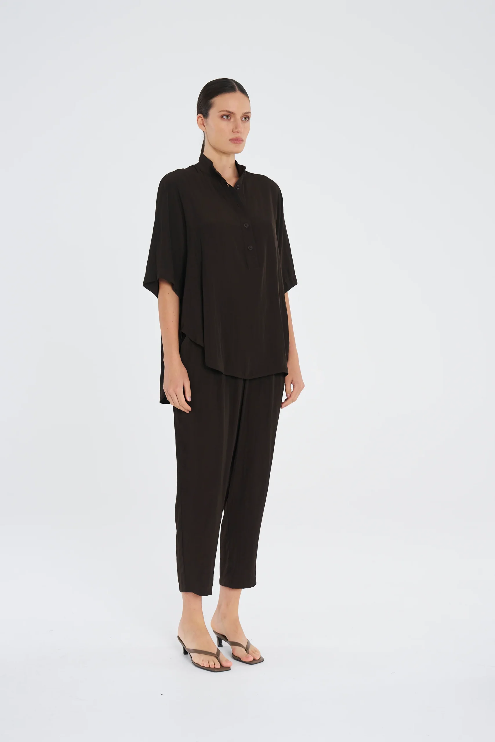 Crafted from Mela Purdie’s classic Mache, a fine Denier technical weave with an airflow finish. The Swish Tab Plaza is a longline top, featuring a button front closure and funnel neckline. this is an effortless piece that can easily be dressed up or down.