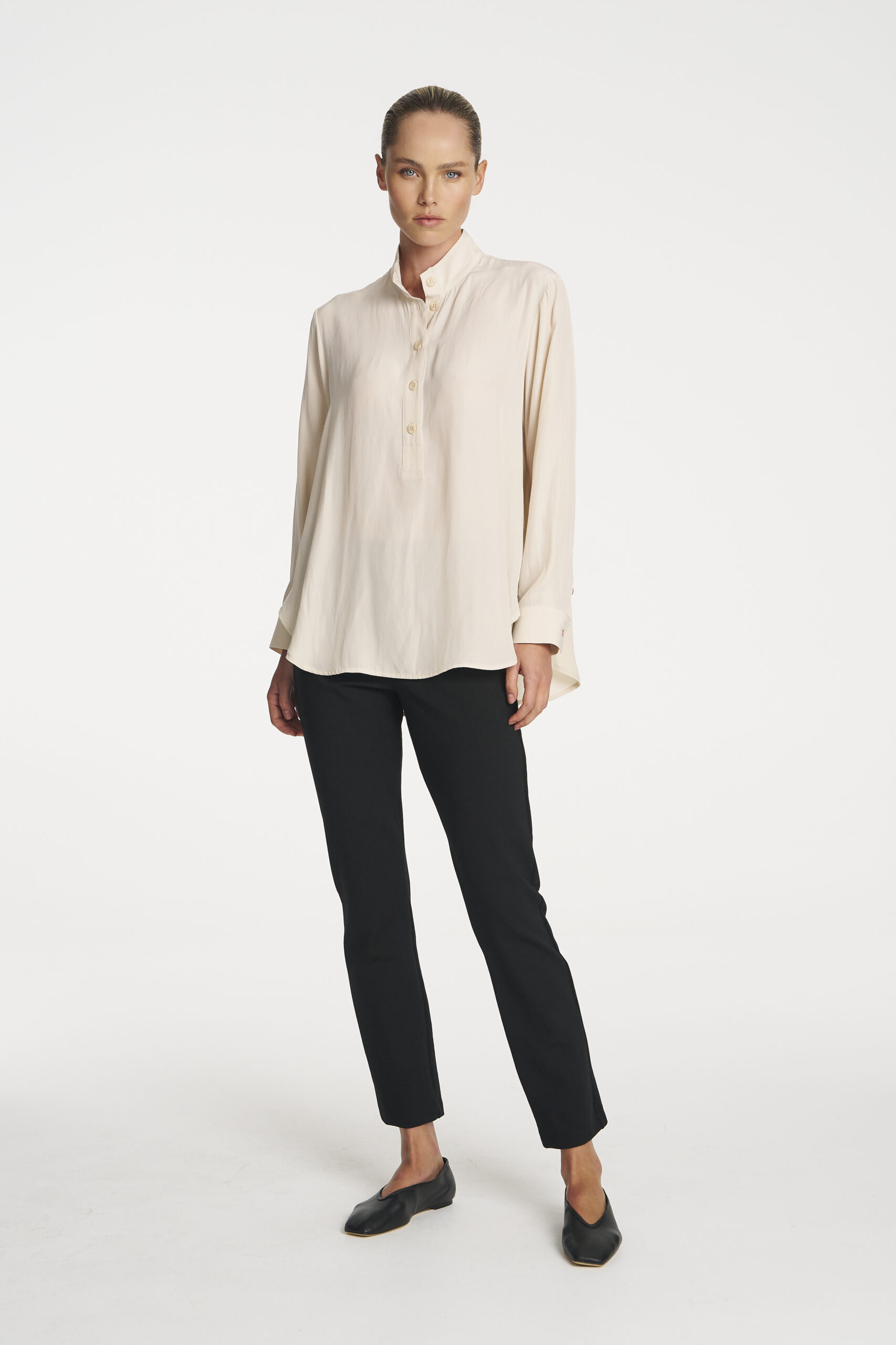 The Swish Tab Shirt is a longline shirt, featuring long sleeves, a button front closure and funnel neckline. This is an effortless piece that can easily be dressed up or down. Crafted from Mela Purdie’s Mache, a fine denier technical weave with an airflow finish, featuring a relaxed fluidity and smooth lustre surface.