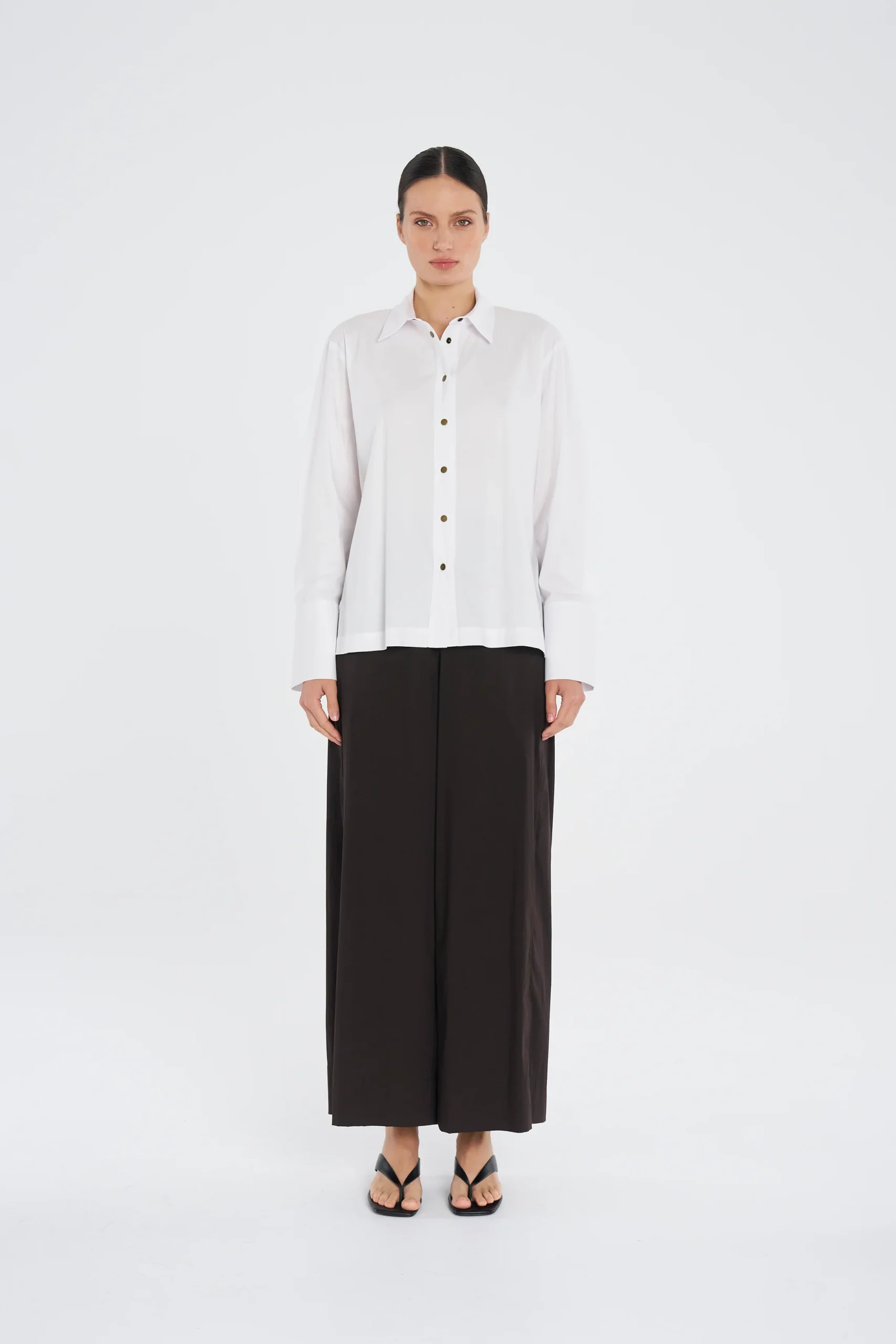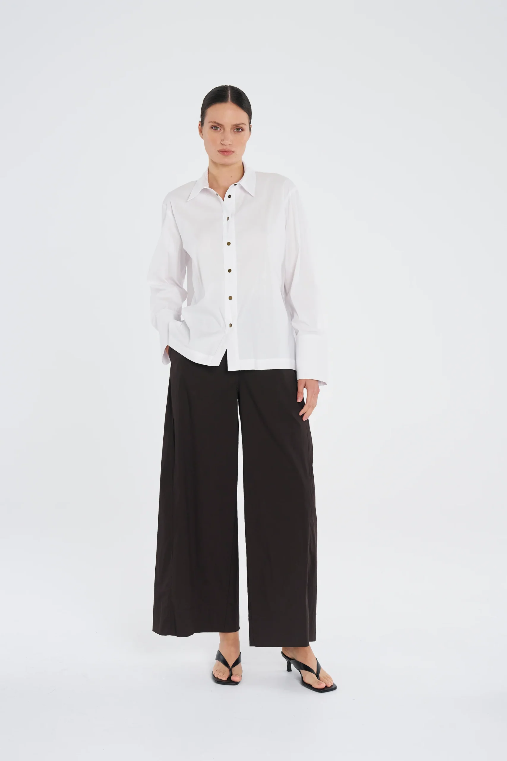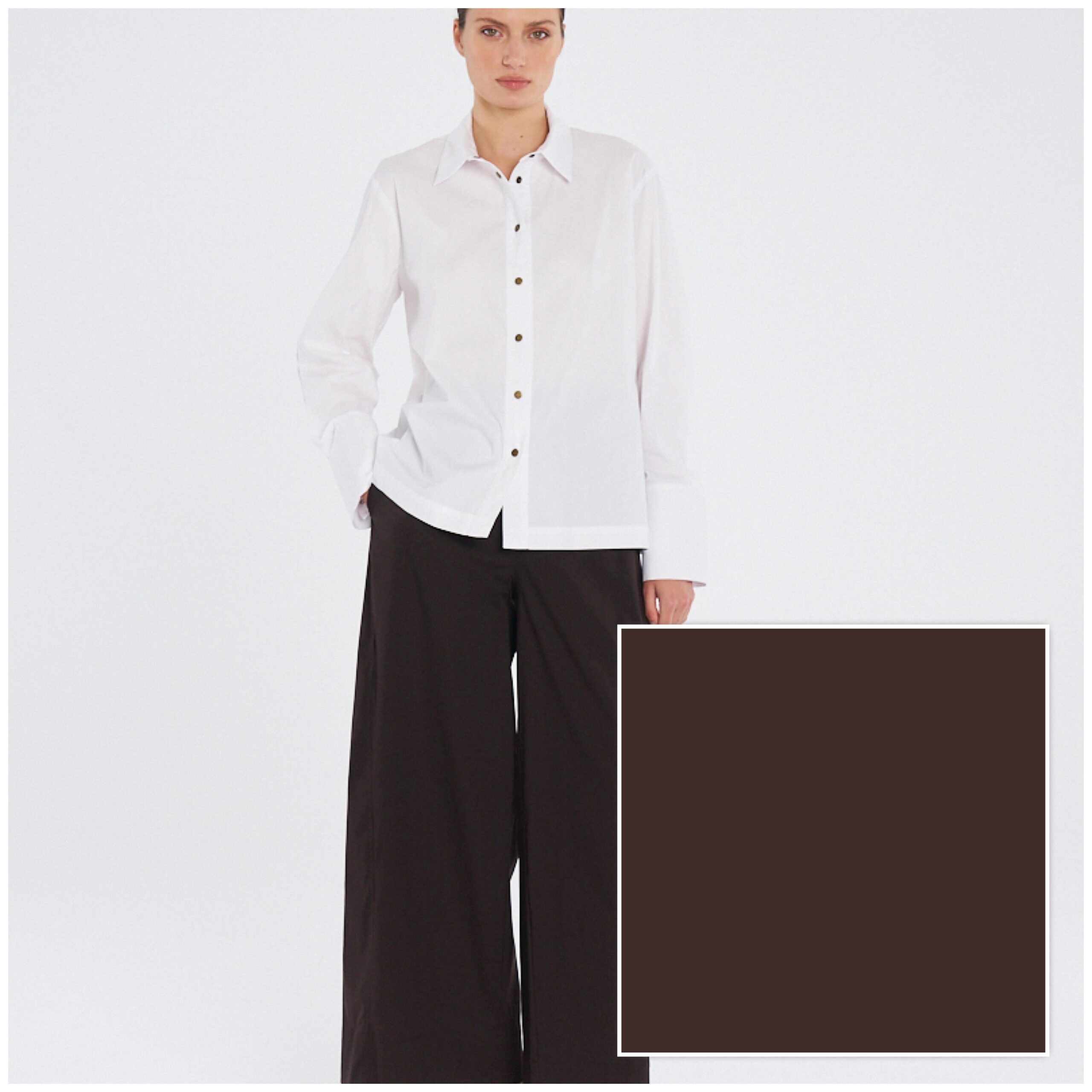 Crafted in Mela Purdie’s Lightweight Microprene, A crisp, cotton rich fabric with high stretch and a polished finish. The Wide Cross Pant features barrel shaped panel seams in a wide leg silhouette.