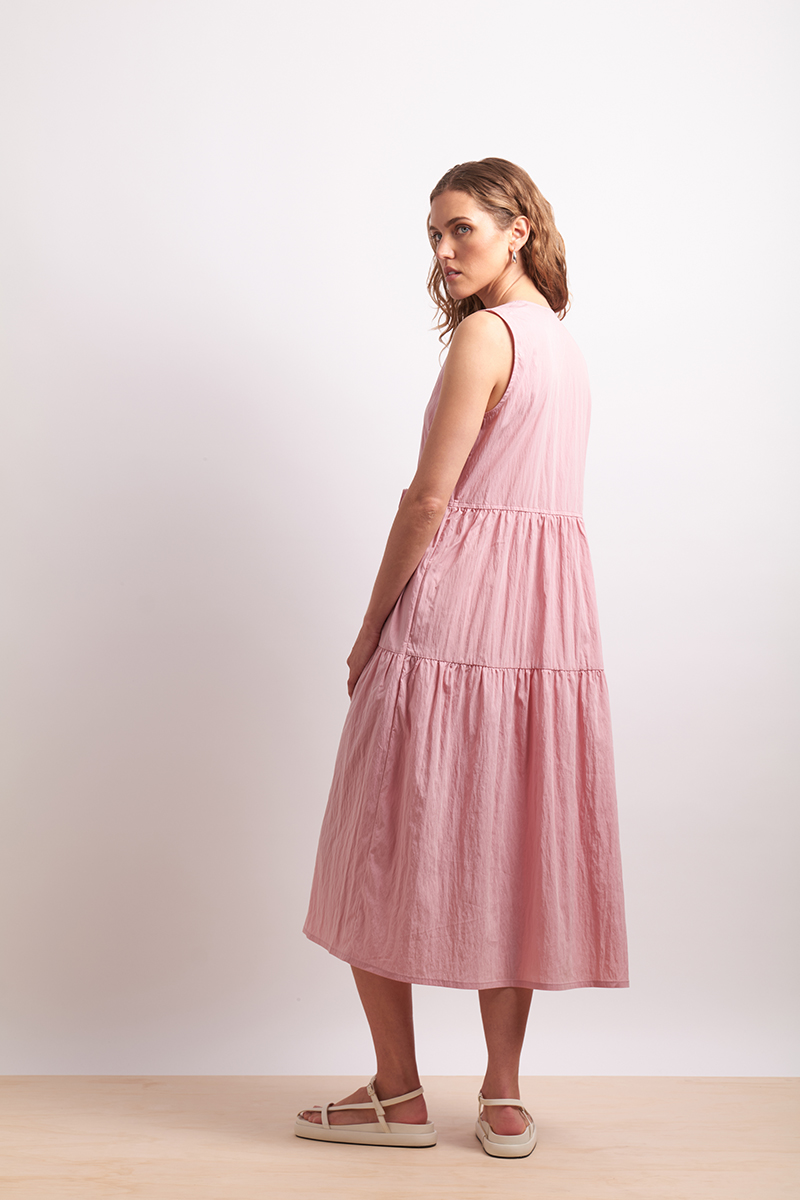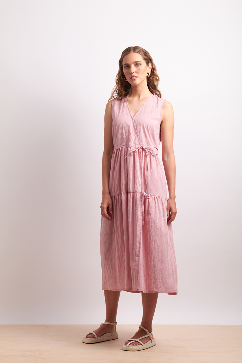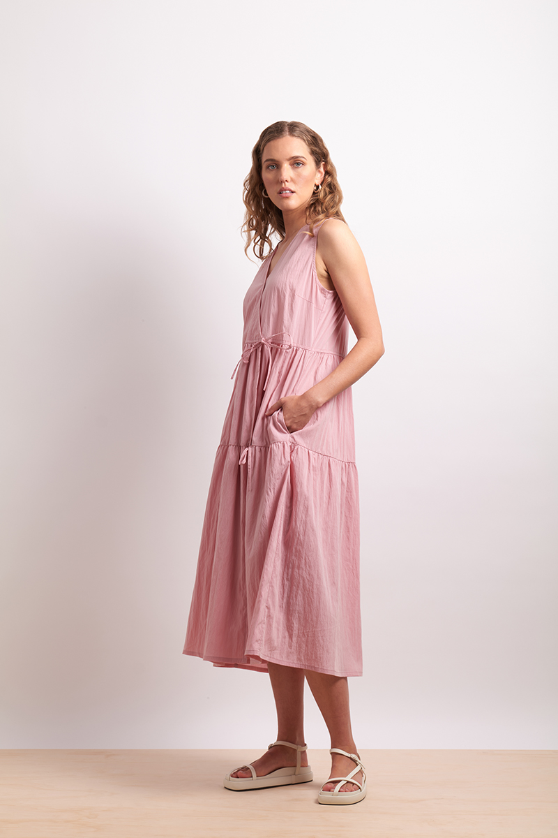 Relaxed and feminine, this sleeveless midi dress features a wrap-style tie front that is fixed, and fixed V-neck, the skirt on the dress is made of two tiers and is subtly gathered throughout. The fabric is cool to the touch and has a subtle texture to it. A soft silhouette perfect for sun-filled days. Designed in Christchurch, New Zealand.