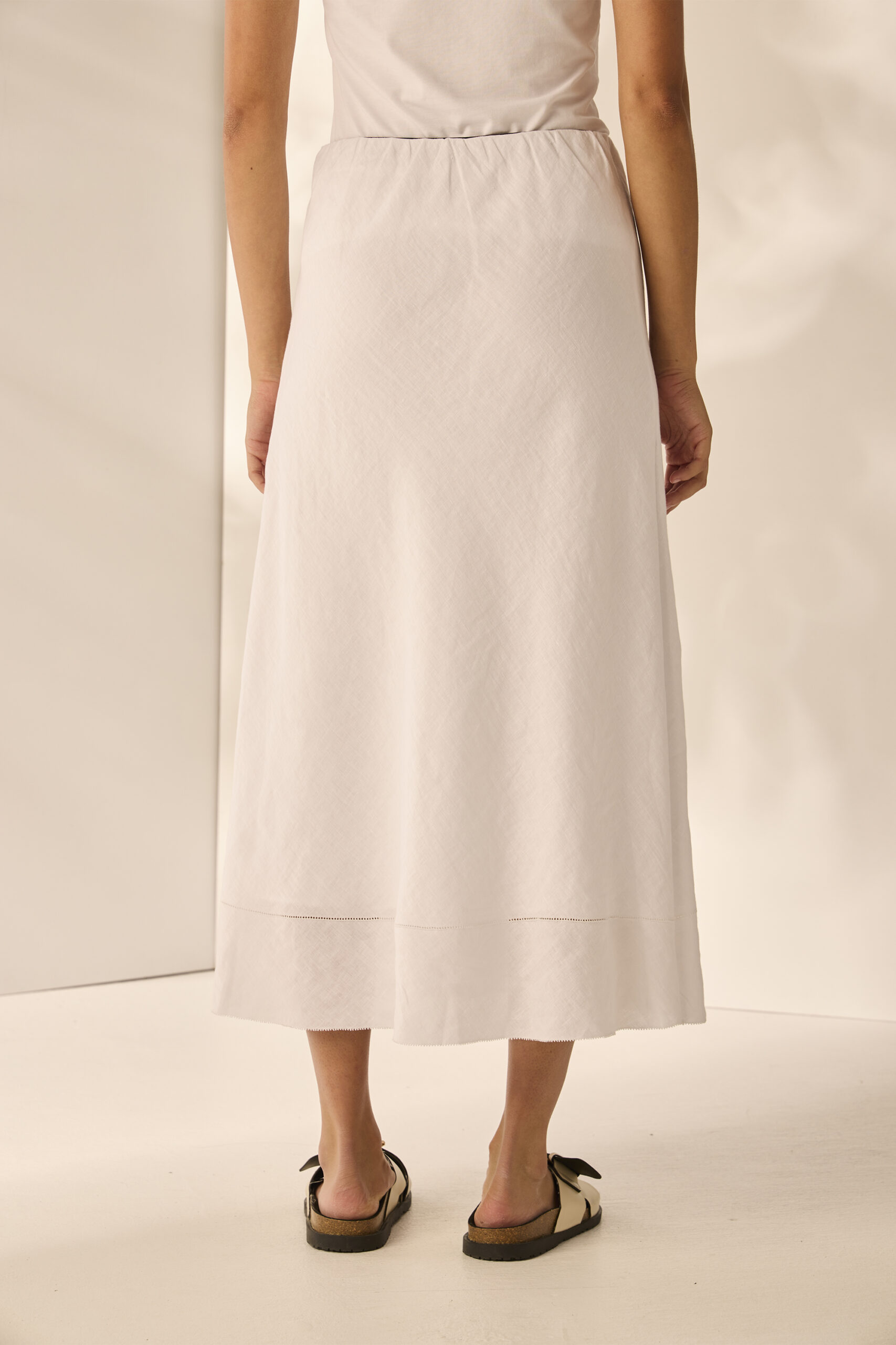Step into breezy elegance with the Hayden Skirt, crafted from luxurious linen fabric in a flattering bias cut. Its concealed elastic waistband provides a seamless fit, while the picot embroidery design at the hemline adds a touch of delicate charm. Fully lined for comfort and ease of wear, this skirt is perfect for embracing effortless style on warm summer days.