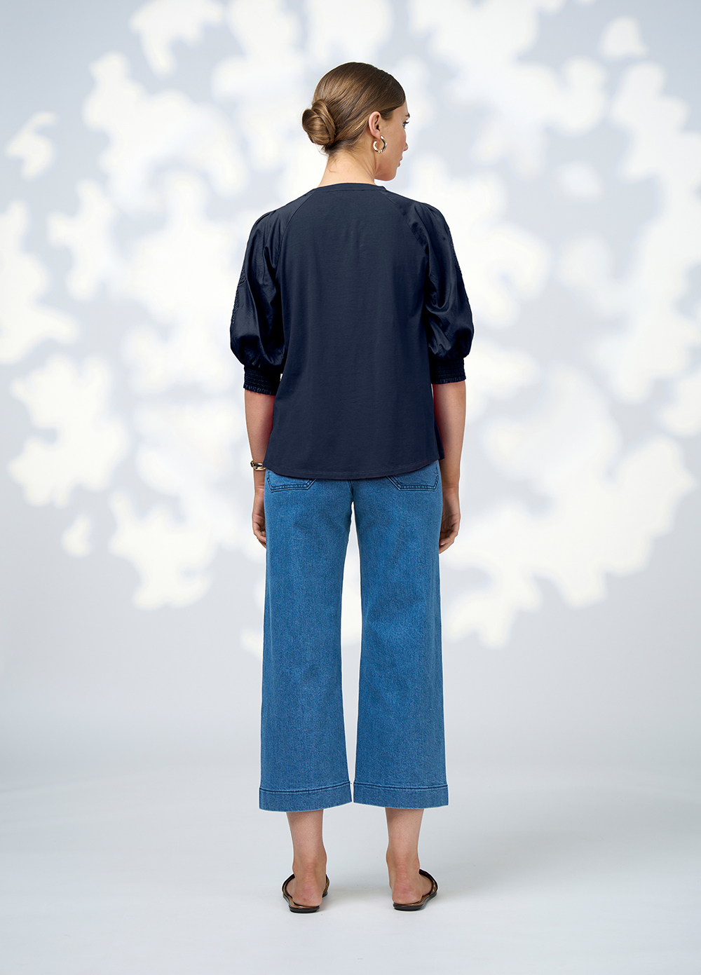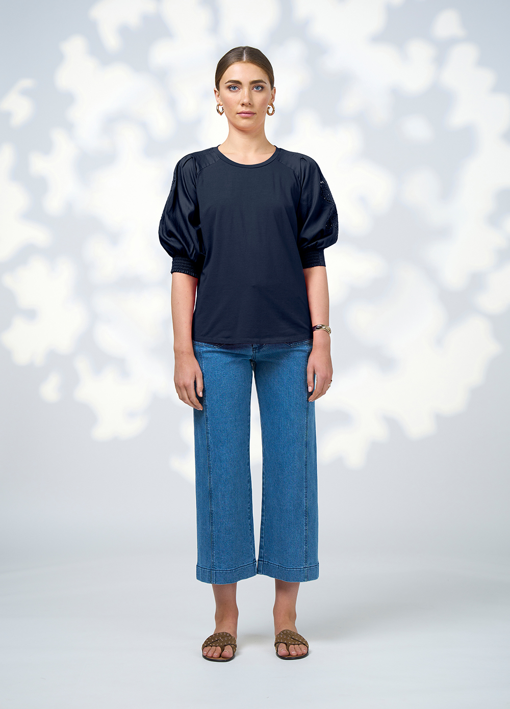 Easy fitting tee with a crew neckline, and shoulder tucks, with half shirred cuffs. Featuring soft lustred cotton sleeves with exclusive cut work embroidery detail.