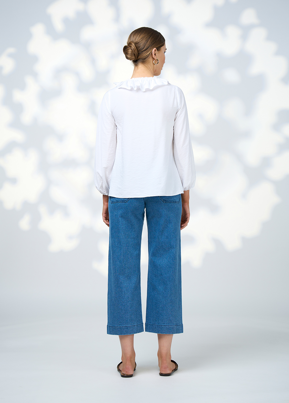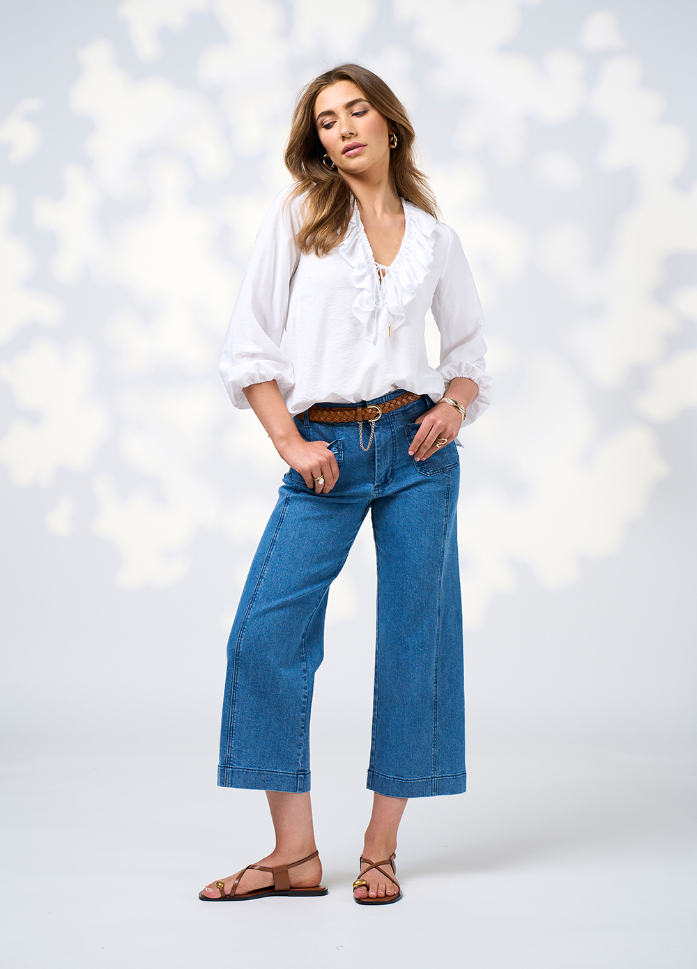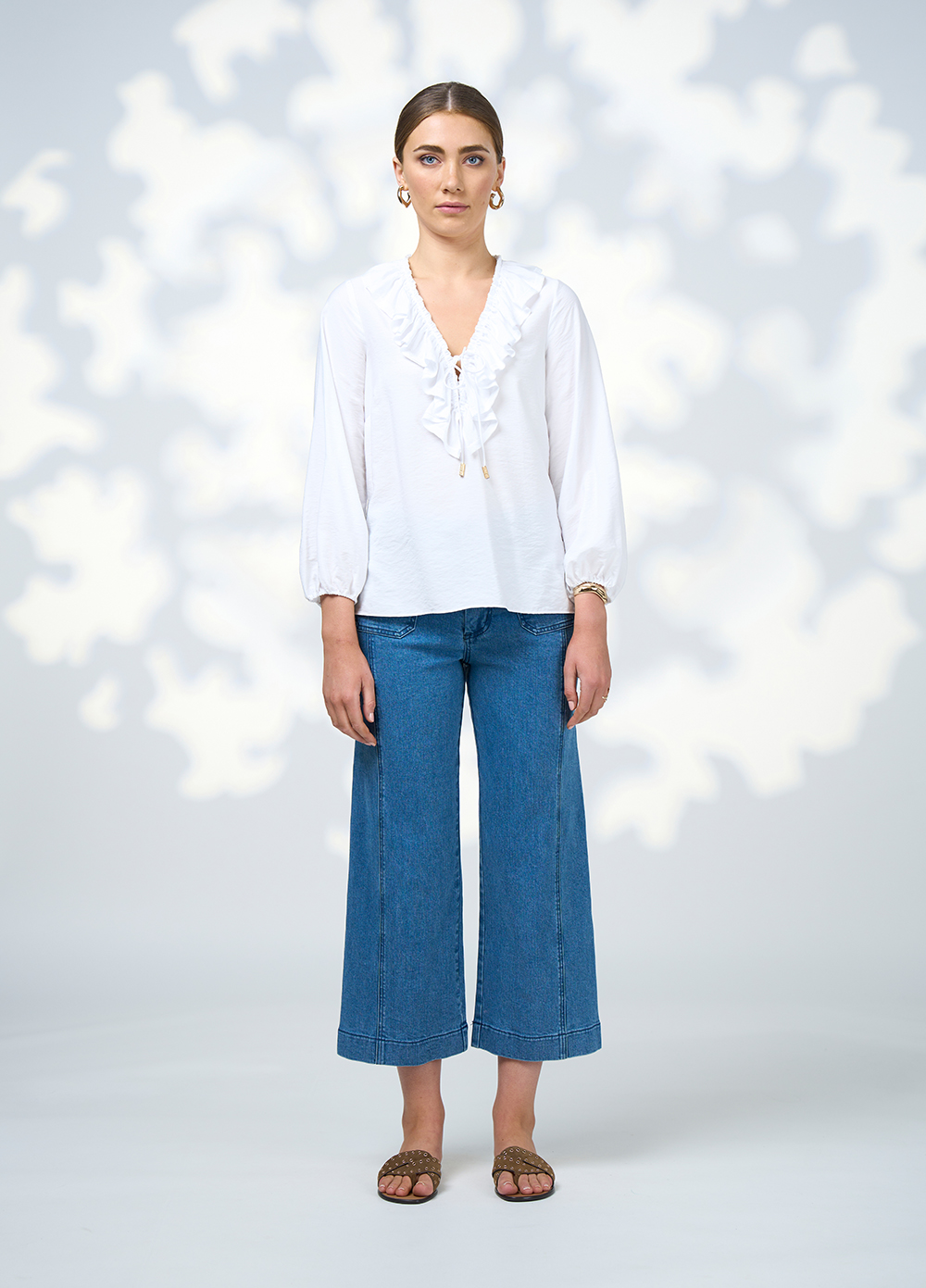 Floaty, blouse with a deep V neckline and a ruffled collar. Featuring a centre front tie at the bust to secure the neckline. Blouson sleeves gather into thin elasticated cuffs.