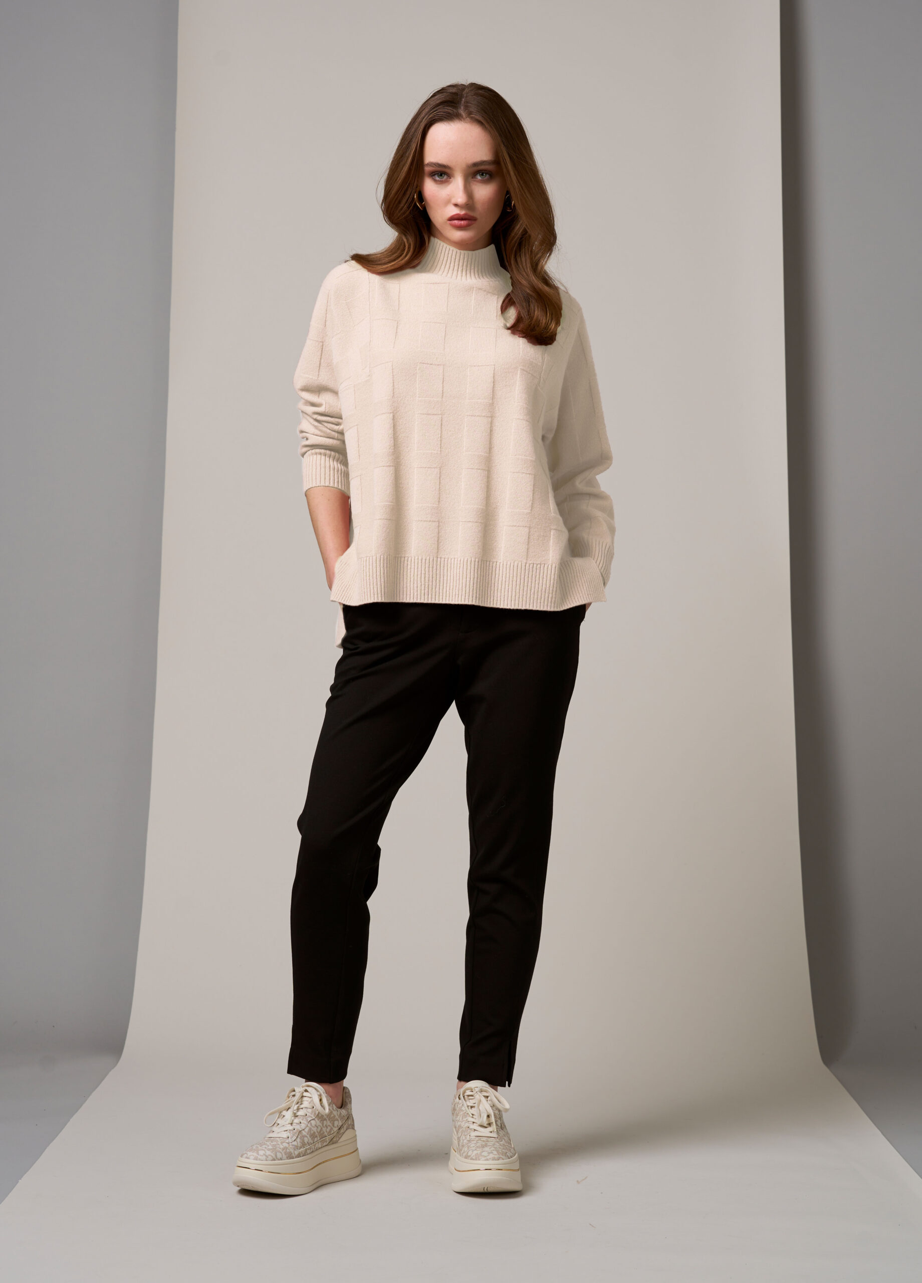 Soft merino wool sweater with a mock neck, dropped shoulder and side splits. Featuring subtle lattice design and ribbing detail.