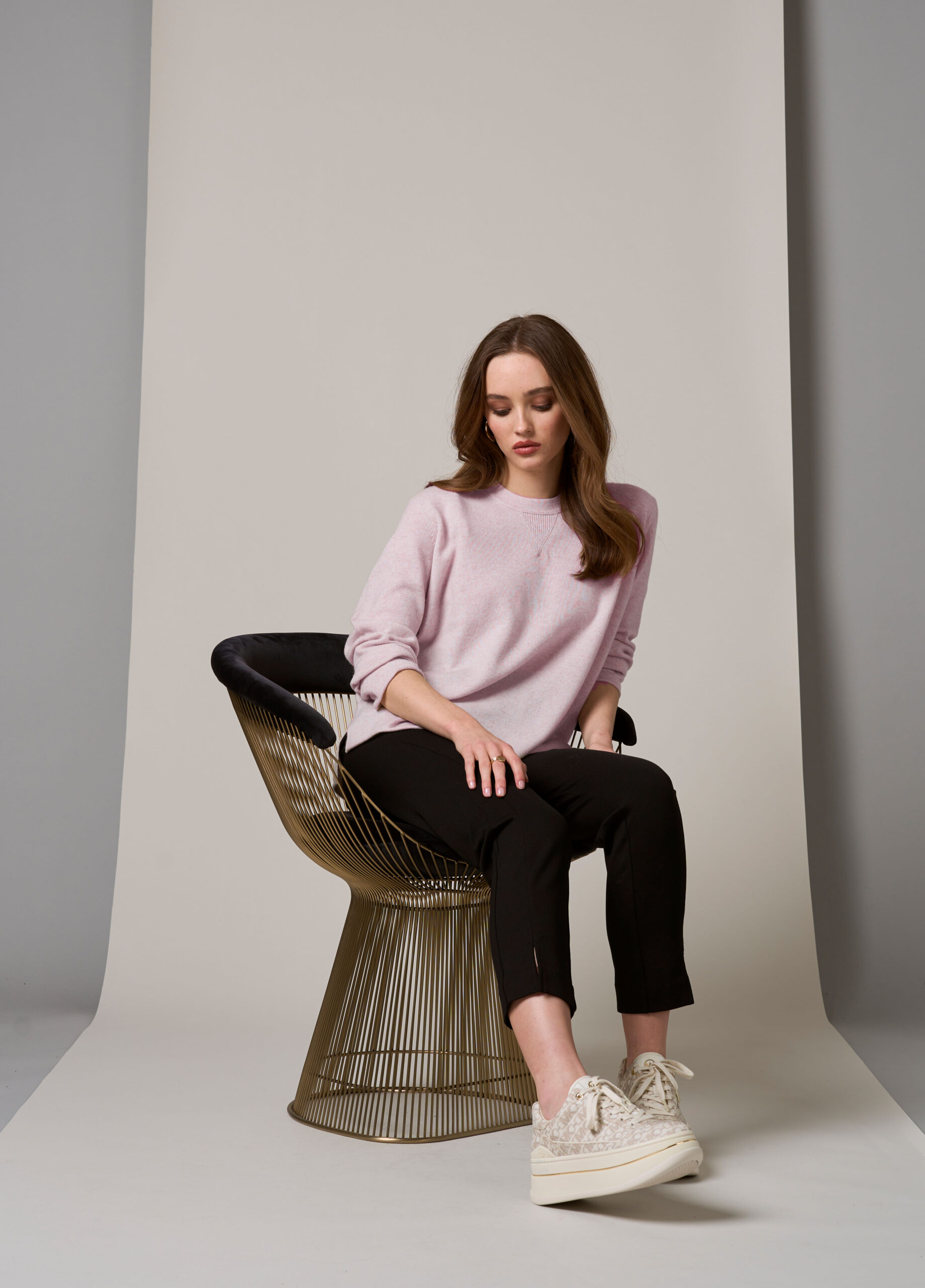 Crew neck sweater in a cashmere, wool blend with a faux rib V-neck feature. With pointelle detailing.