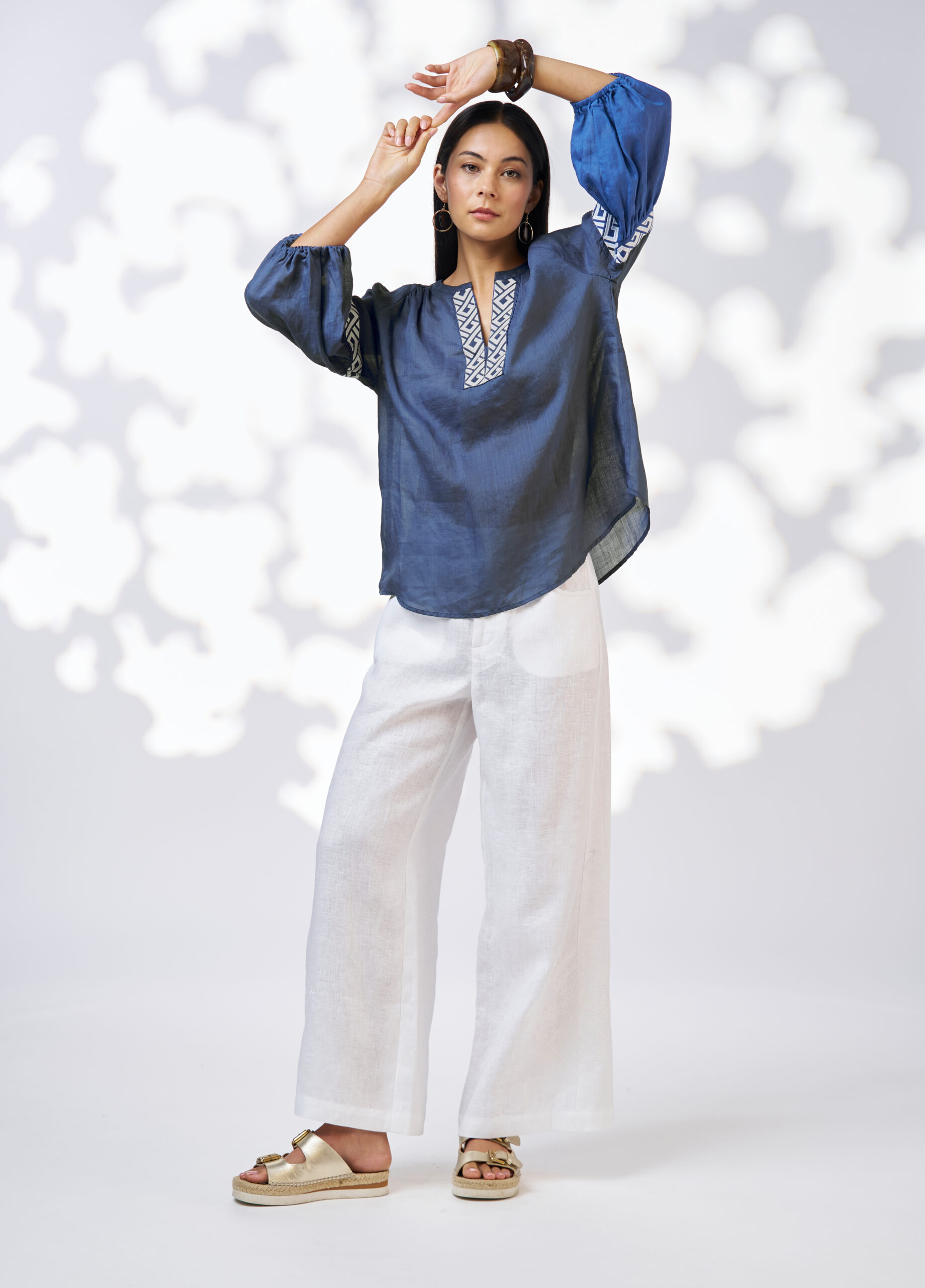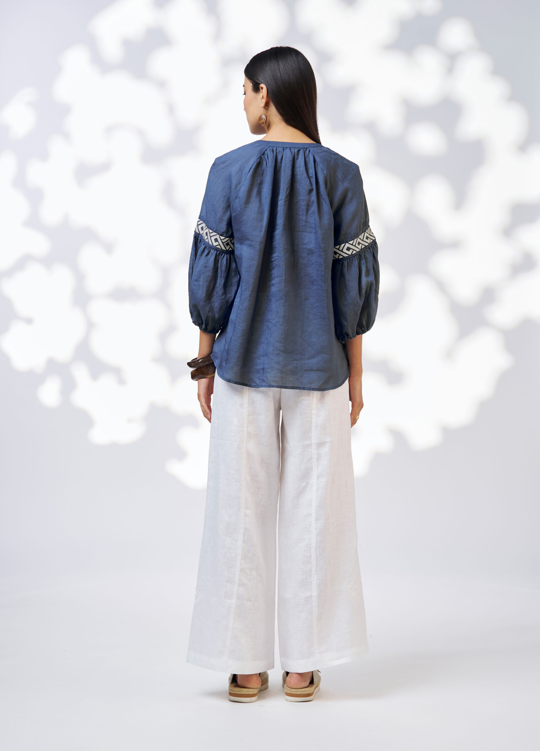 Ramie blouse with a V-neckline, featuring contrast embroidery detail around neckline and sleeve panels. Sleeves gather into a turned back elasticated cuff.