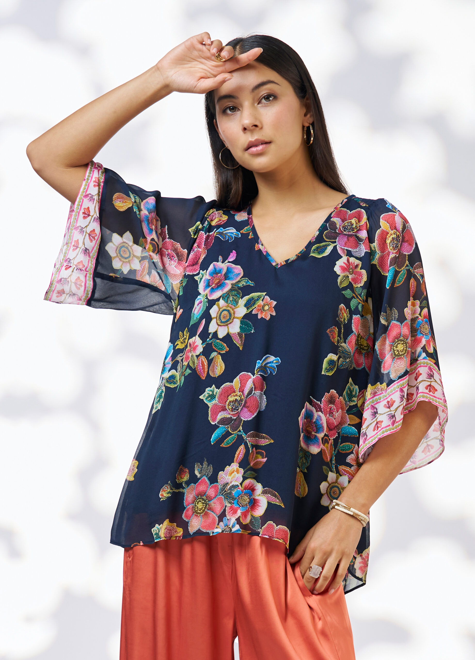 Floaty, printed blouse with a flattering V-neckline and shirred raglan sleeve shoulder detailing. Featuring a contrast sleeve hem panel to add interest. Lined through body.