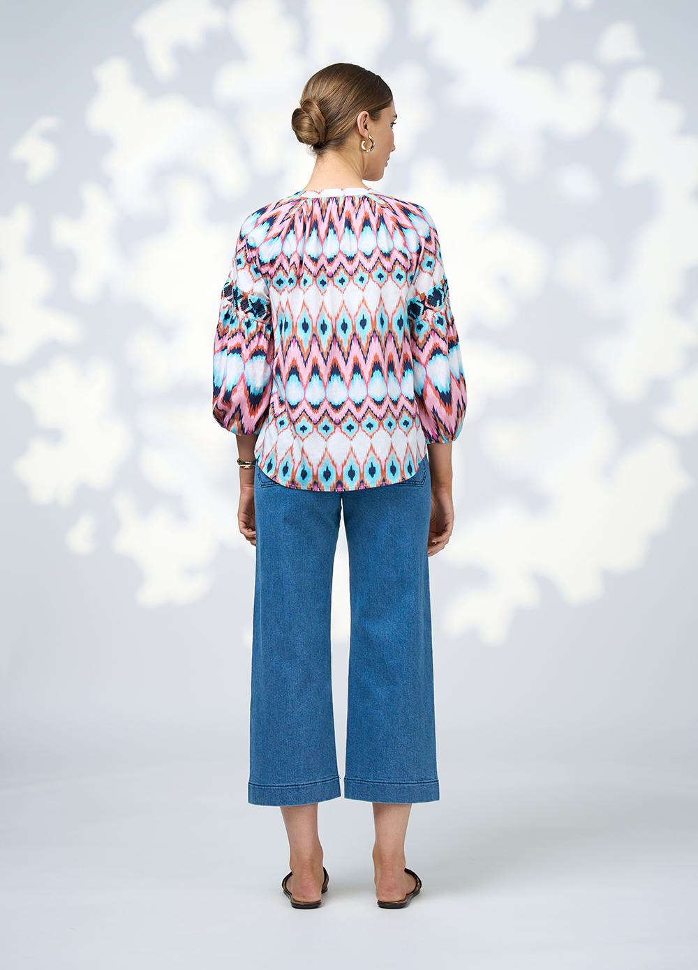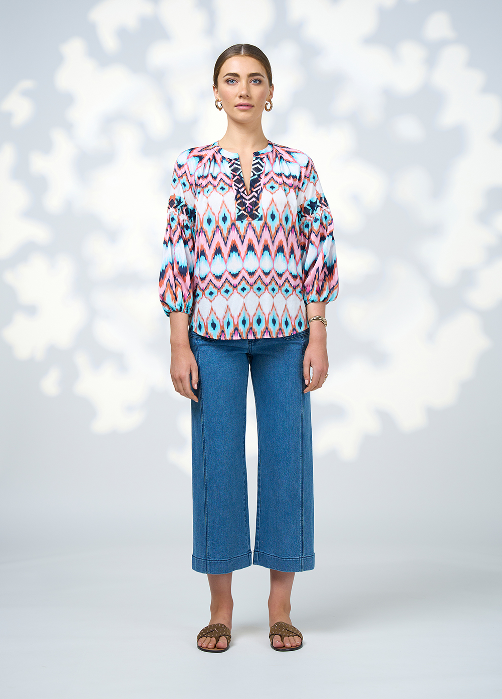Printed blouse with a V neckline and contrast detail on placket and sleeve panels.  Sleeves gather into turned back elasticated cuffs.
