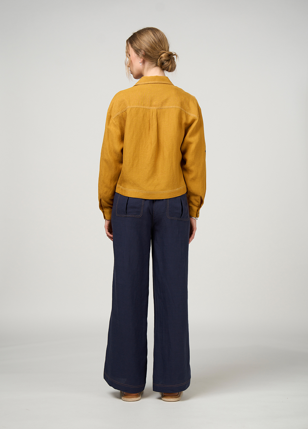 Cropped Jacket in a linen blend, with front pockets, featuring contrast twin needle detailing, and adjustable sleeves with a hidden tab.