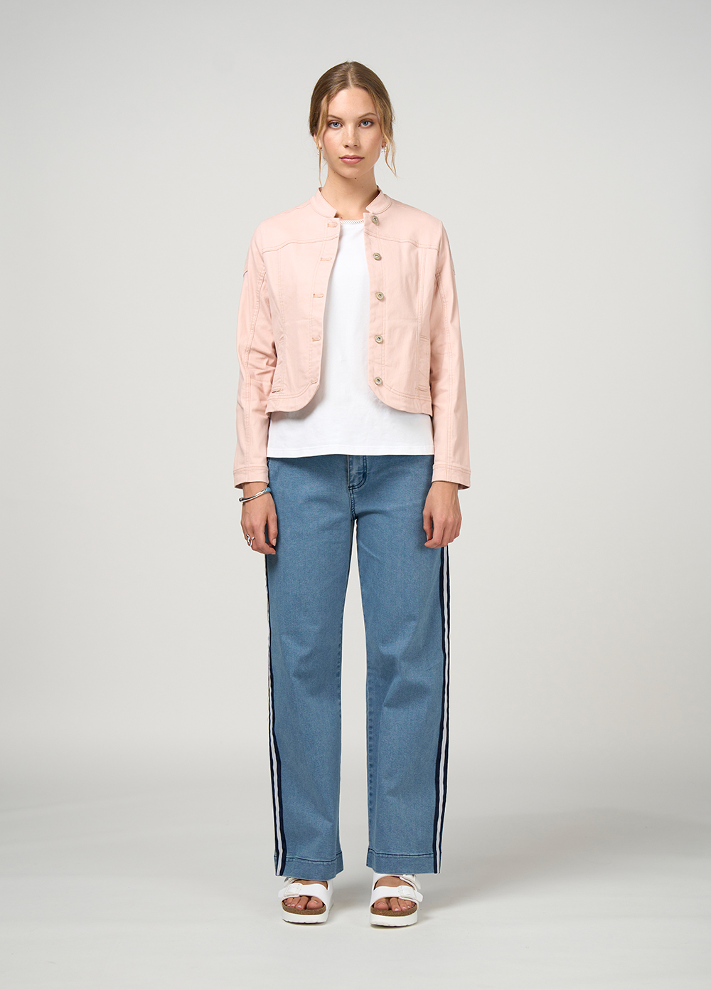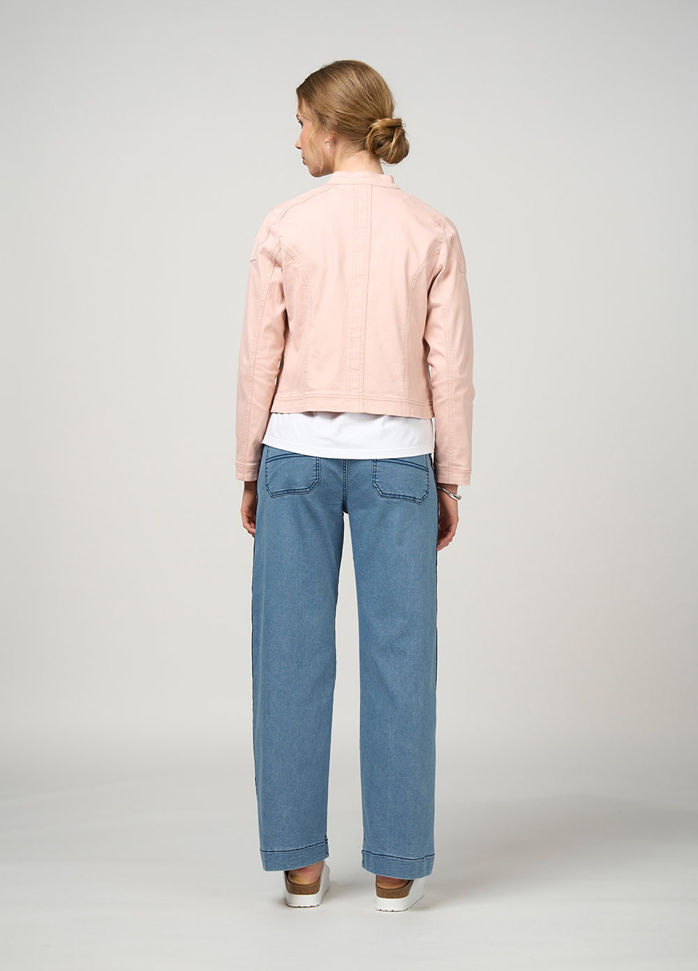 Fitted, stretch jacket with flattering panel detail front and back. Front pockets are seamed into front panel seam.