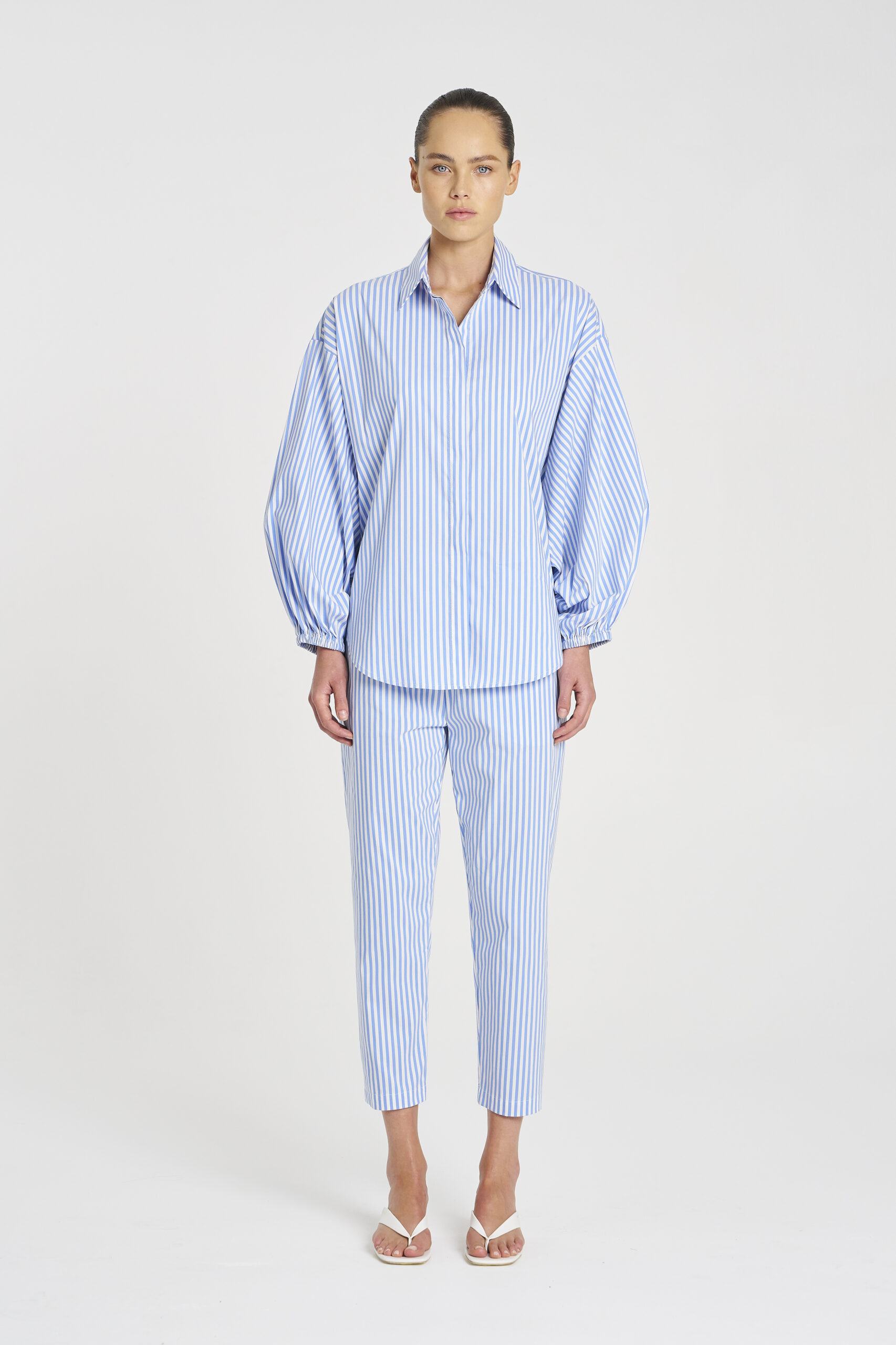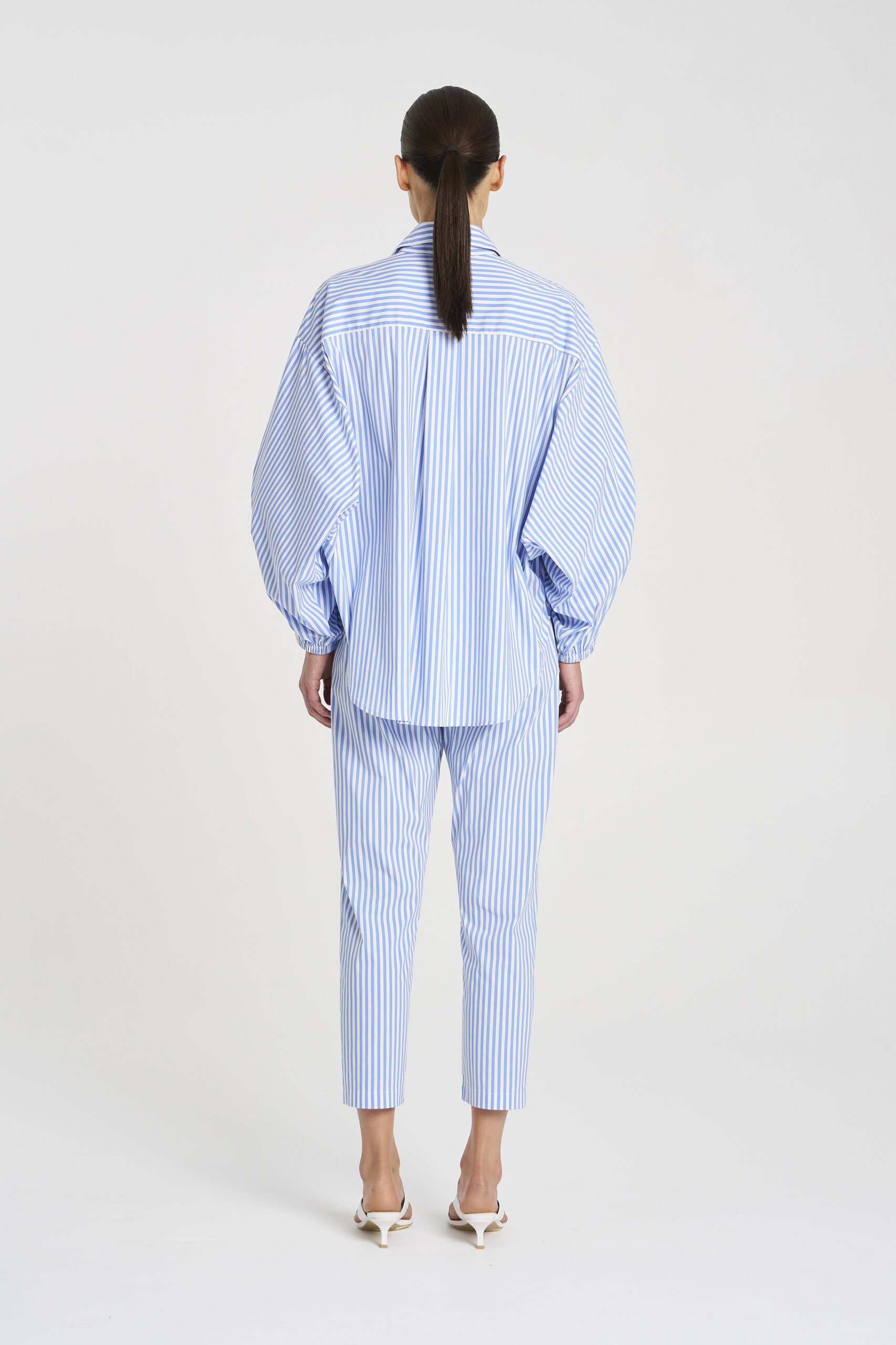 Cut in Mela Purdie’s Lightweight Striped Microprene, a crisp, cotton rich fabric with high stretch and a polished finish, featuring a bold yarn dyed stripe. The Nomad Pant is cut for tapered fit. These are the perfect utility piece for any wardrobe.