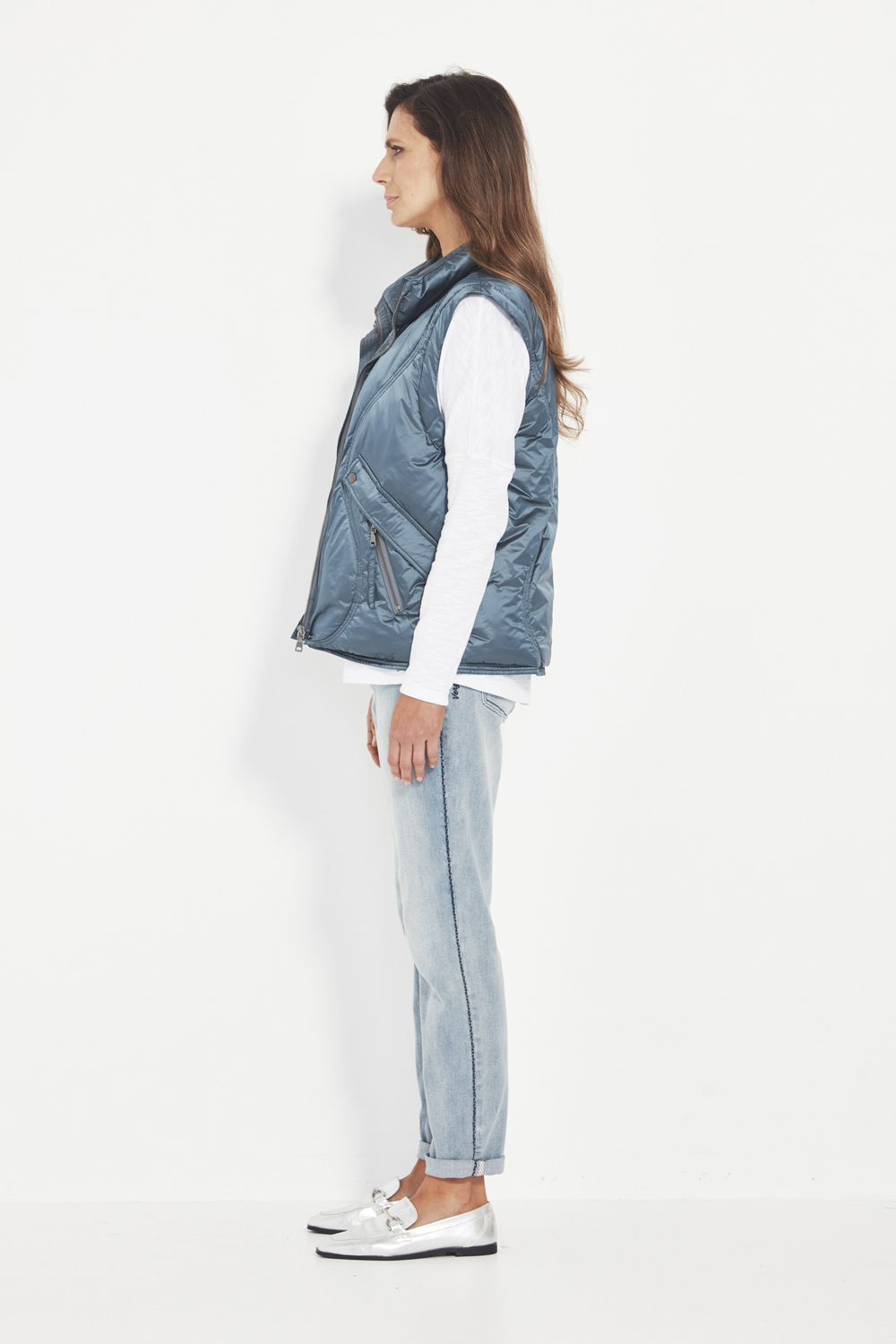 Additional domed faux pockets add a refined design detail without adding bulk. Falling to the hip, the Nocturnal Vest layers easily over knits, long-sleeve tops, and active pieces — the perfect balance of function, warmth, and contemporary shine.