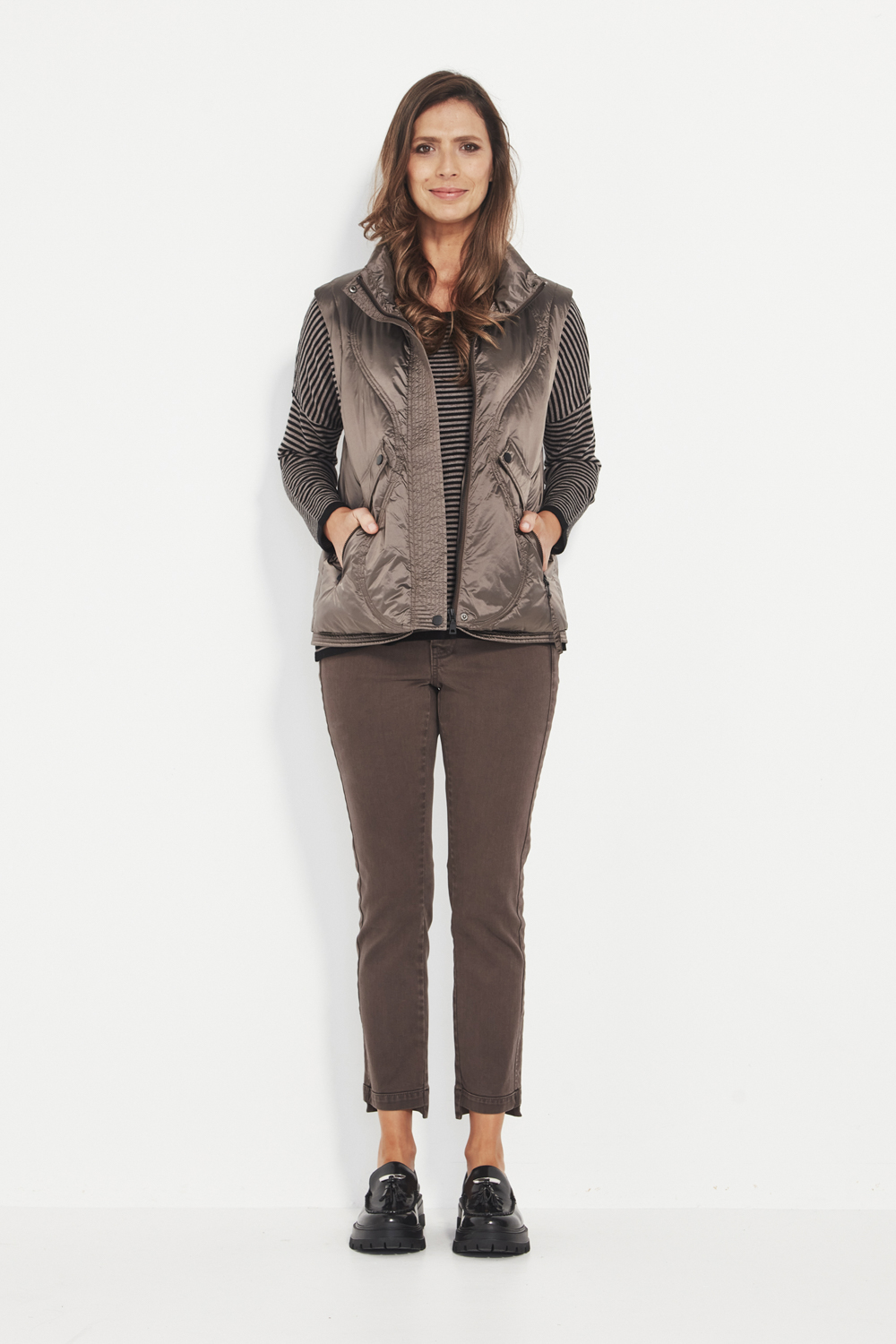 Additional domed faux pockets add a refined design detail without adding bulk. Falling to the hip, the Nocturnal Vest layers easily over knits, long-sleeve tops, and active pieces — the perfect balance of function, warmth, and contemporary shine.