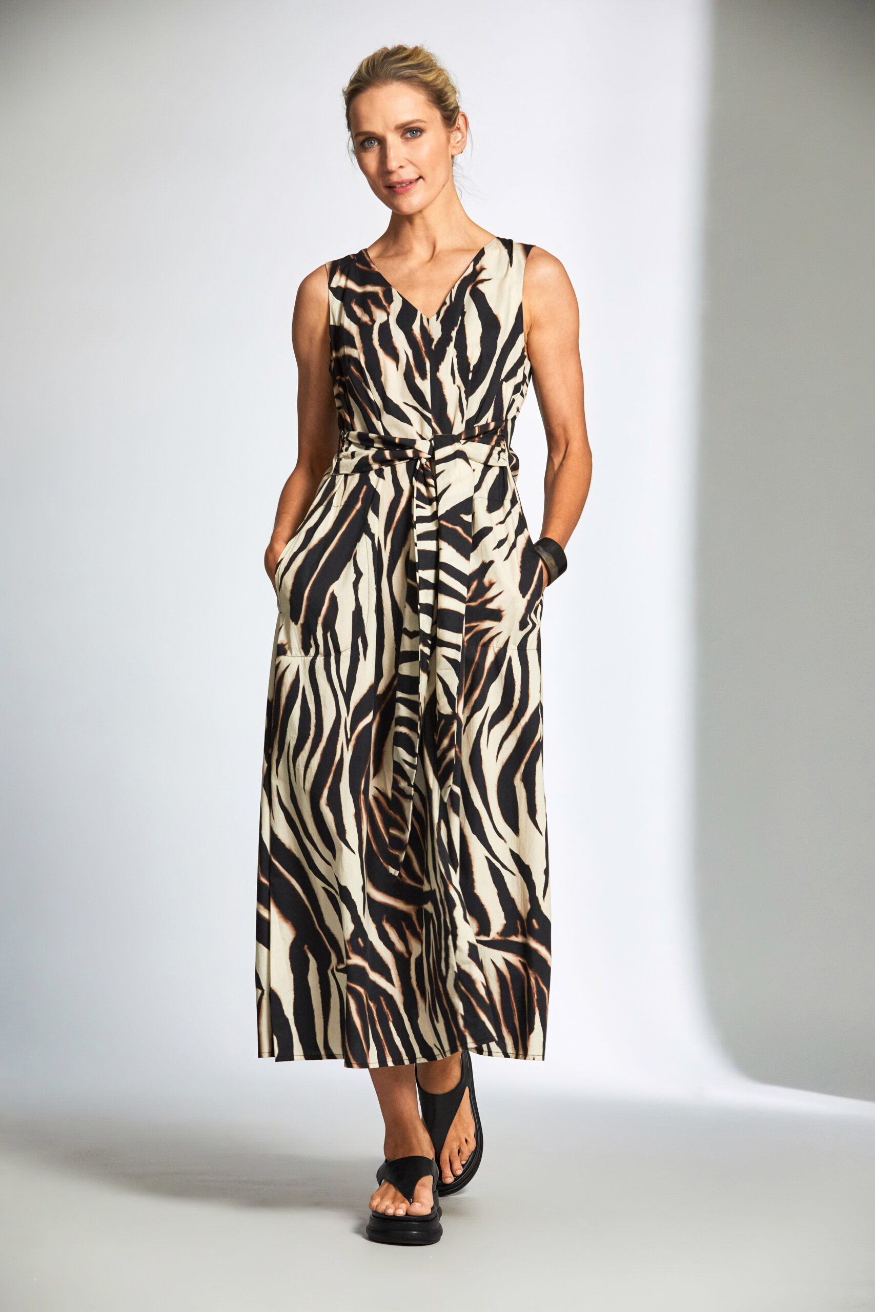 The PERUZZI Tiger Print Dress in Black & Cream is a bold and stylish piece, perfect for making a statement. Featuring an elegant A-line skirt, it offers a flattering and comfortable fit. The dress is designed with practical pockets and a waist tie, allowing for a cinched silhouette that enhances your shape. The striking tiger print adds a modern edge, making it an ideal choice for both casual and smart-casual occasions.