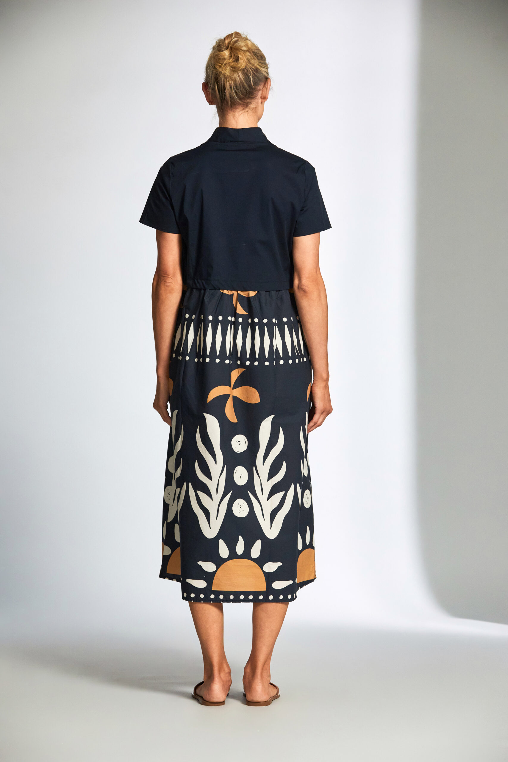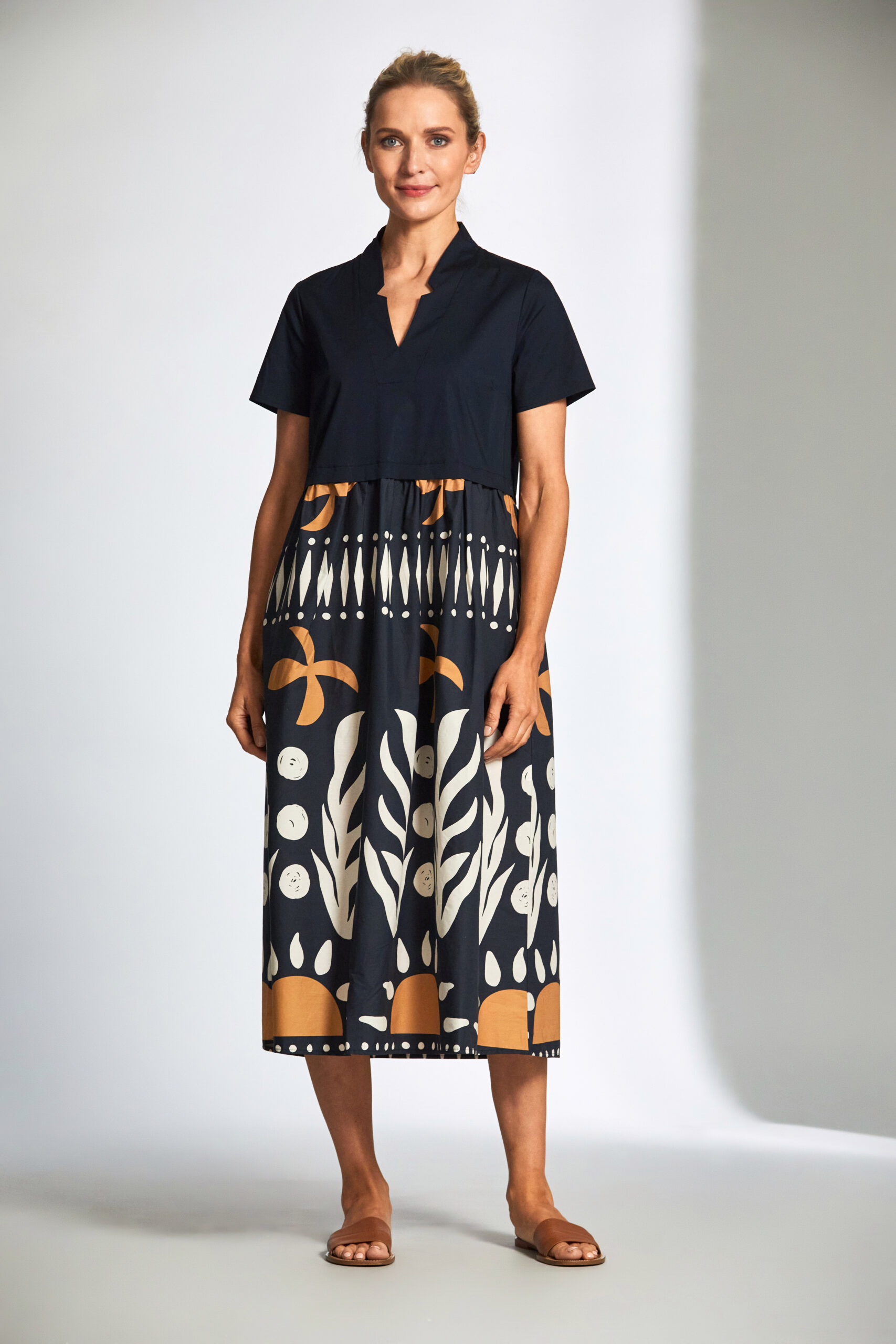 This short-sleeve relaxed fit Peruzzi midi dress features a solid navy bodice with a V-neckline and a gathered skirt in an abstract ivory and ochre print.