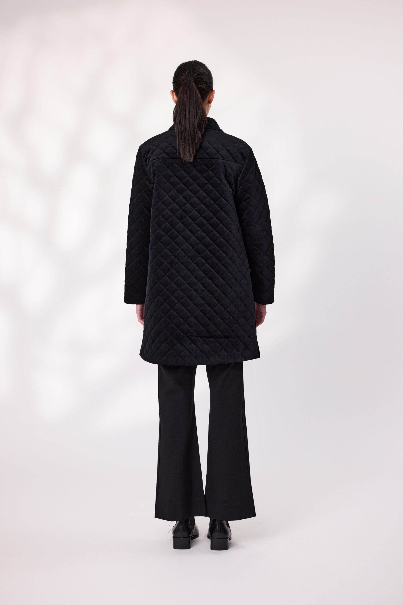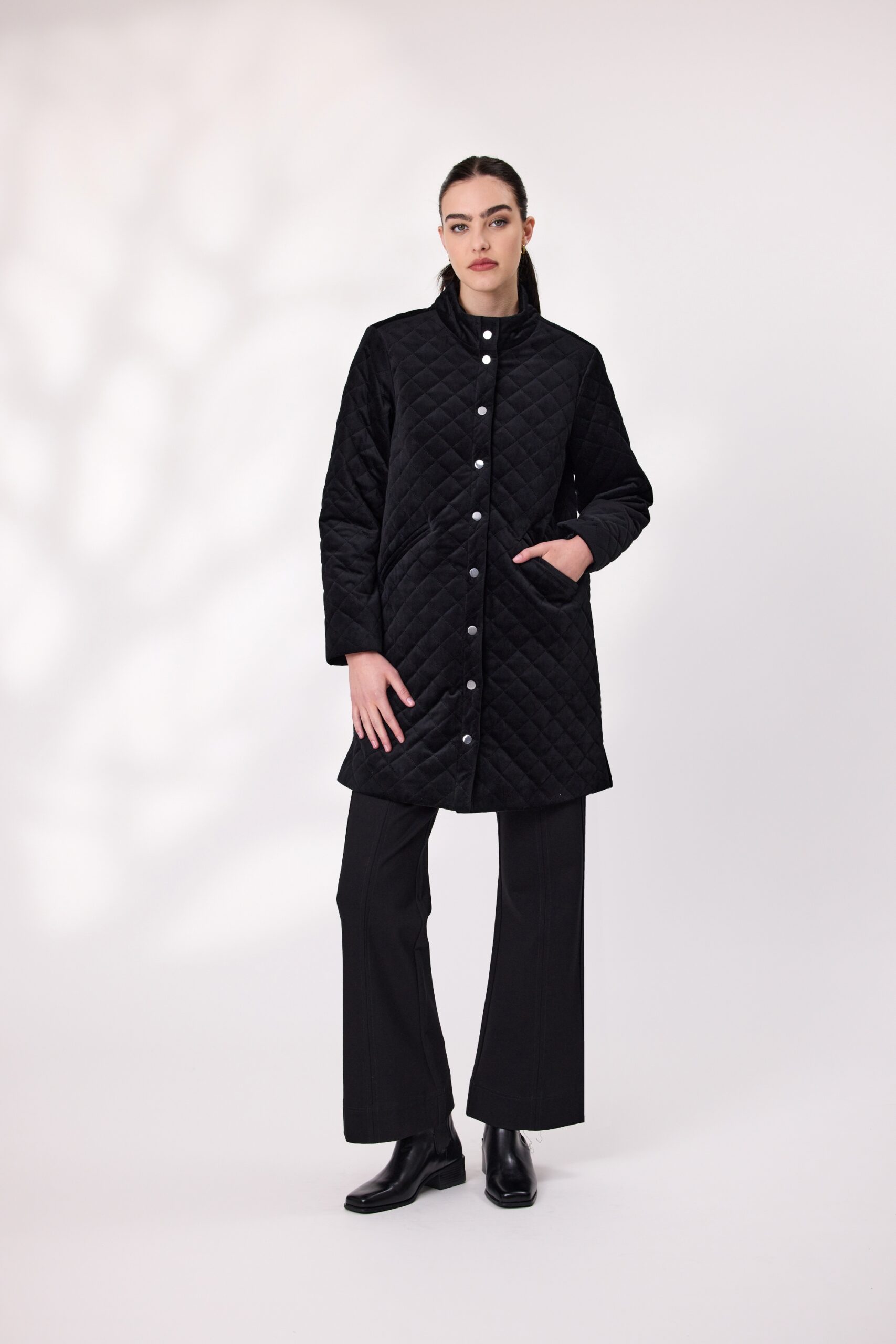 Step into effortless elegance with this long quilted velvet coat. It features a diamond-quilted texture that adds depth and sophistication. The full-length silhouette offers extra coverage, while the soft lining ensures comfort in cooler weather. A button-down front provides a classic finish and hip-level pockets.