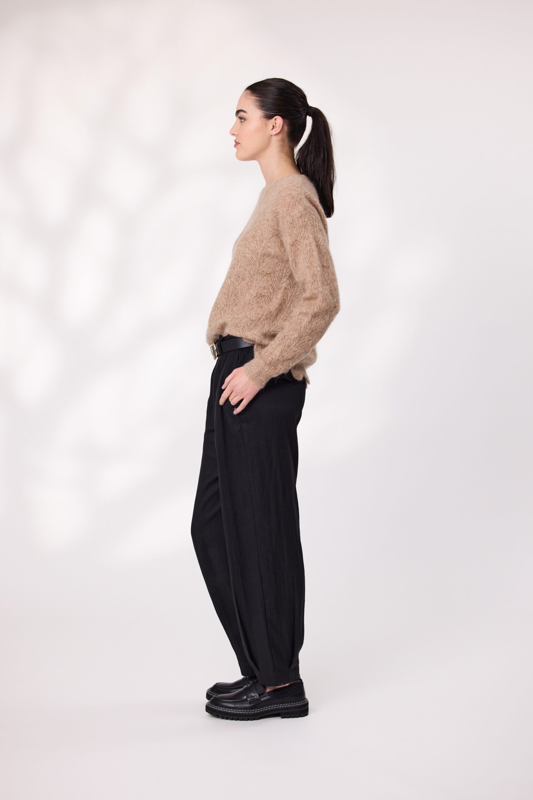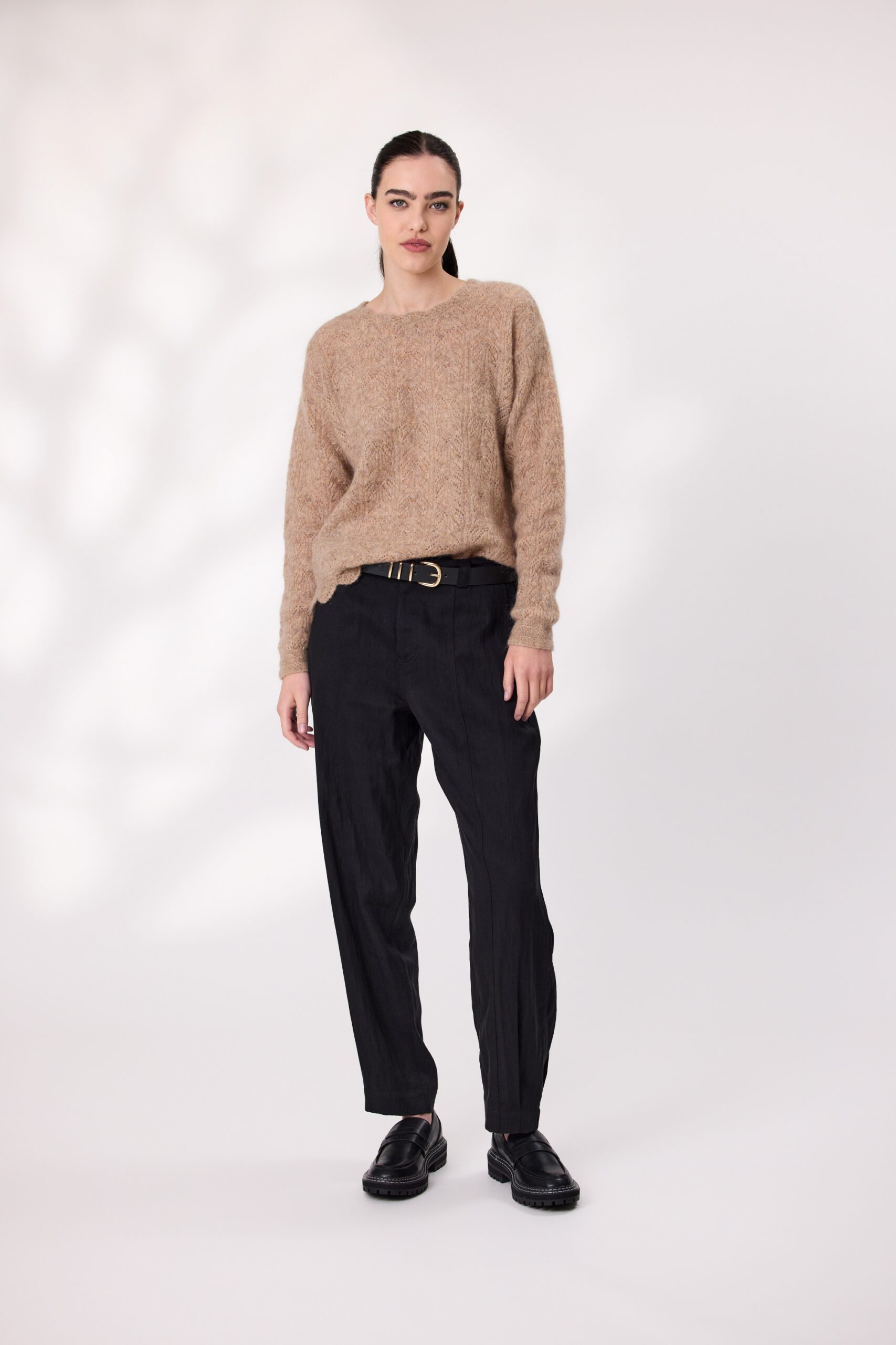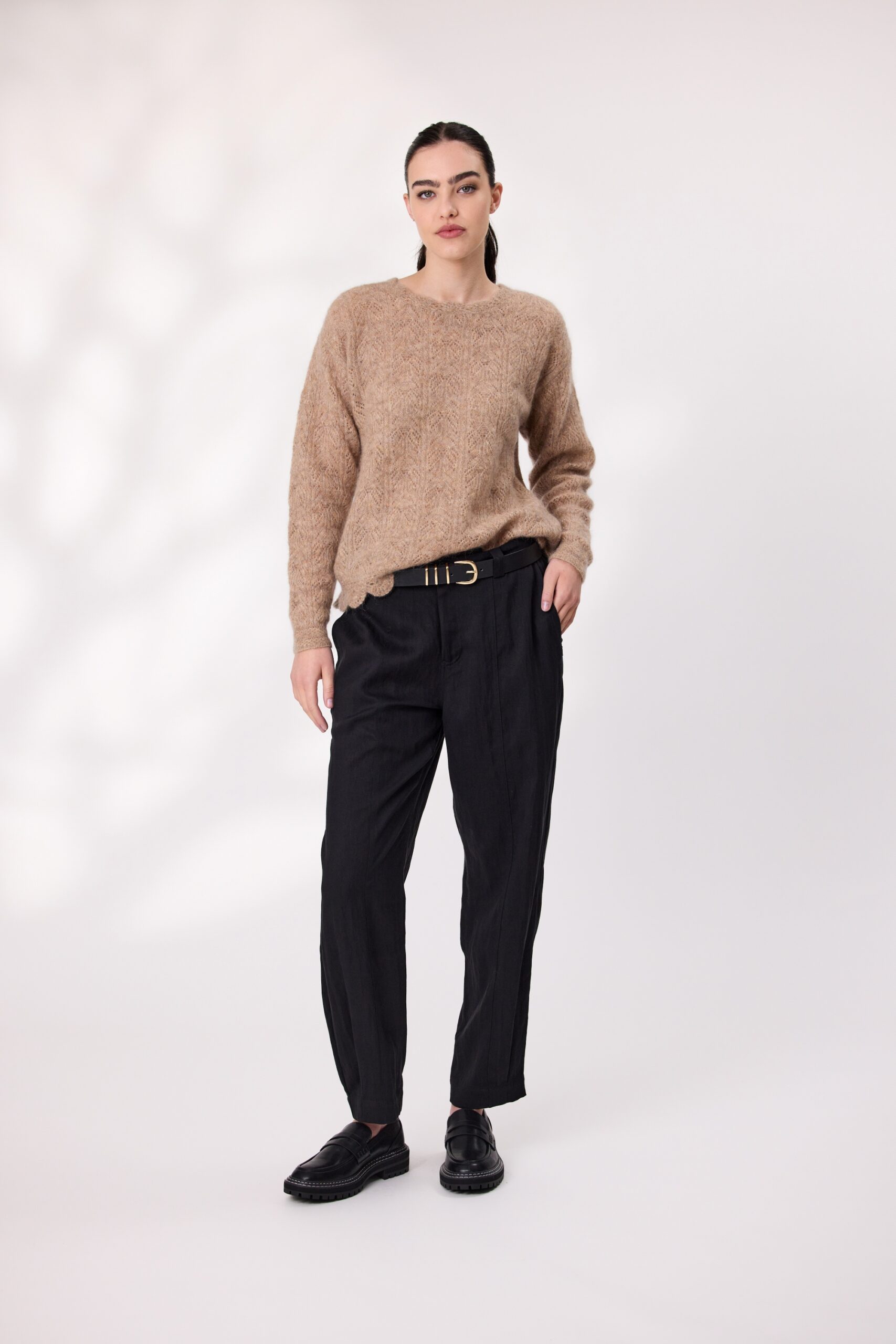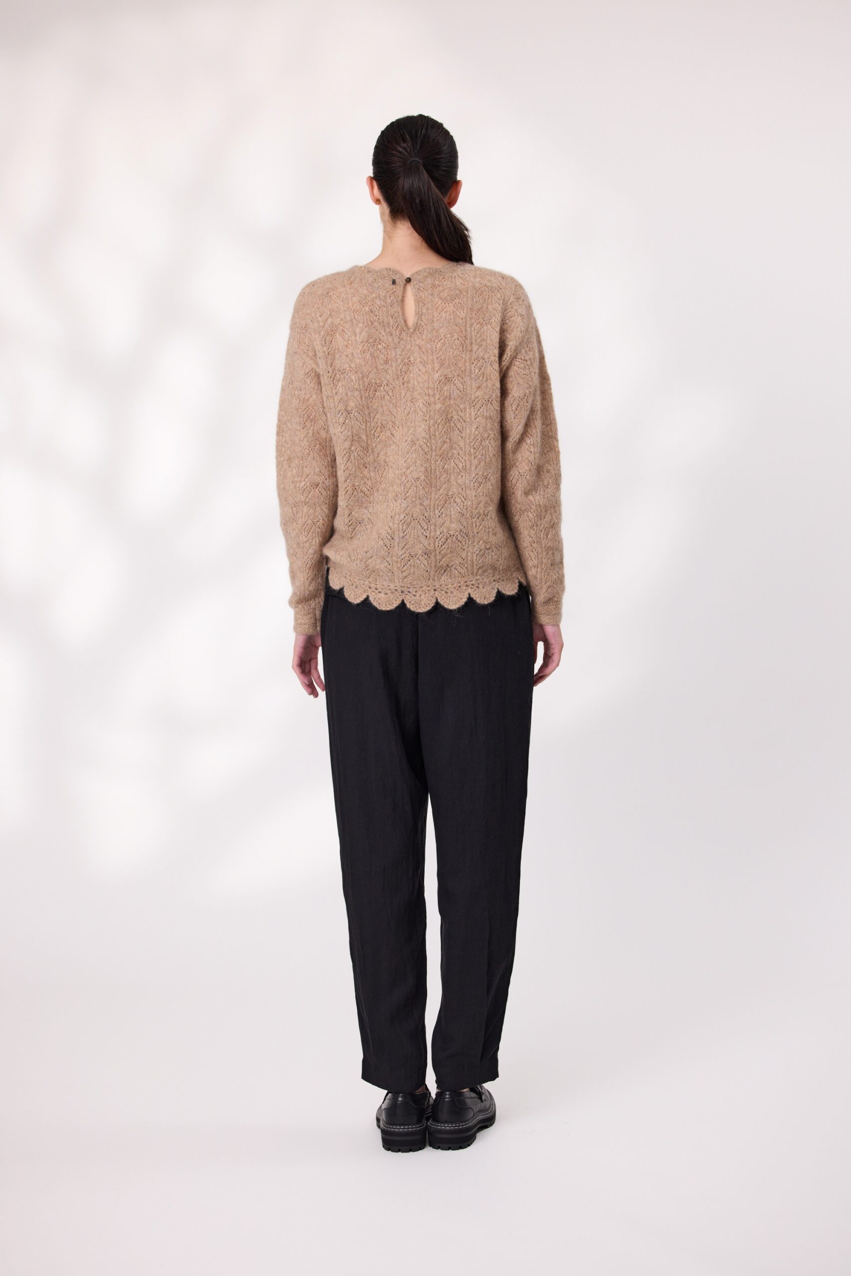 Soft, stylish, and full of character—this mohair wool blend jumper is a standout piece for cooler days. With long sleeves and a cozy feel, it features an intricate design that adds texture and charm. The scalloped hemline gives it a playful finish, while the colour tone keeps it fresh and feminine.