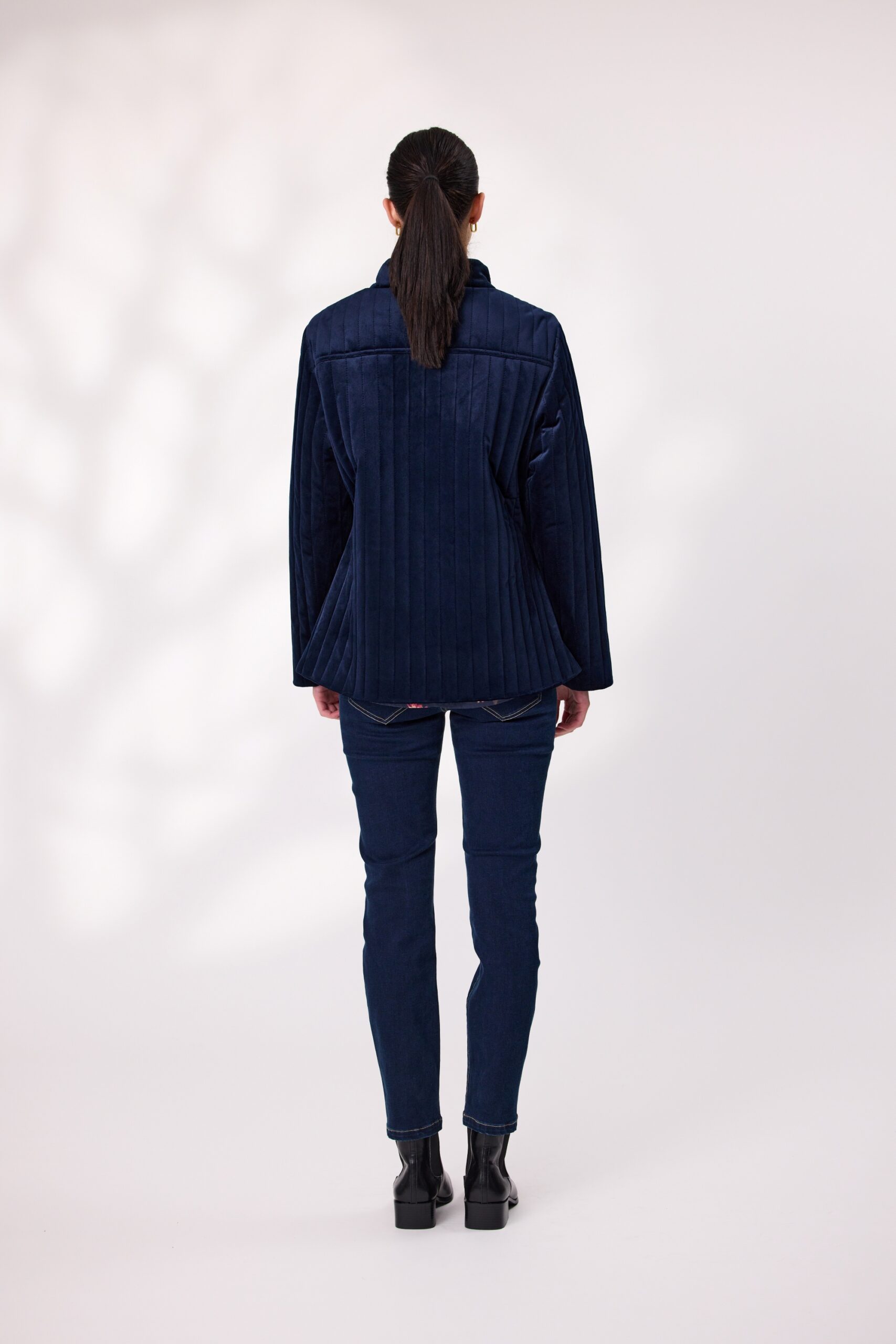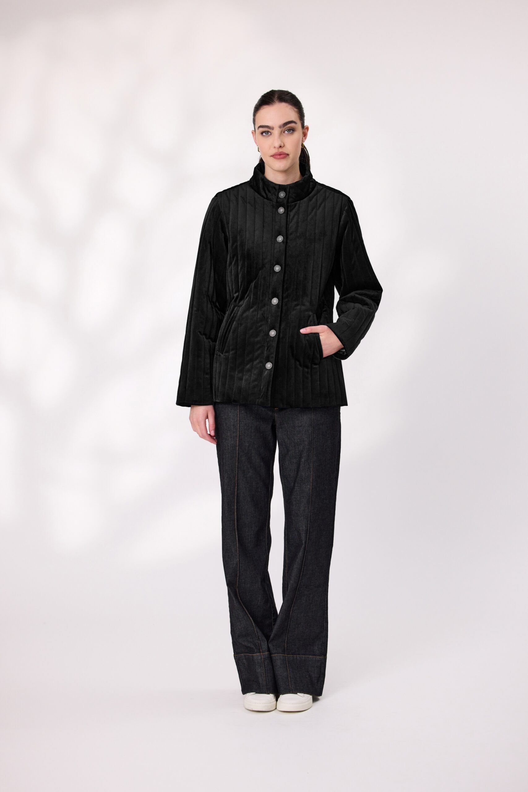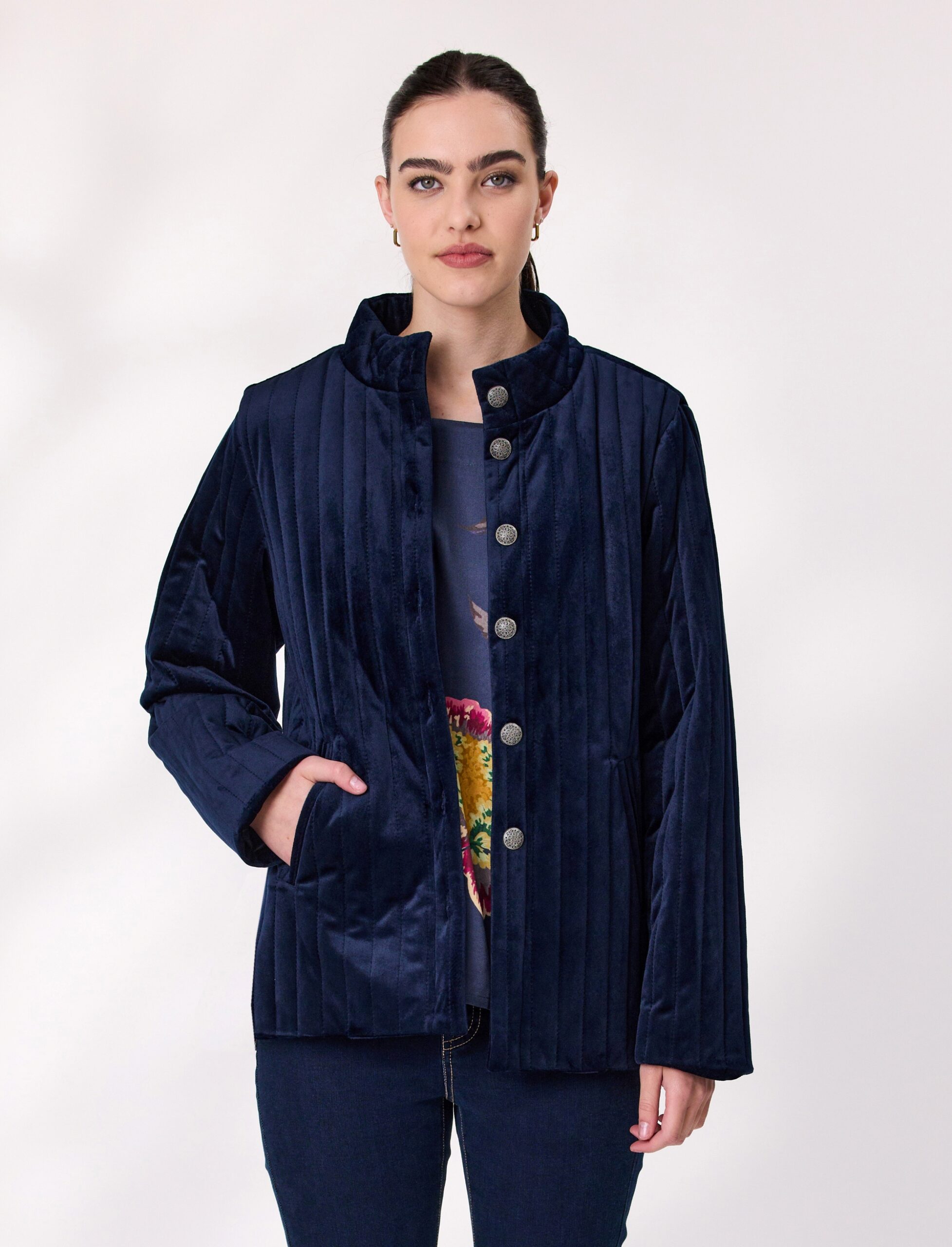 Elevate your outerwear with this quilted velvet jacket, designed for comfort and sophistication. Featuring a soft velvet finish, full lining, and a classic button-up front, this jacket is perfect for layering. The structured collar and quilted texture add timeless appeal. Ideal for cool-weather styling.