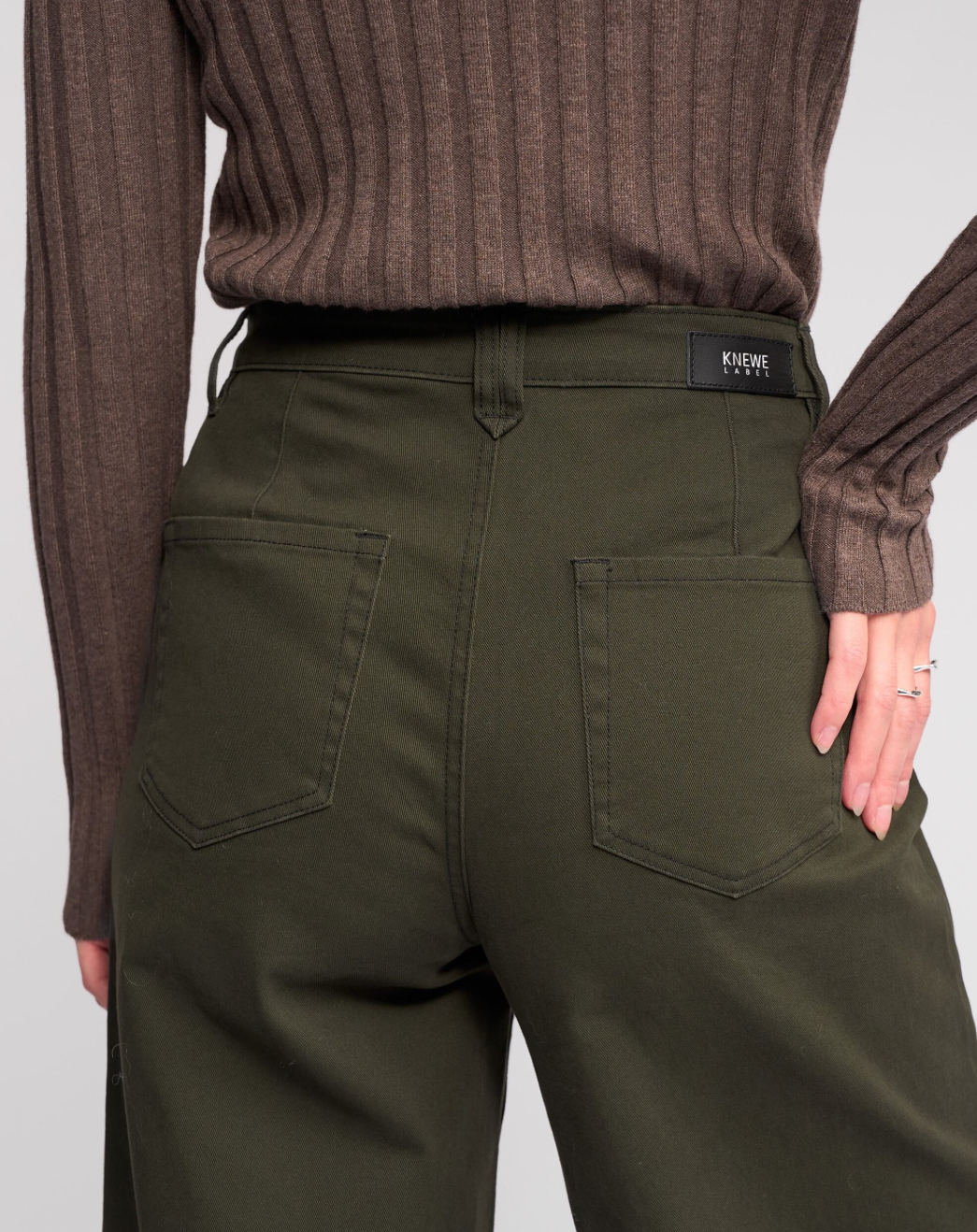 • Leather ‘KNEWE’ brand patch on wearers back right-hand side waistband