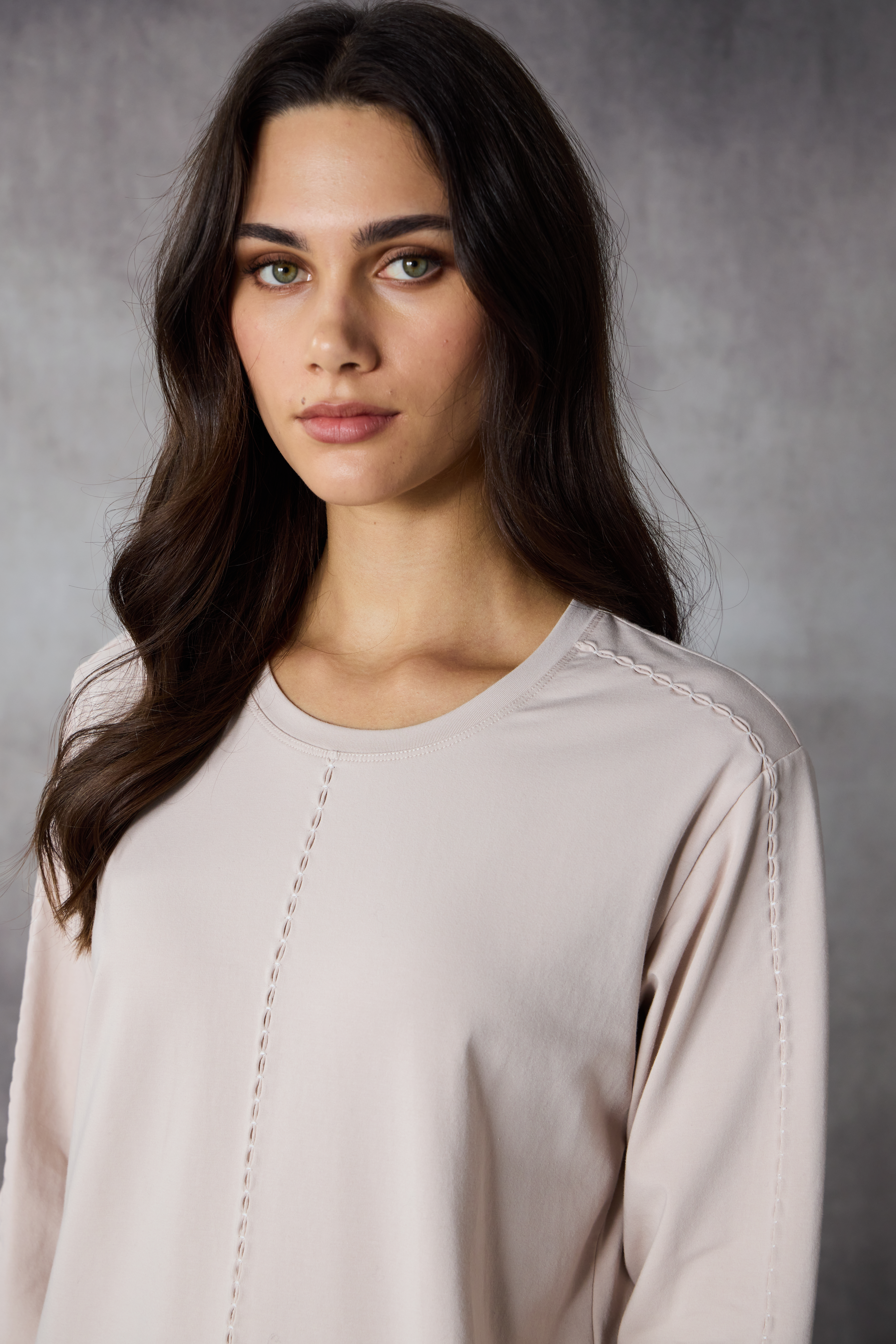 Crafted in a soft cotton blend, the Base top is a long sleeve staple with a subtle stitch detailing down the centre front, across the shoulder seam and down the sleeve. The stitch detail enhances it’s appeal, making it a versatile piece for layering with tonal colours or wearing on its own.