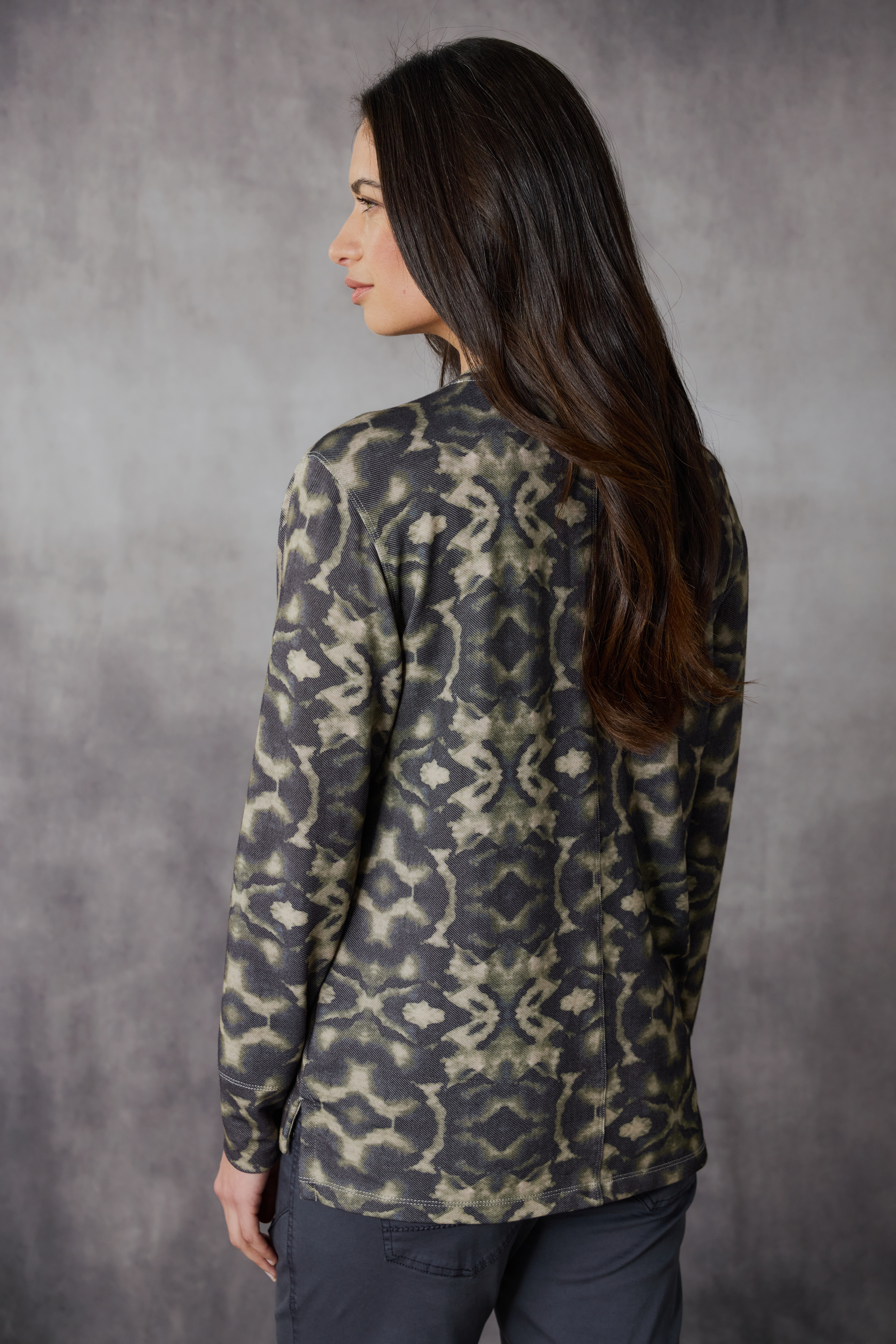 The Scope Top is a relaxed V-neckline, featuring a twin stitch detailing on the seams. The twill effect fabrication gives a unique point of difference to the print. This style is a perfect piece to wear under a tonal jacket or alone with tonal pants.