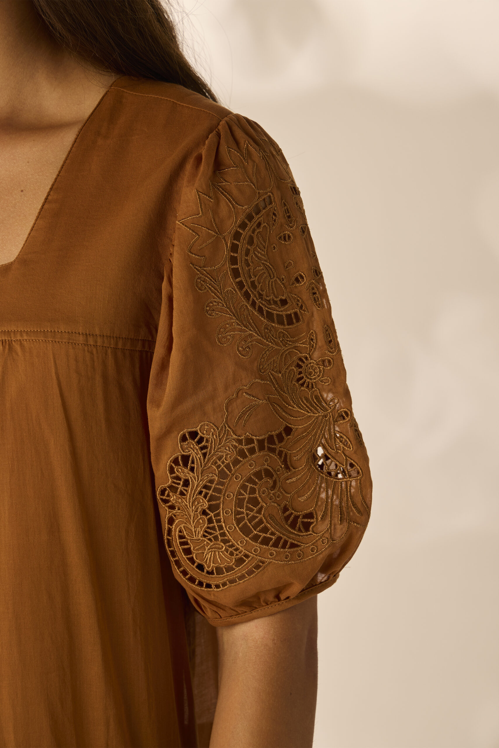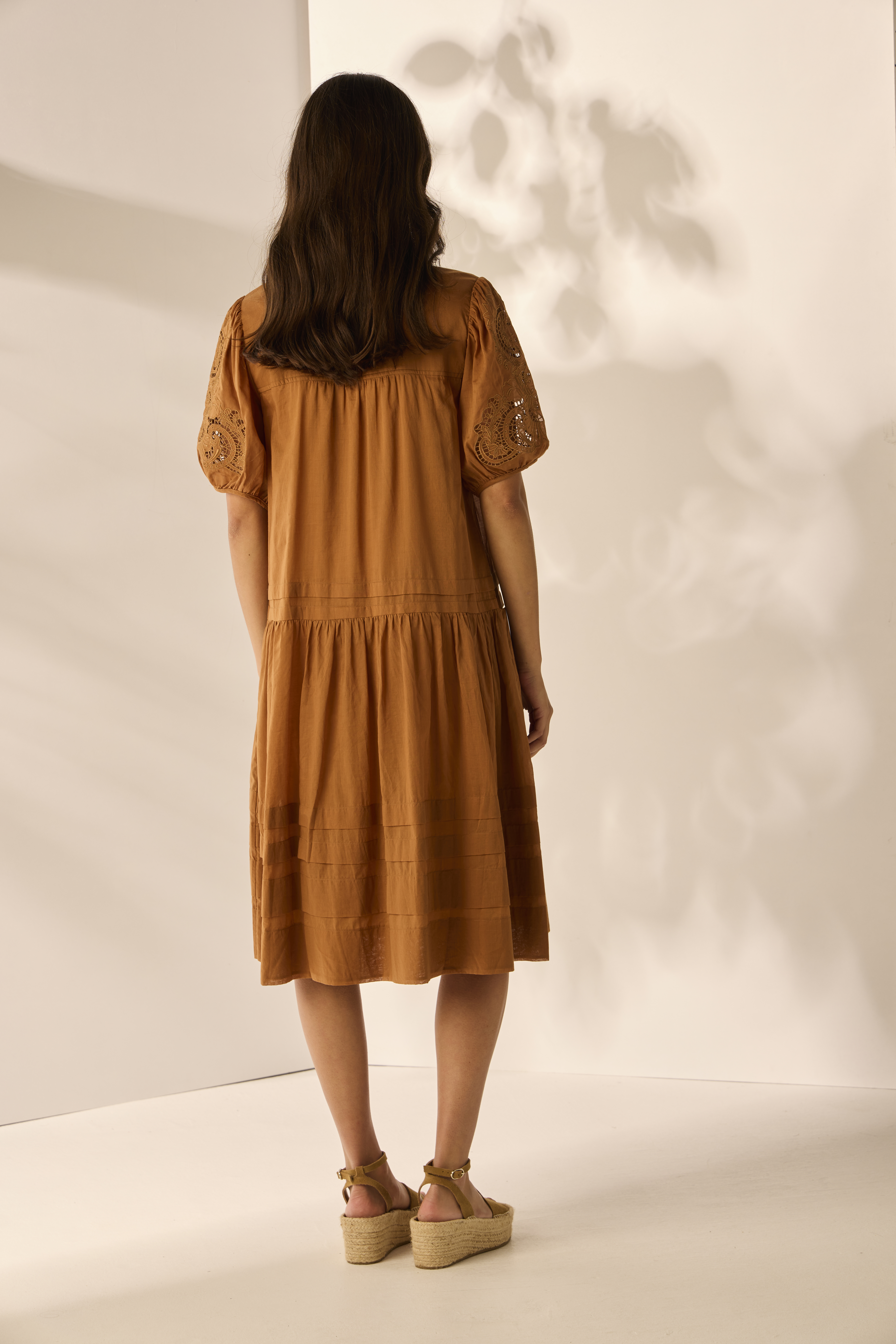 A relaxed fit dress, with a square neckline which is balanced with the tuck detailing around the waist and skirt hem. The cut-out embroidery on the sleeve adds a elegance touch to the dress. Gathered panels adds a beautiful flare to this flattering silhouette, making it the perfect summer occasion dress.