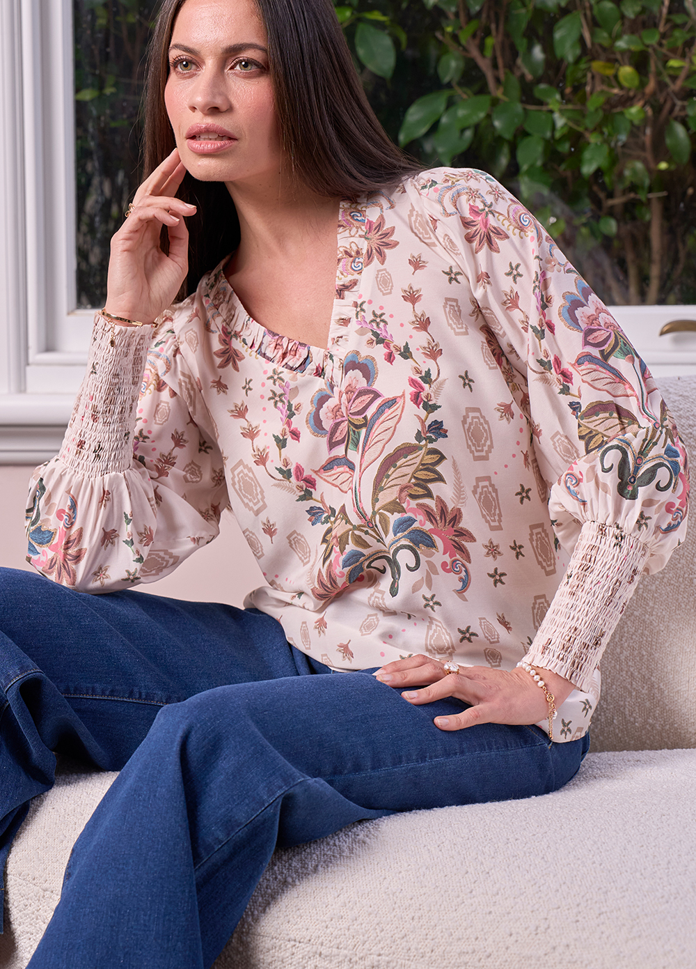 Luxurious blouse in a silk blend, with a ruched V-neckline, with blouson sleeves which gather into deep shirred elasticated cuffs for a soft, voluminous finish.