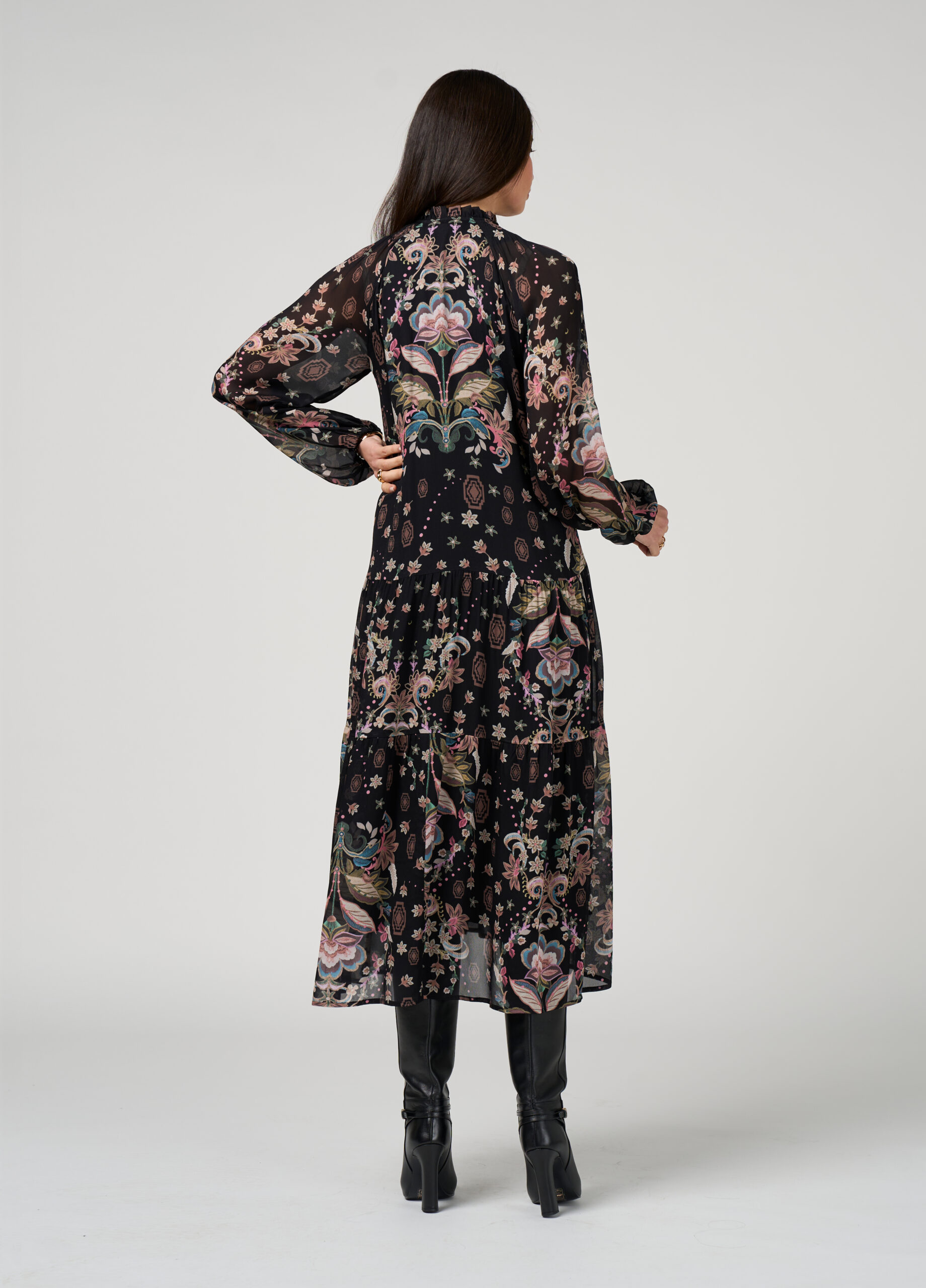 Sheer tiered midi dress featuring a ruffled neckline and a deep front placket, with drawstring detailing at the waist for adjustable shaping. Blouson sleeves with softly shirred elastic on the shoulders with elasticated cuffs. Fully lined.
