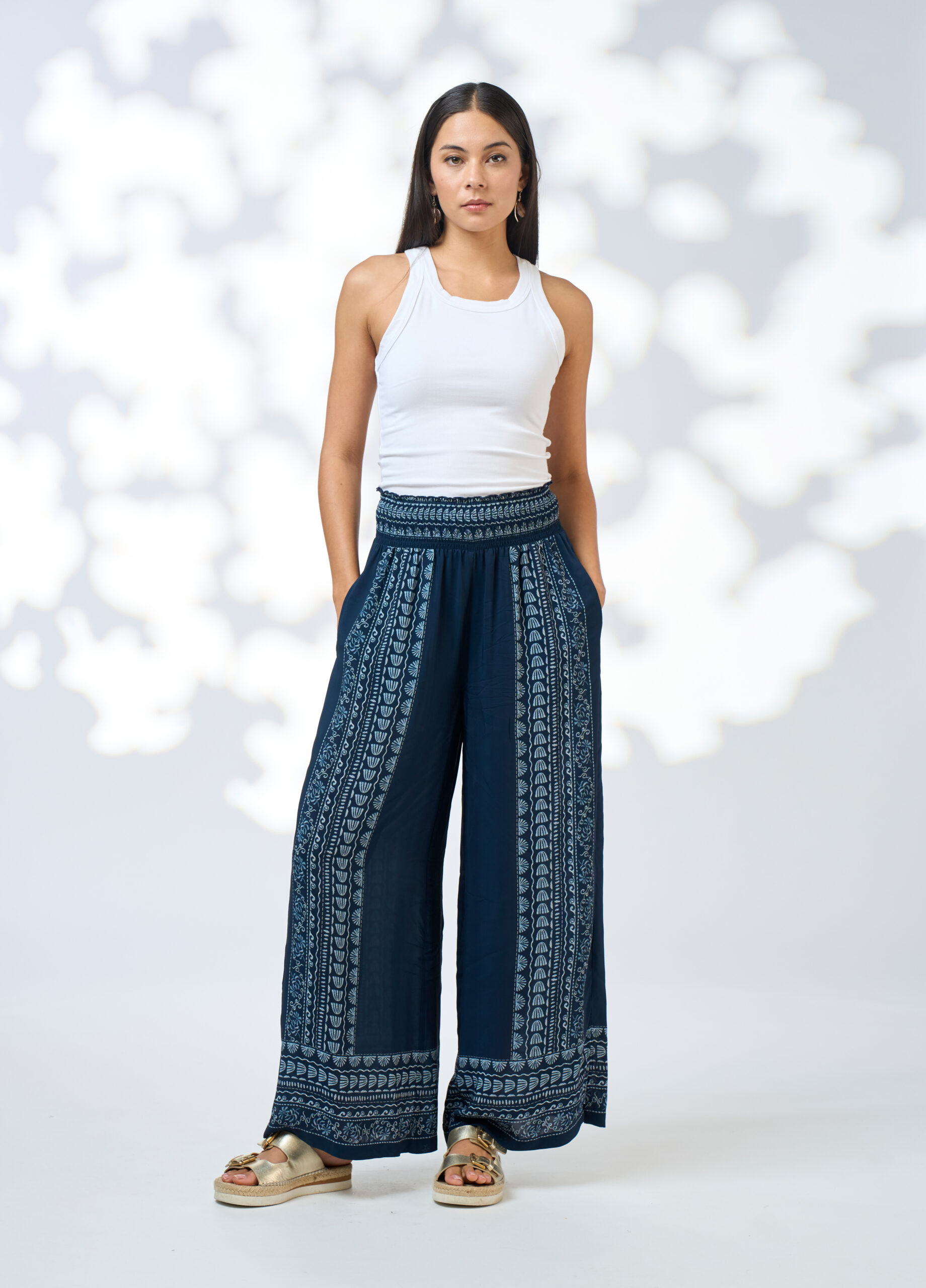 Silky wide leg palazzo pant with a deep shirred waistband and forward side seams for a flattering fit. Functional pockets.