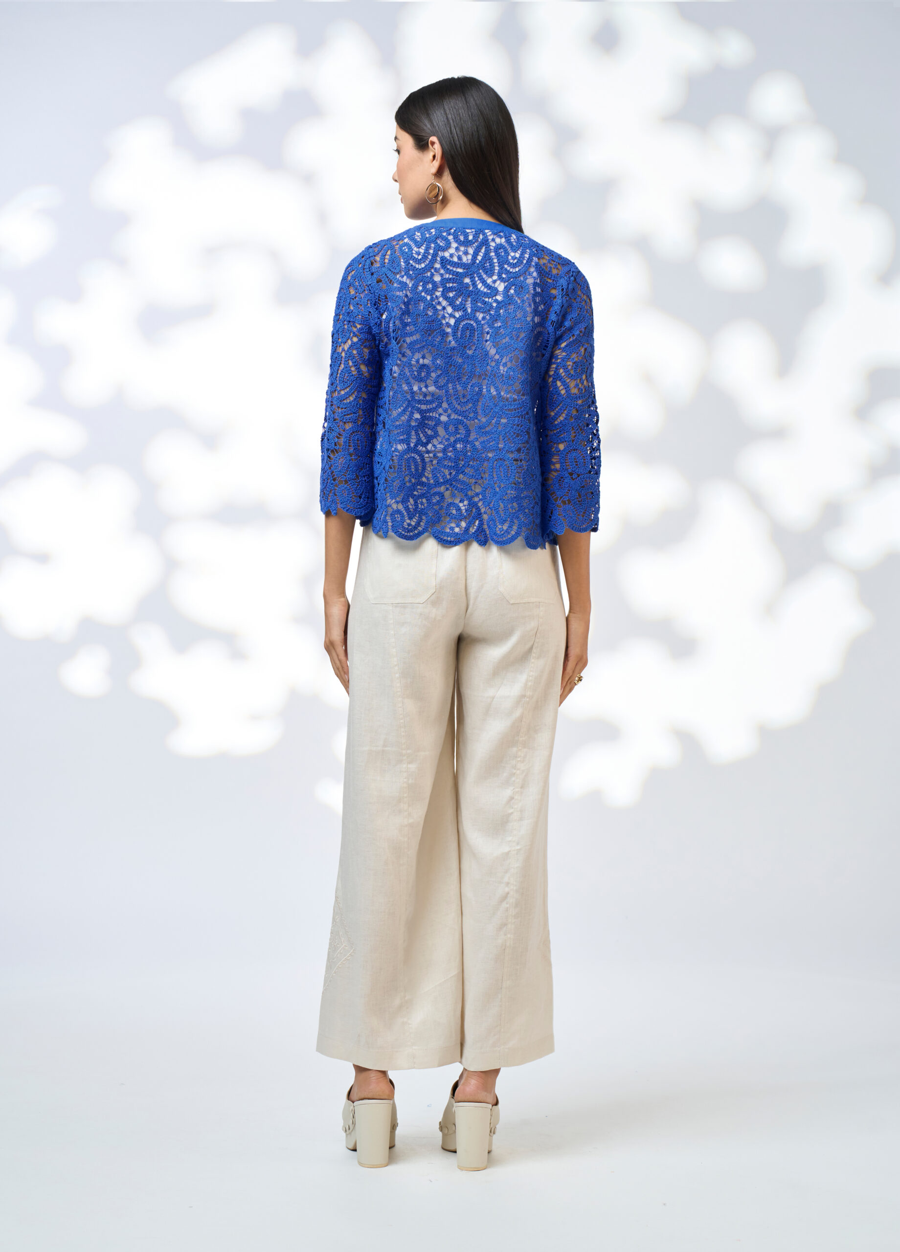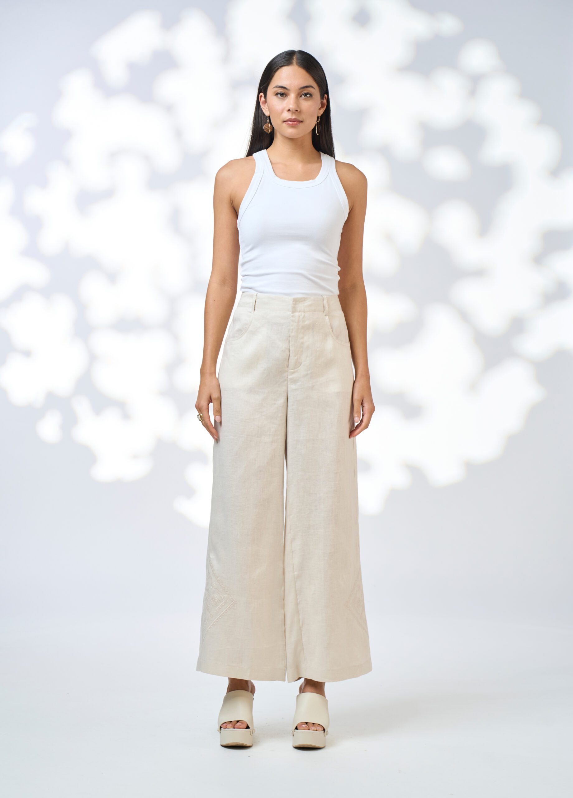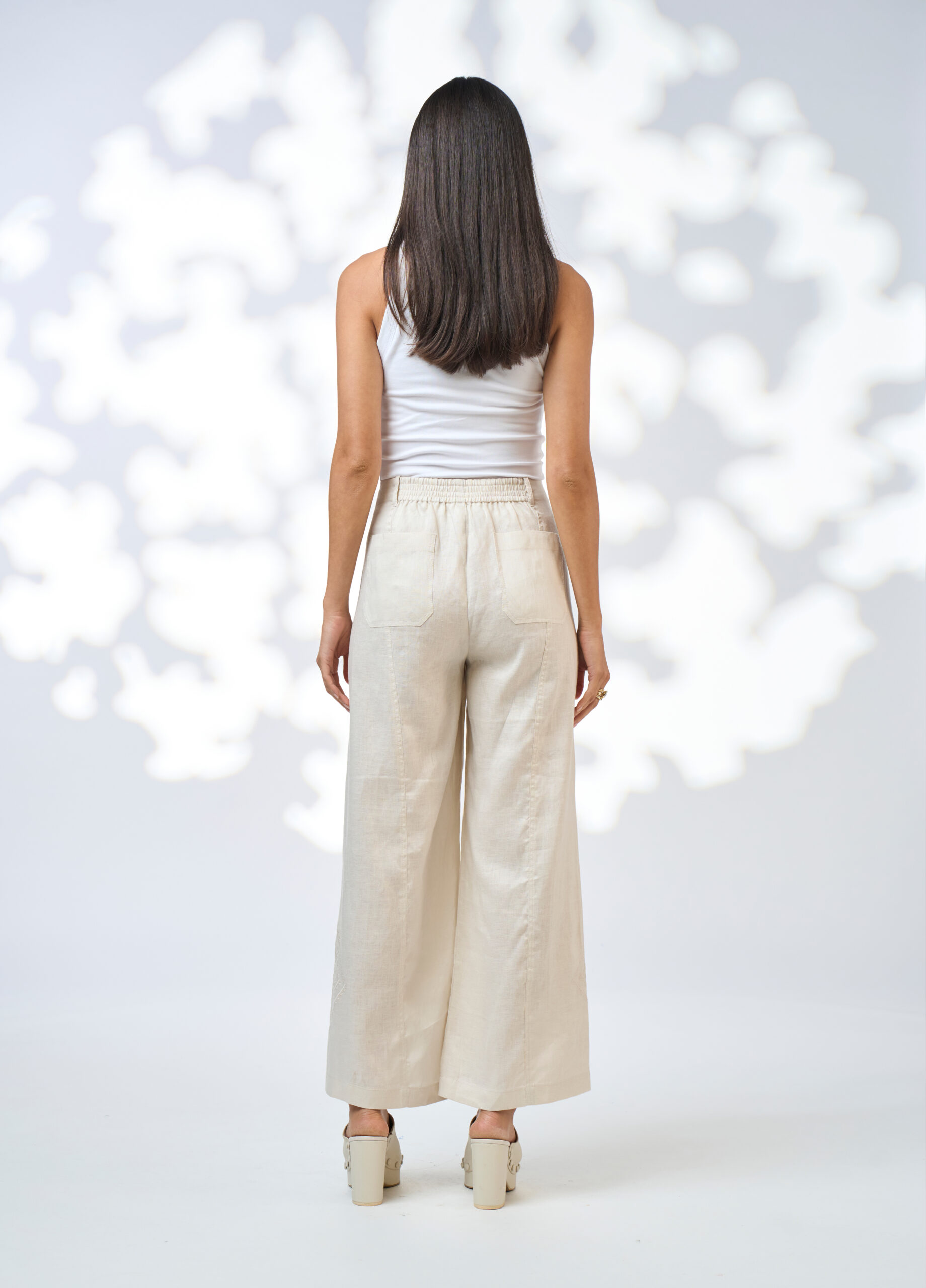Wide leg, linen pant with a forward front seam and back elastic panel for a flattering fit. Features embroidery detailing down side of leg.
