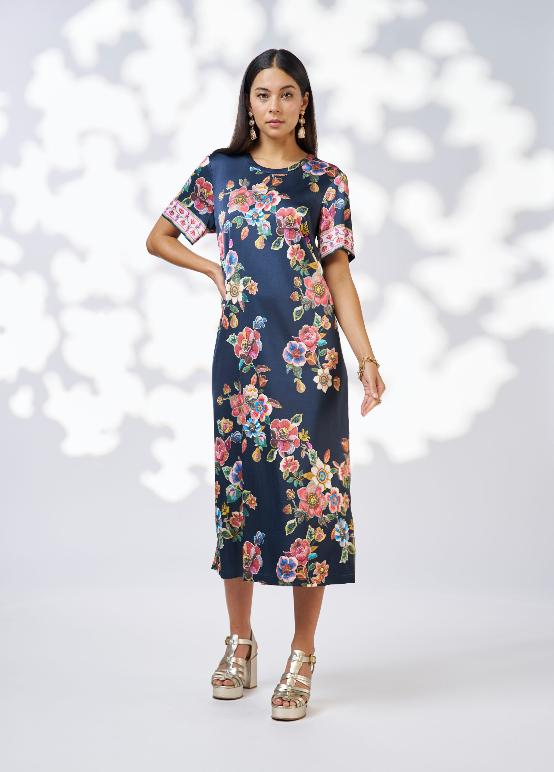 A luxe t-shirt style dress, in a silky printed stretch viscose. With bust darts, back neck opening and side splits to elevate.