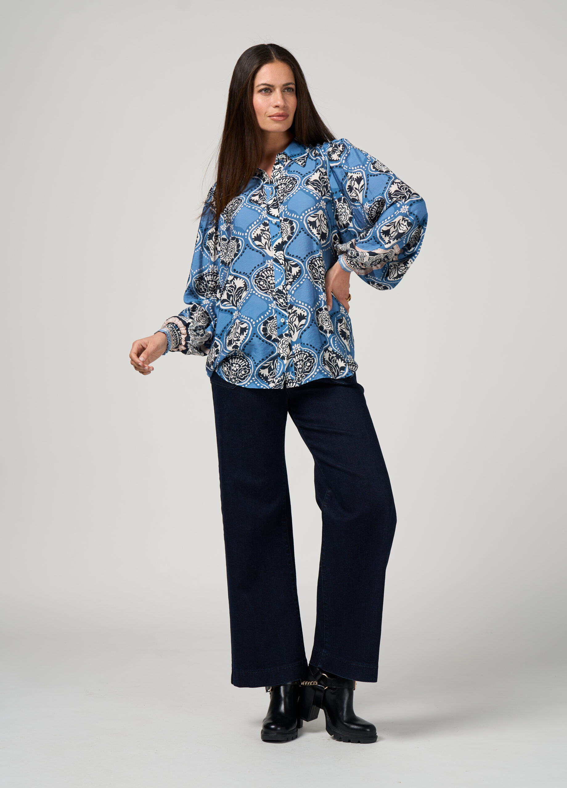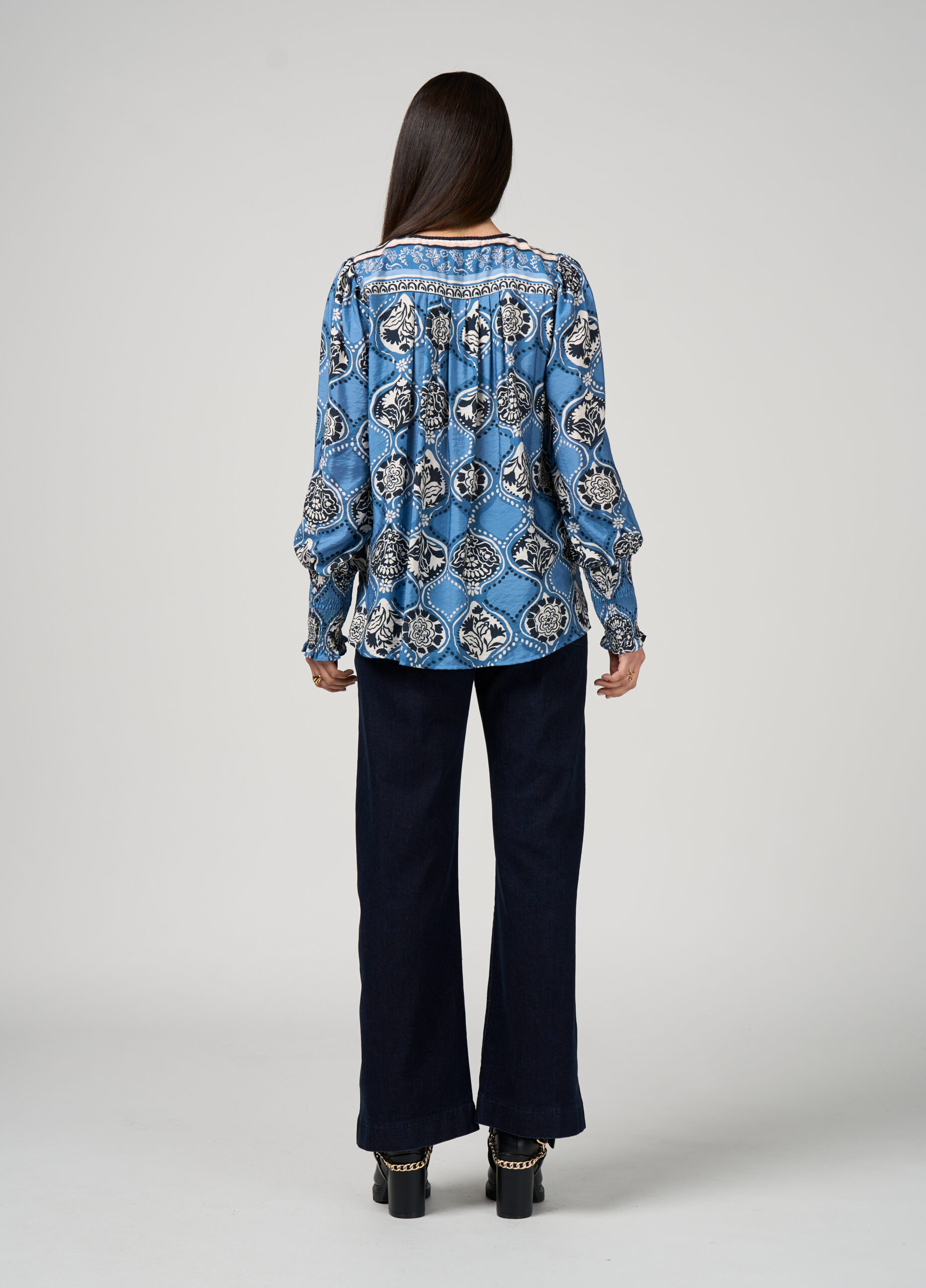 This floaty V–neck blouse features an indigo cotton trim at the neckline that extends into a soft tie for a touch of artisanal detail. Finished with deep shirred elastic cuffs, it brings effortless elegance and ease to everyday dressing.