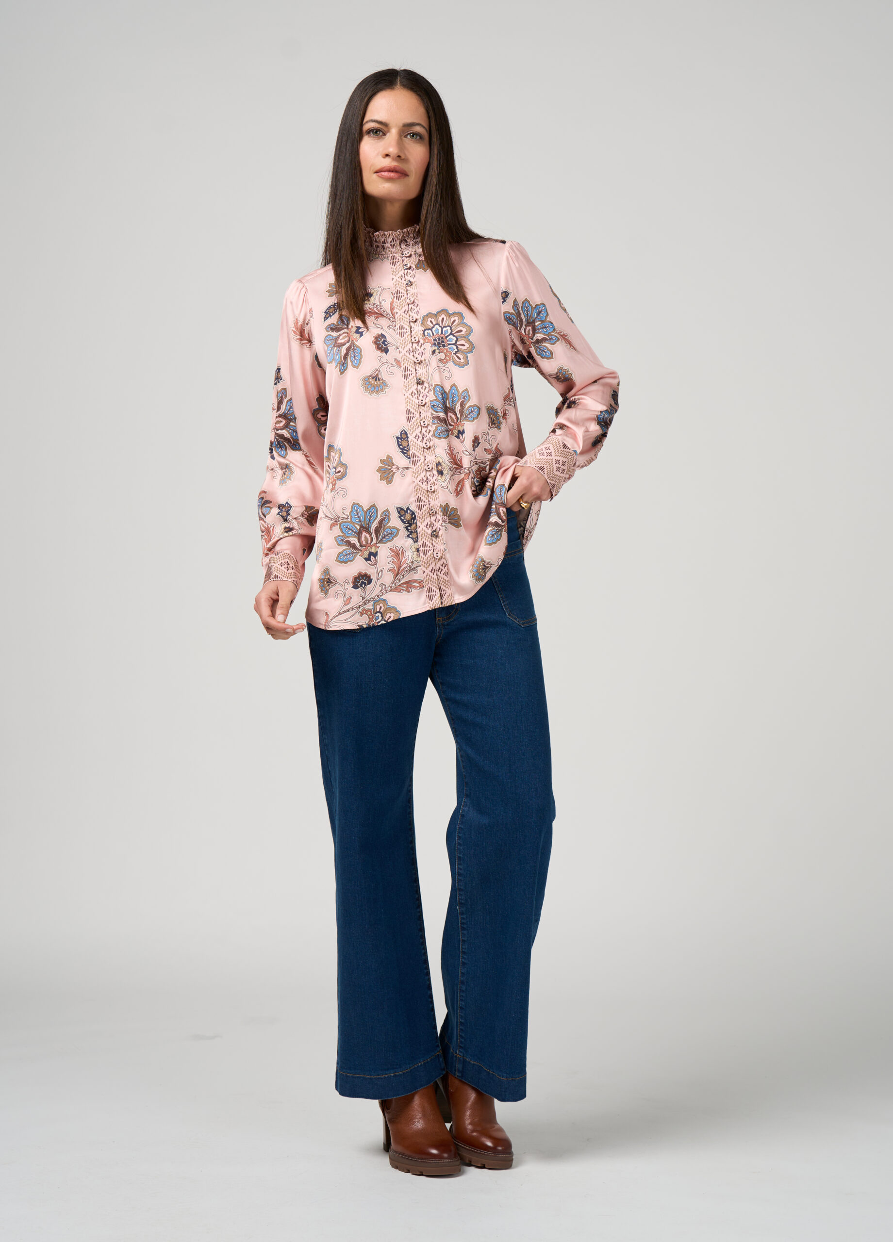 Sateen blouse with a shirred collar, and a button and loop front placket, with buttoned cuffs. Featuring contrast print detailing on the collar, placket, and cuffs.