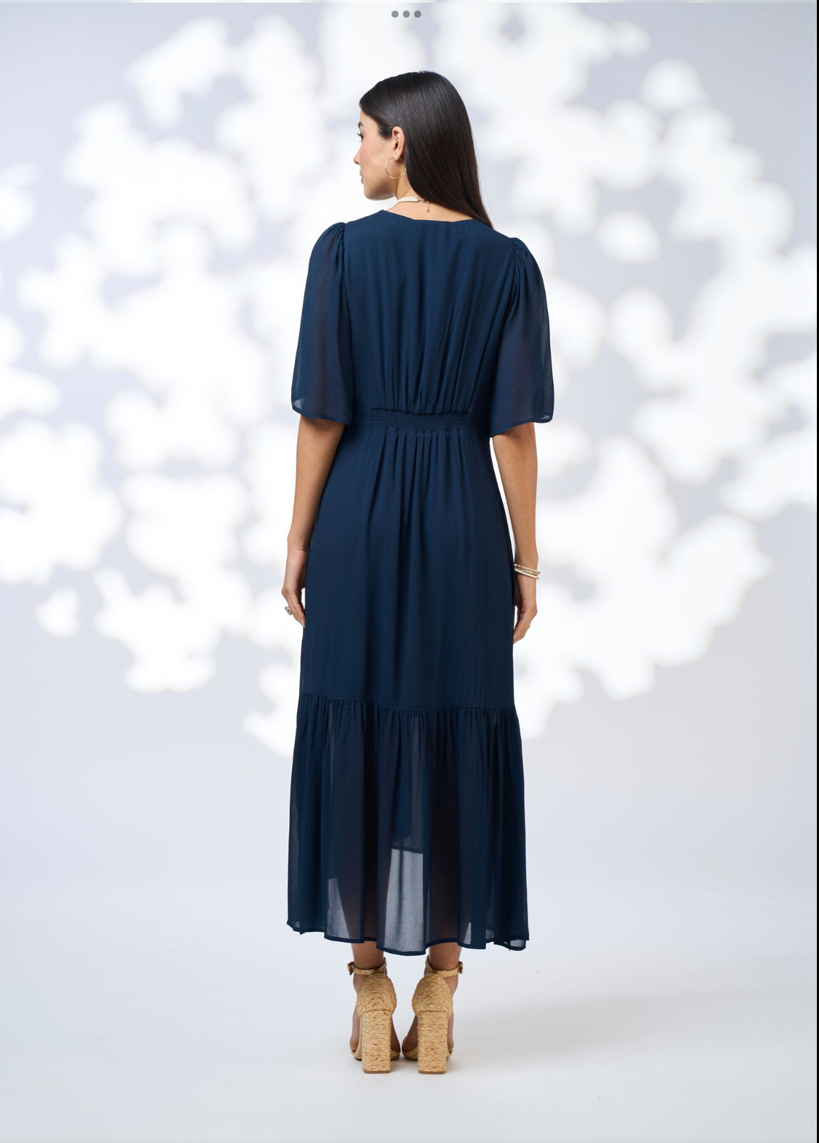 Floaty dress with a flattering V-neckline and shirred waist panels. Featuring delicate petal wrap sleeves and a high-low hem panel with side splits. Fully lined.