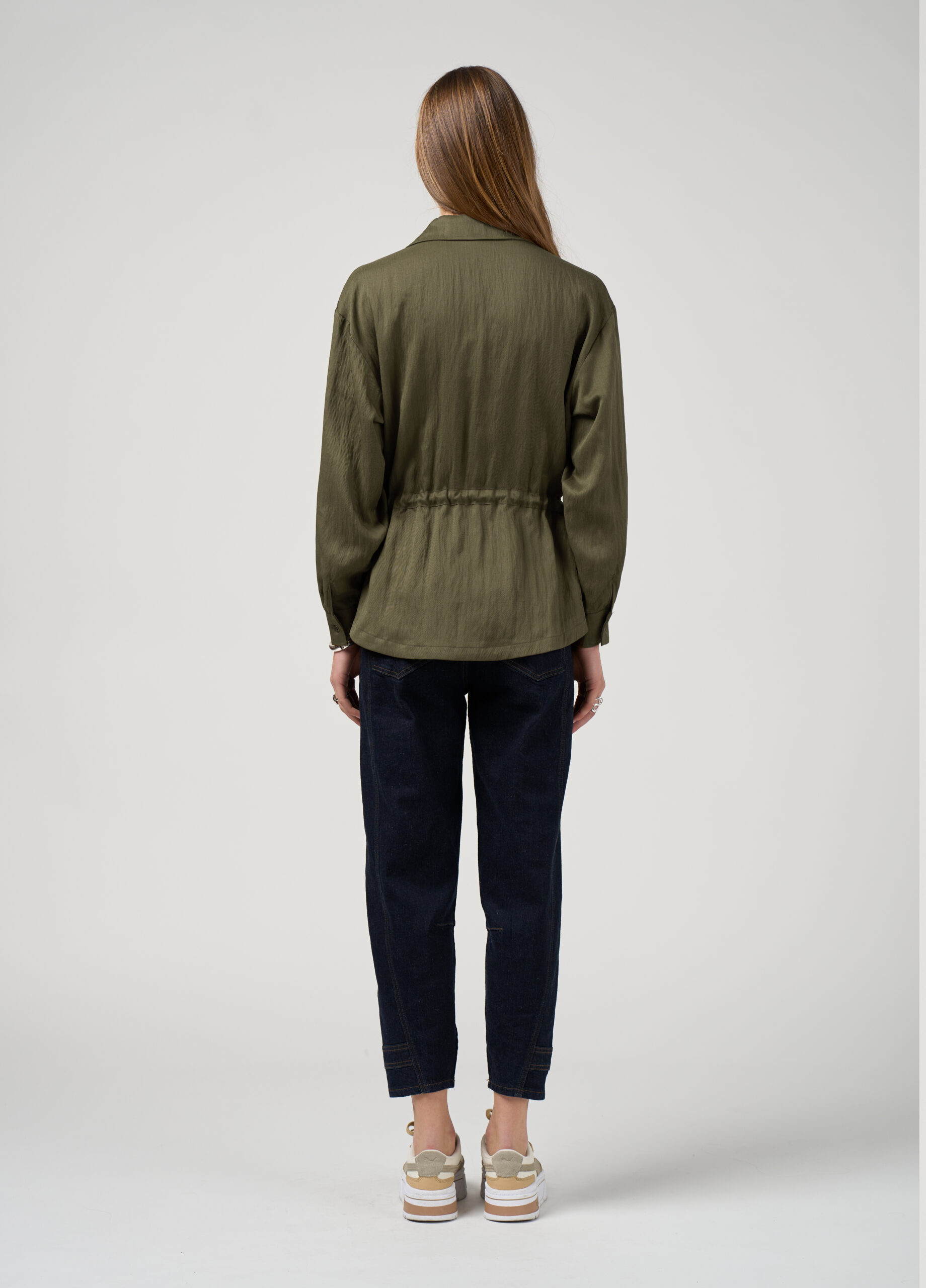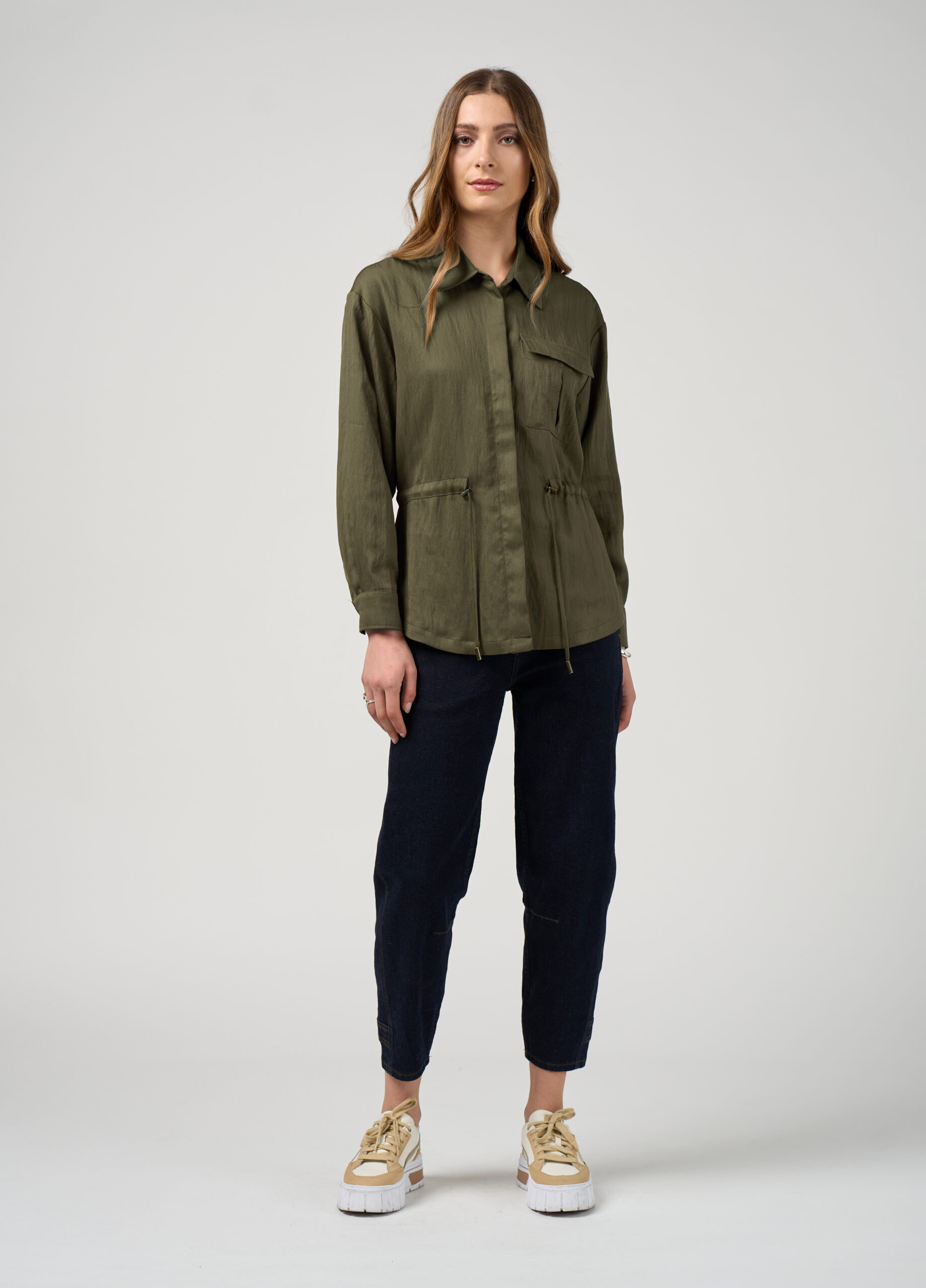 Relaxed fitting jacket with a dropped shoulder, featuring a drawstring waist with fine metal toggles to fasten, with a rounded hem and side splits for ease of fit and movement.