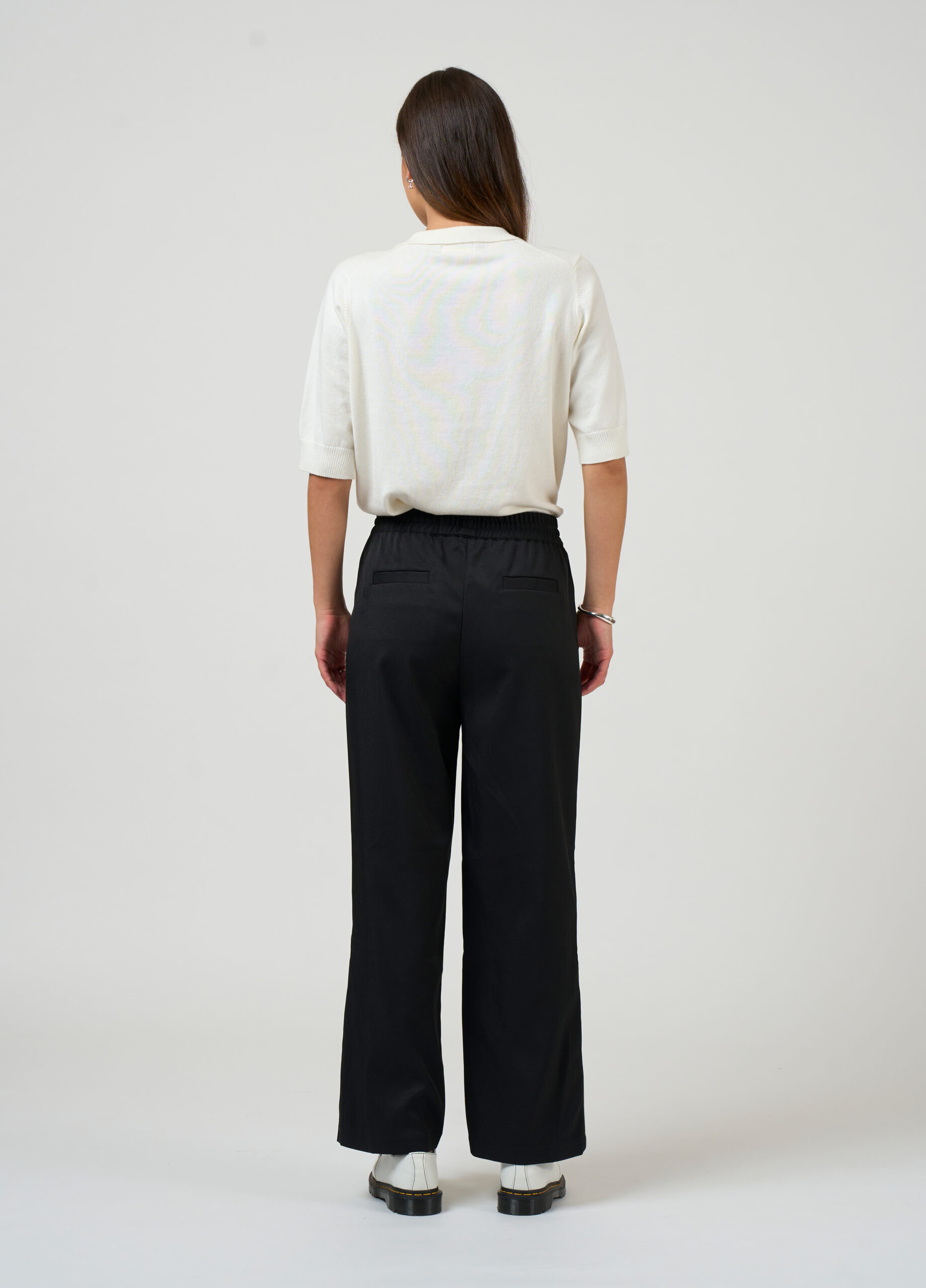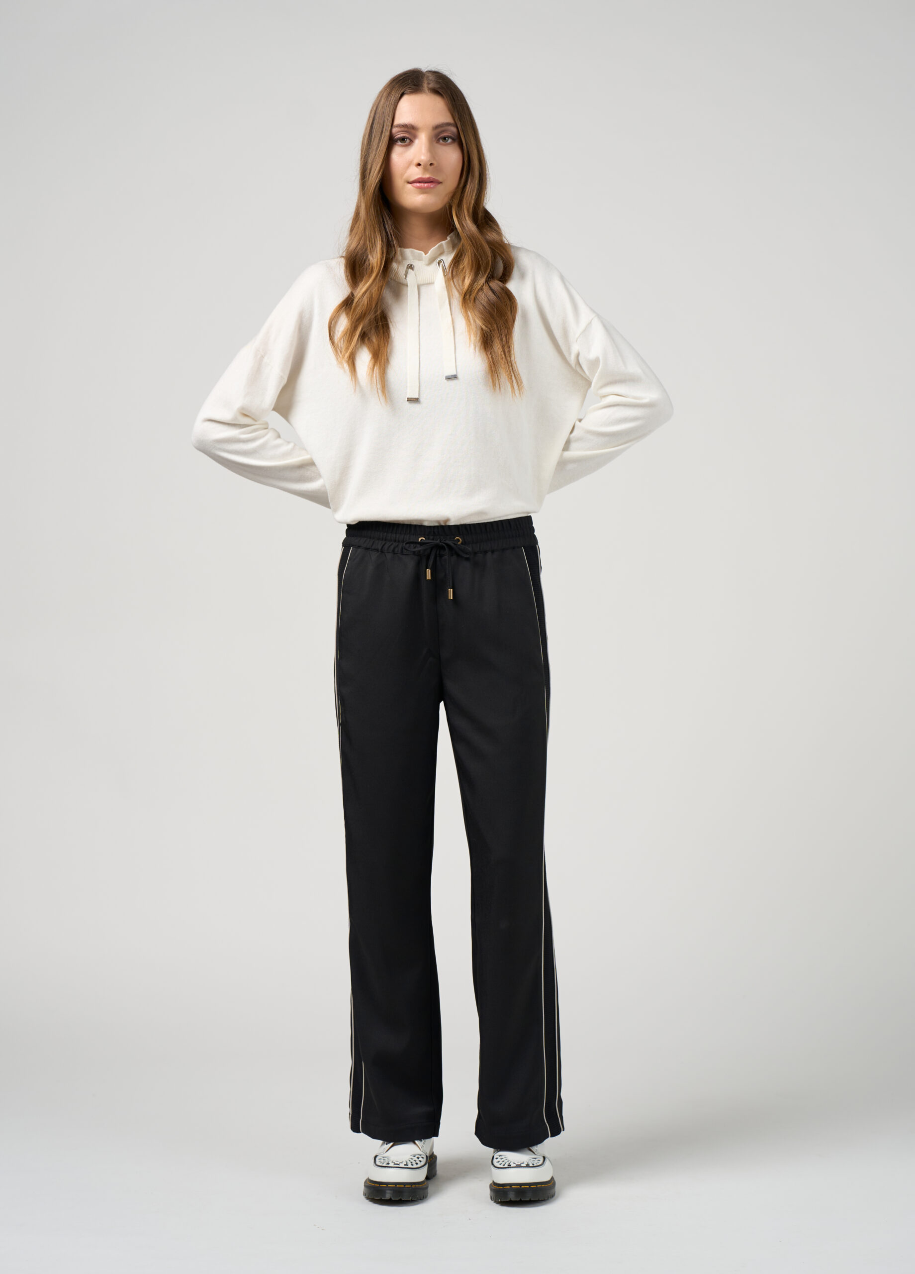 Straight leg pant with rib side panels and fine contrast insert piping, with elasticated drawstring waist and flattering forward seams with splits at the hem.